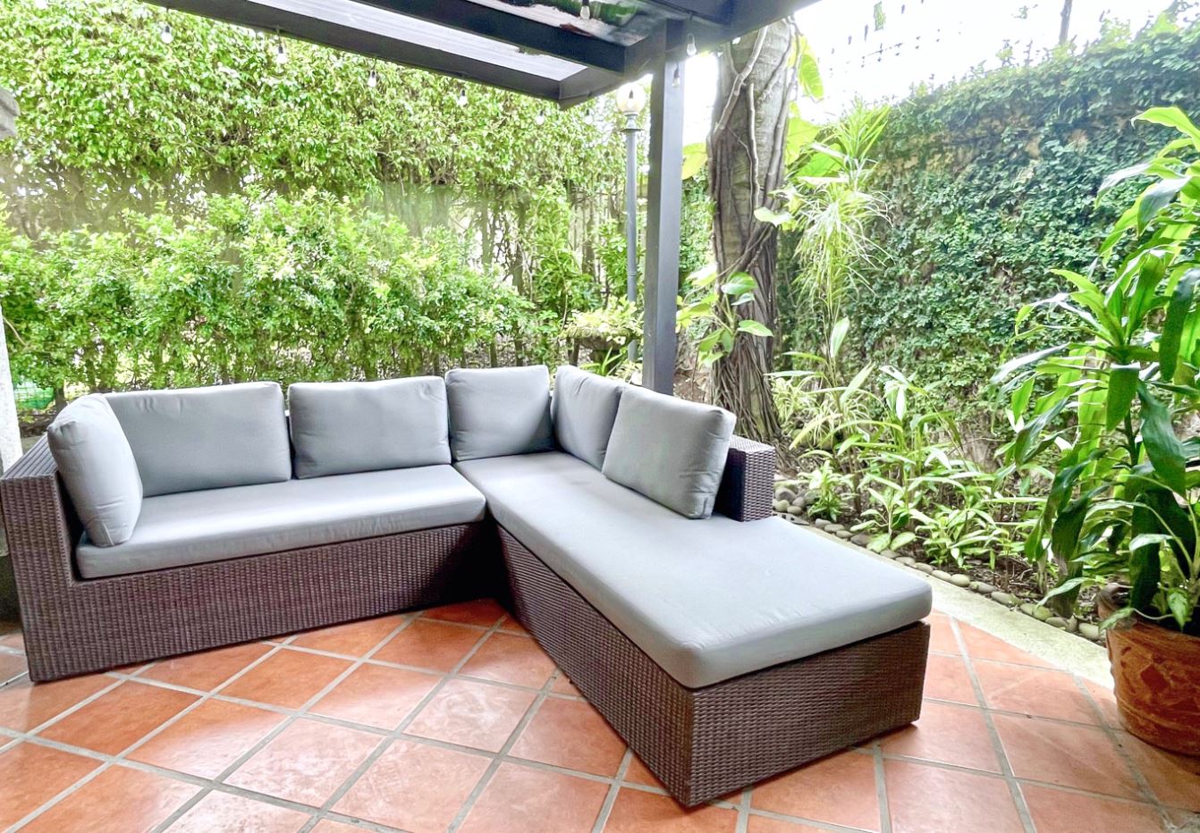 Spacious covered patio with a translucent roof, allowing abundant natural light—perfect for entertaining, relaxing, or spending quality time with family and friends