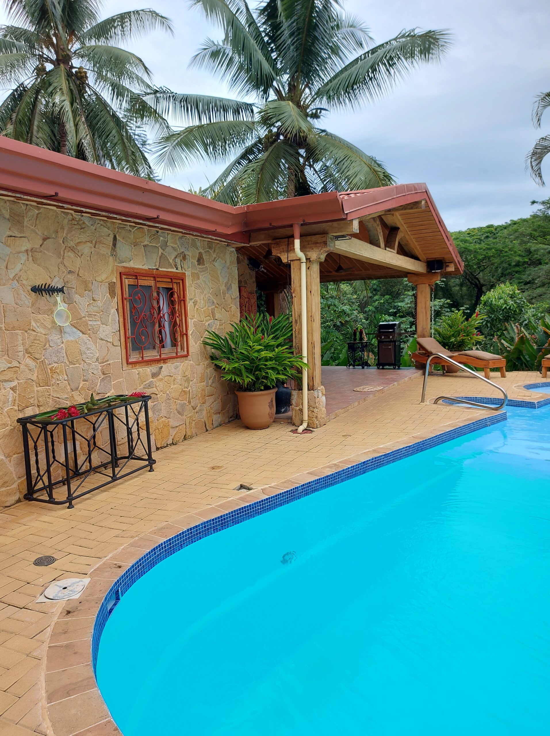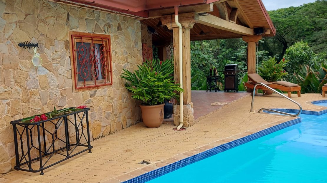 The home has three bedrooms and two bathrooms and sleeps eight people. It has maintenance-free sandstone exterior walls, Cenisero tongue-and-groove wood ceilings, artistically carved solid wooden doors, a curving pool deck with two more decks below, one with a gazebo, imported Spanish tile, and unusual Guanacaste hardwood kitchen cabinets.