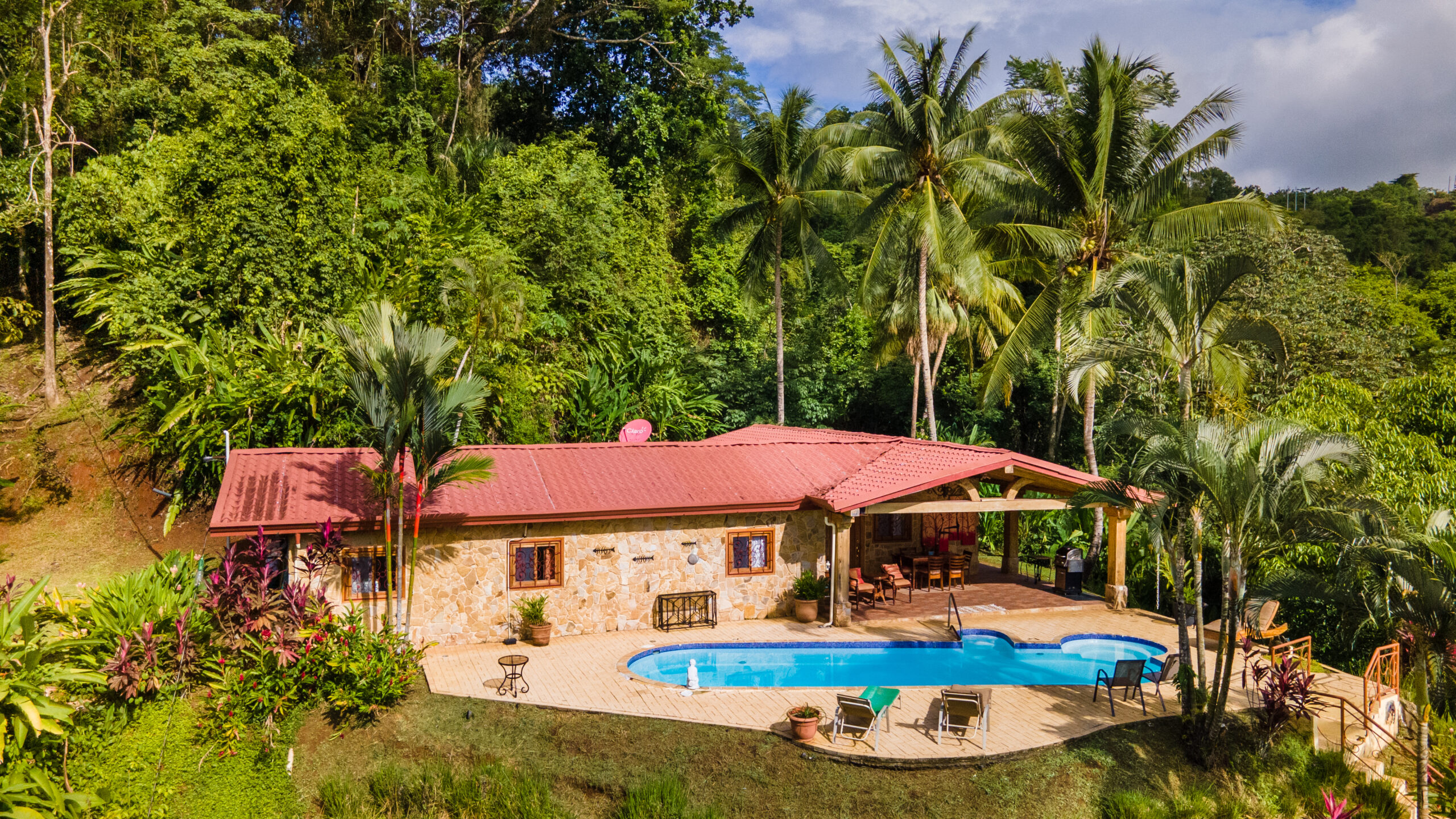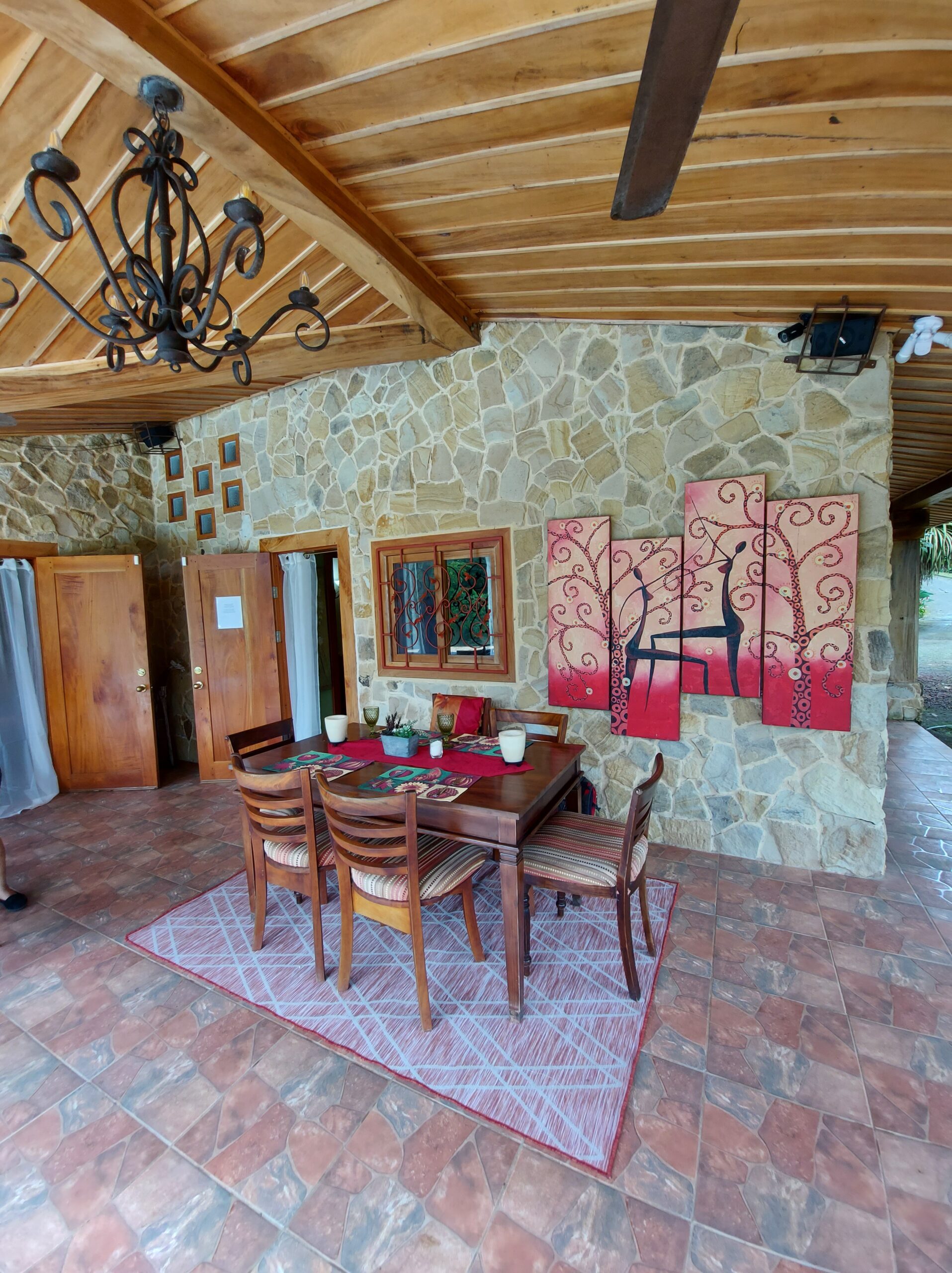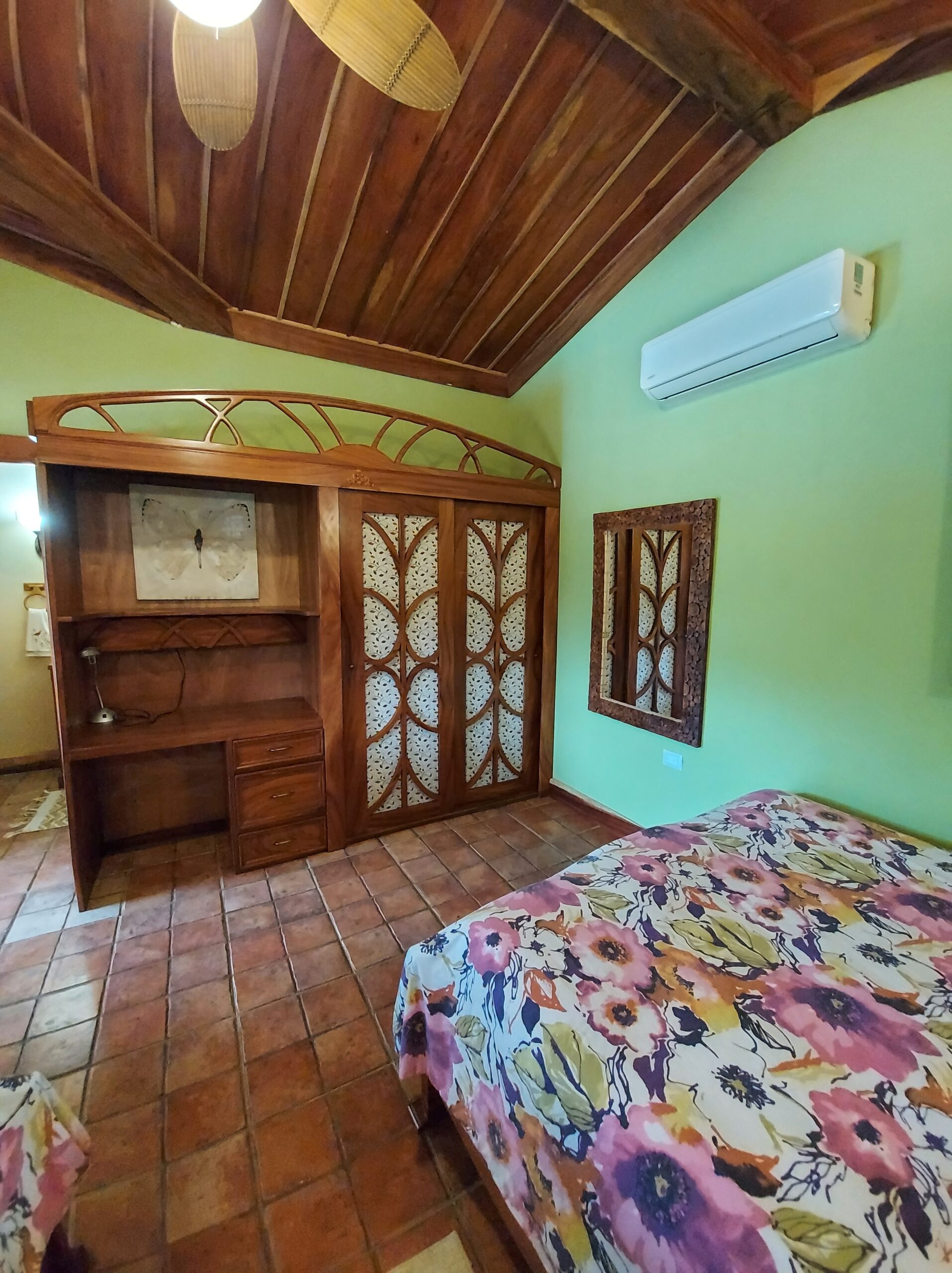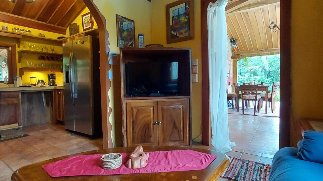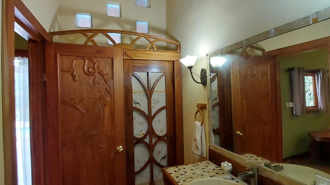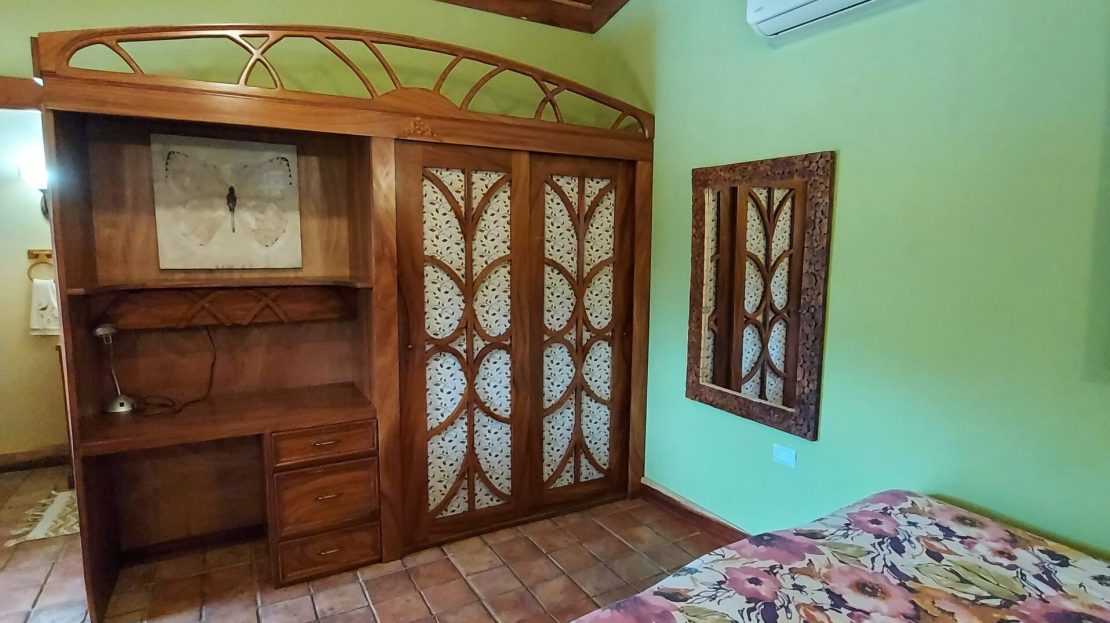 La casa tiene tres dormitorios y dos baños, y acomoda a ocho personas. Cuenta con paredes exteriores de arenisca de bajo mantenimiento, techos de madera de cenicero machihembrado, puertas sólidas de madera talladas artísticamente, una terraza curva junto a la piscina con dos terrazas más abajo, una con un gazebo, azulejos importados de España y inusuales gabinetes de cocina de madera de Guanacaste.