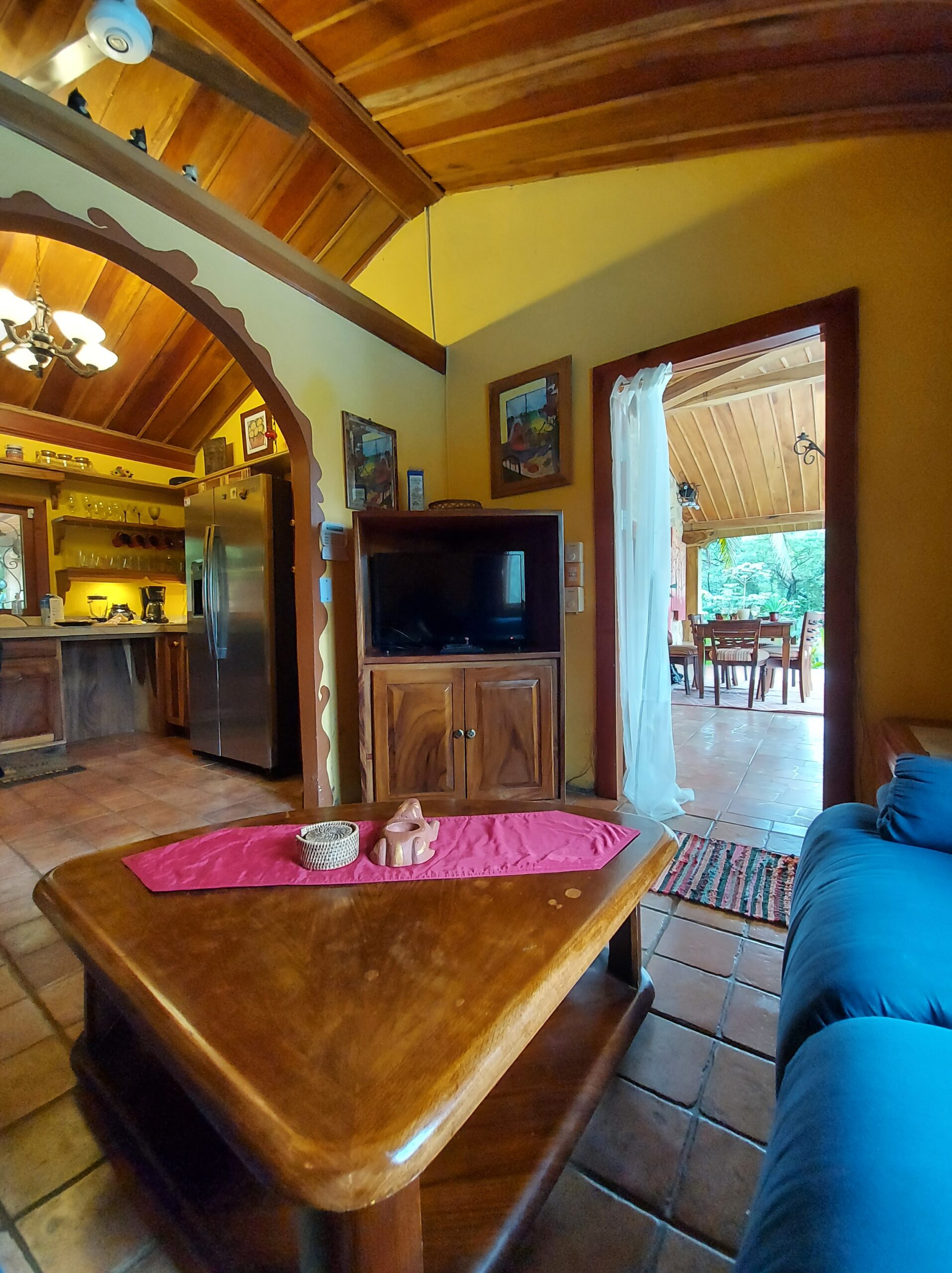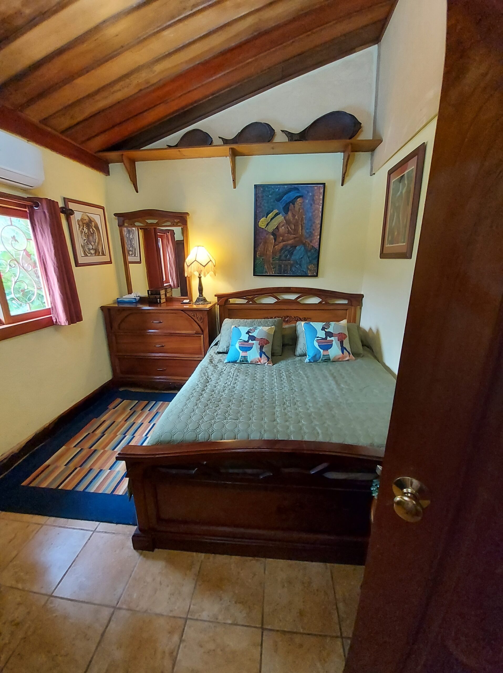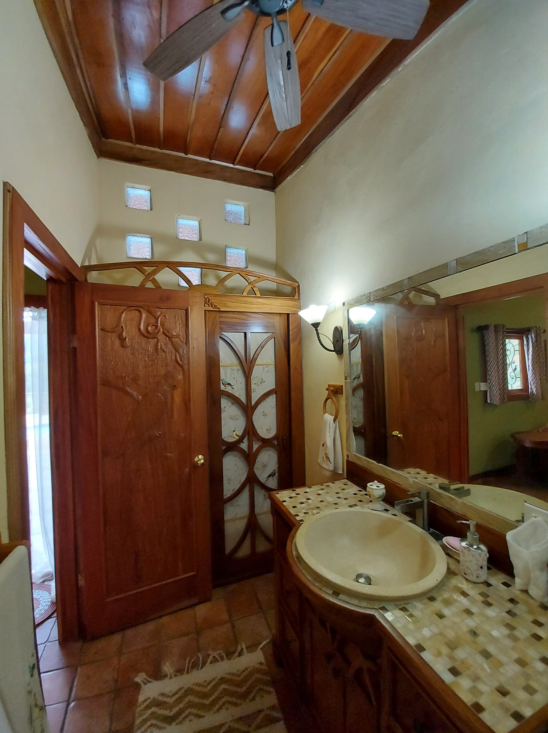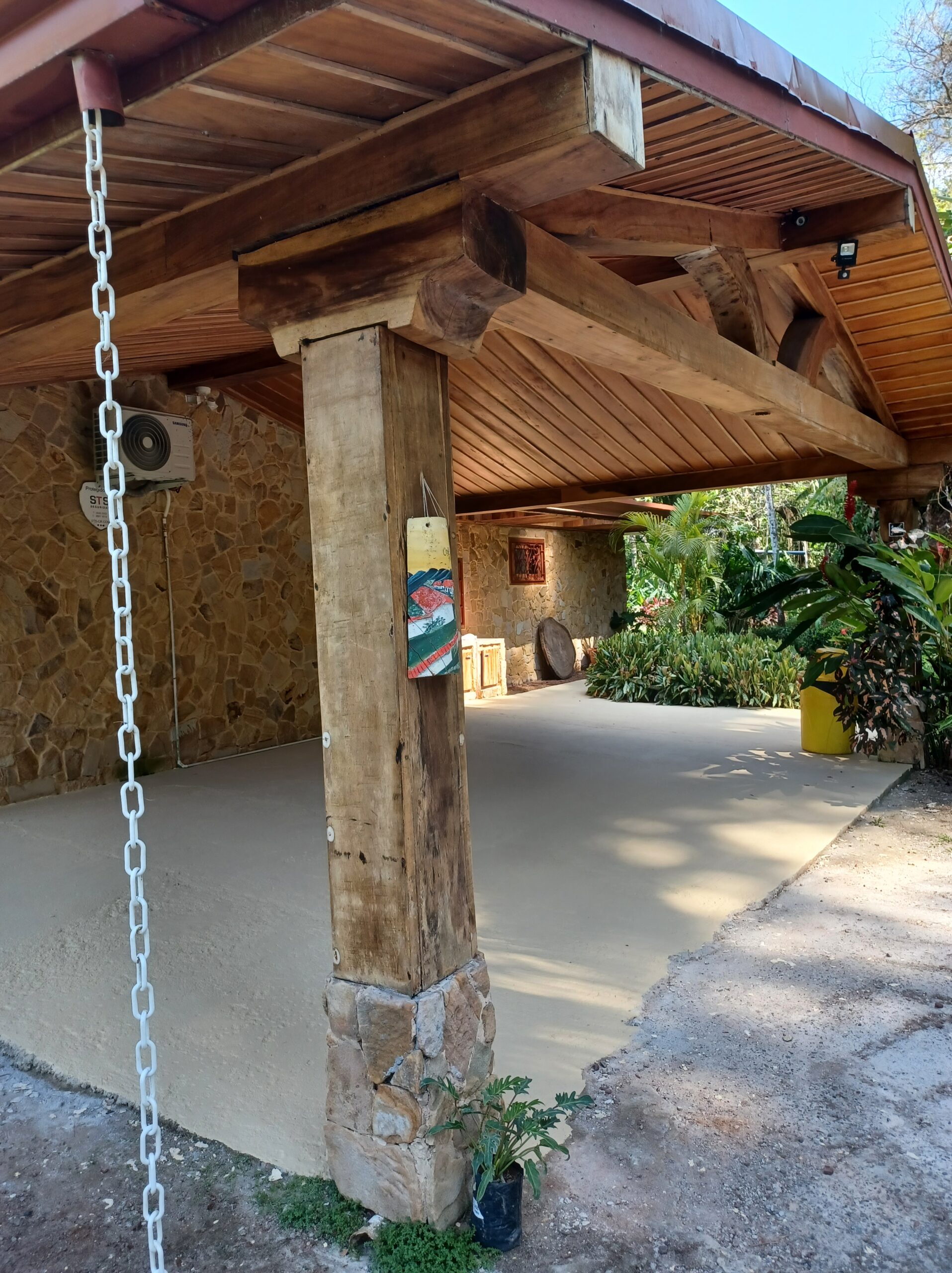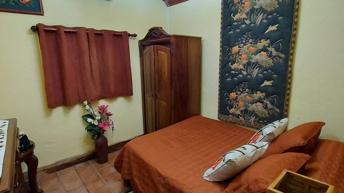 La casa tiene tres dormitorios y dos baños, y acomoda a ocho personas. Cuenta con paredes exteriores de arenisca de bajo mantenimiento, techos de madera de cenicero machihembrado, puertas sólidas de madera talladas artísticamente, una terraza curva junto a la piscina con dos terrazas más abajo, una con un gazebo, azulejos importados de España y inusuales gabinetes de cocina de madera de Guanacaste.
