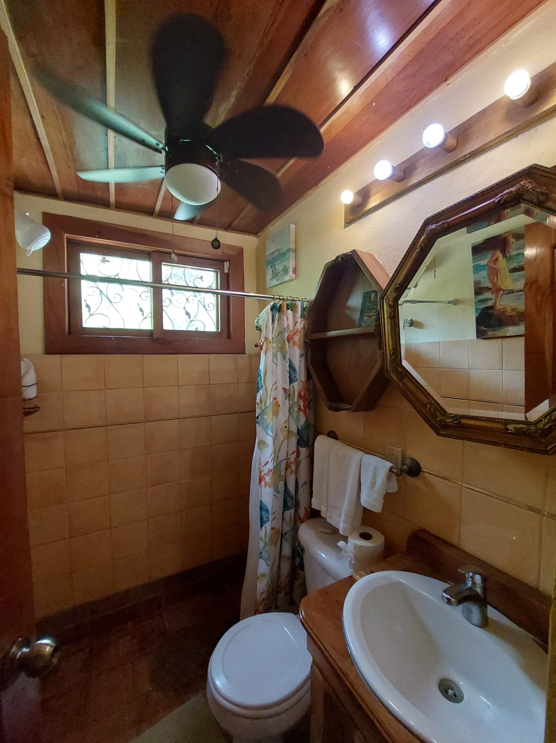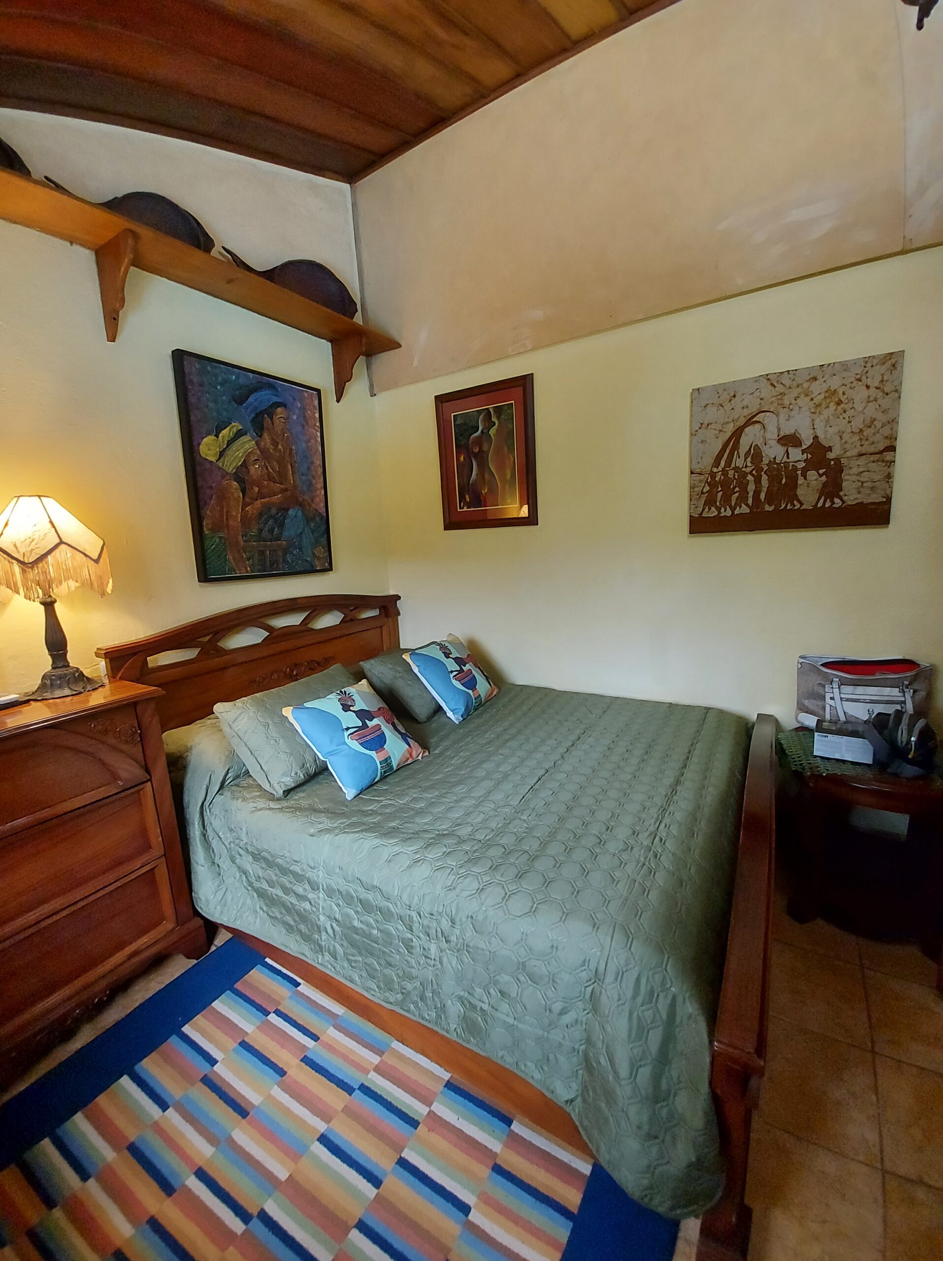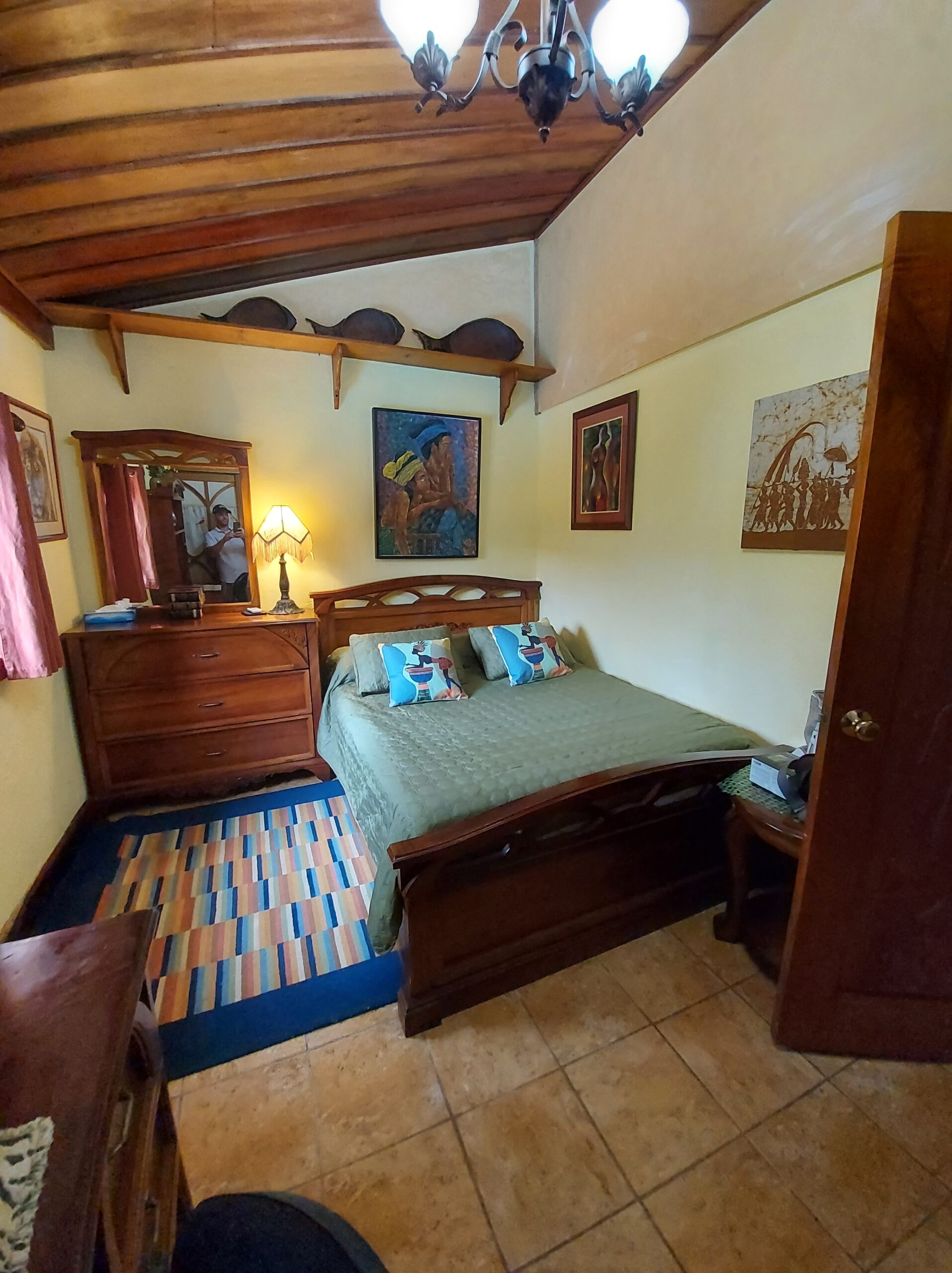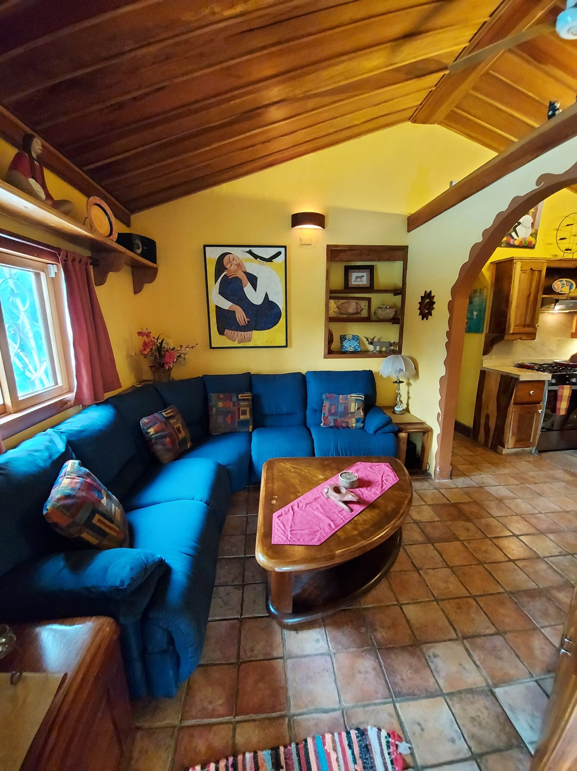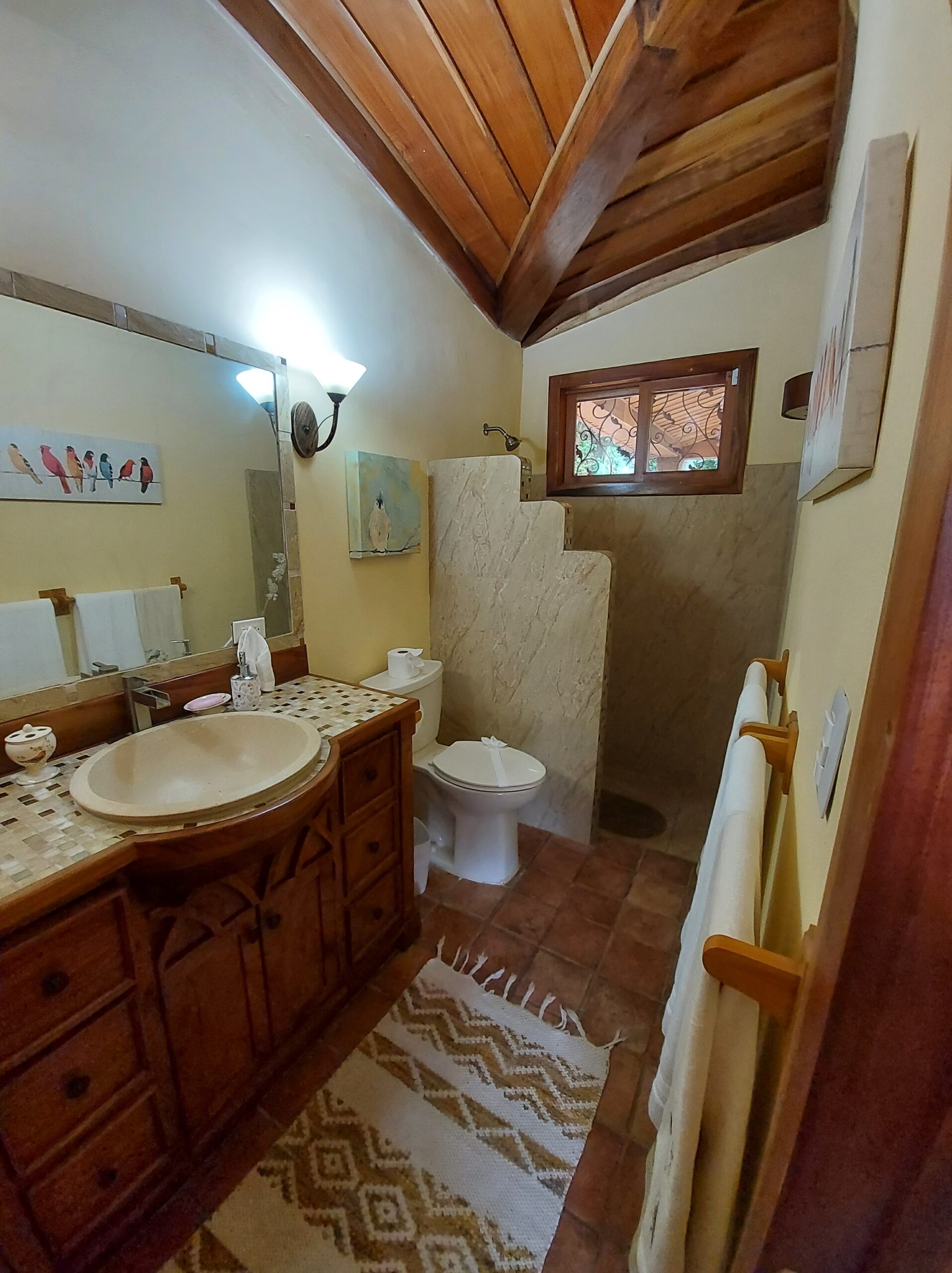 La casa tiene tres dormitorios y dos baños, y acomoda a ocho personas. Cuenta con paredes exteriores de arenisca de bajo mantenimiento, techos de madera de cenicero machihembrado, puertas sólidas de madera talladas artísticamente, una terraza curva junto a la piscina con dos terrazas más abajo, una con un gazebo, azulejos importados de España y inusuales gabinetes de cocina de madera de Guanacaste.