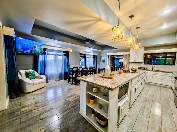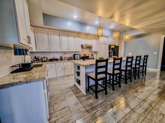 At the heart of the home lies an extraordinary gourmet kitchen, designed to inspire culinary creativity. An oversized island and breakfast bar create a natural gathering space, while high-end appliances and a thoughtful layout accommodate even the most discerning chef. The home’s open-concept design ensures a graceful flow between living, dining, and outdoor spaces.