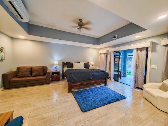 The main house features three beautifully appointed bedrooms and three bathrooms, each air-conditioned and finished with elegant, spa-like details. The principal suite enjoys direct access to the pool, creating an exceptional indoor–outdoor connection. A fourth air-conditioned bedroom, with its own private entrance from the pool deck, provides additional flexibility and privacy for guests.