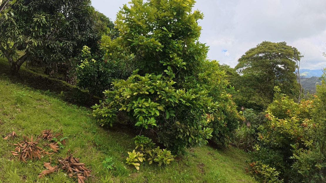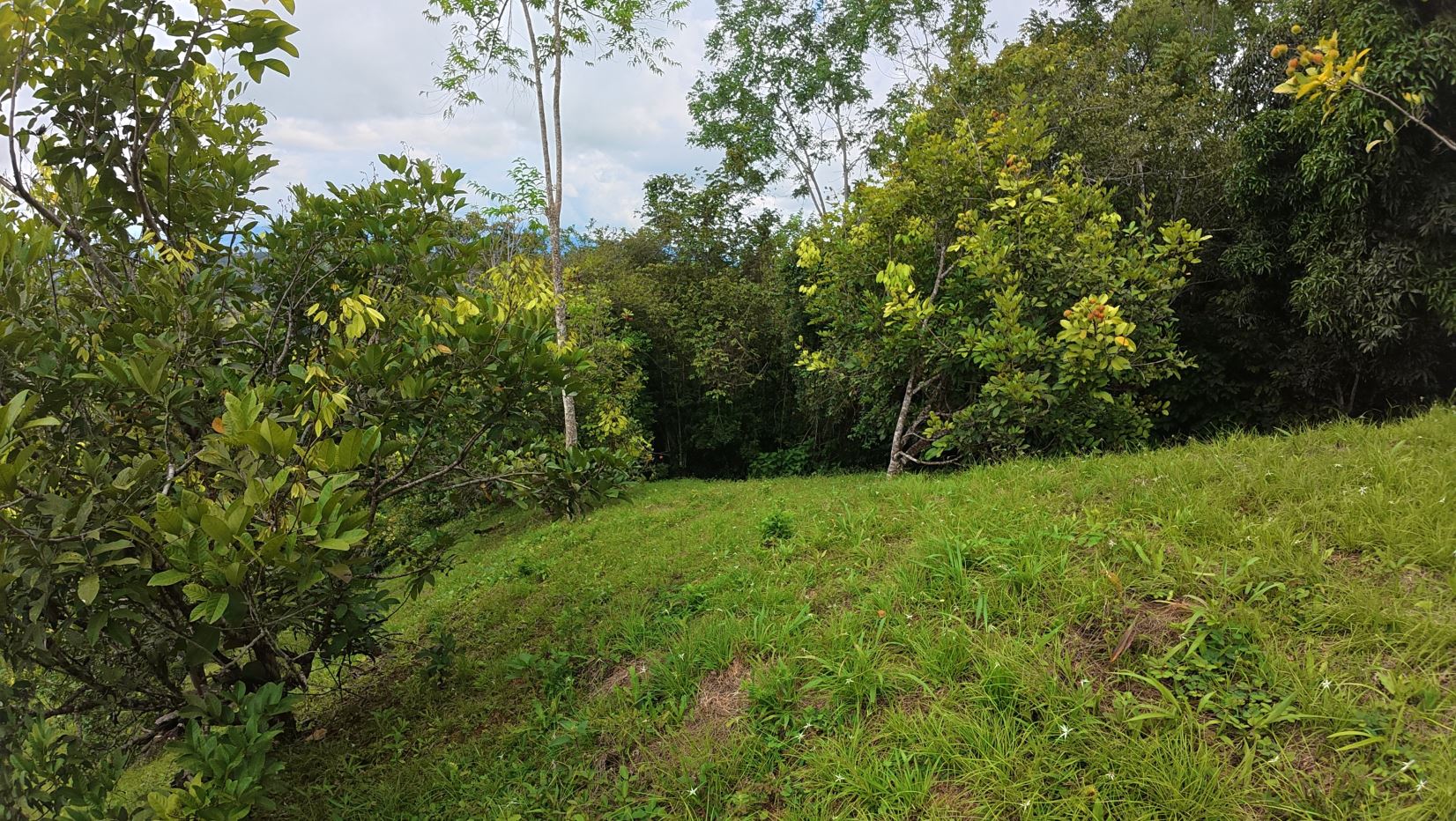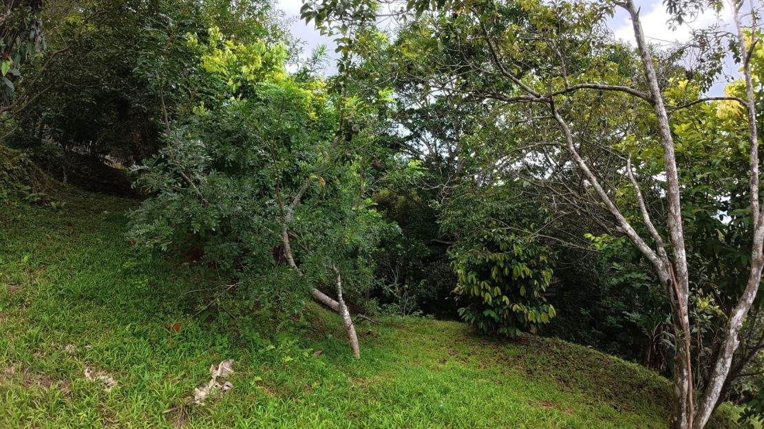 Terreno con topografía aprovechable, rodeado de una exuberante vegetación y árboles frutales.