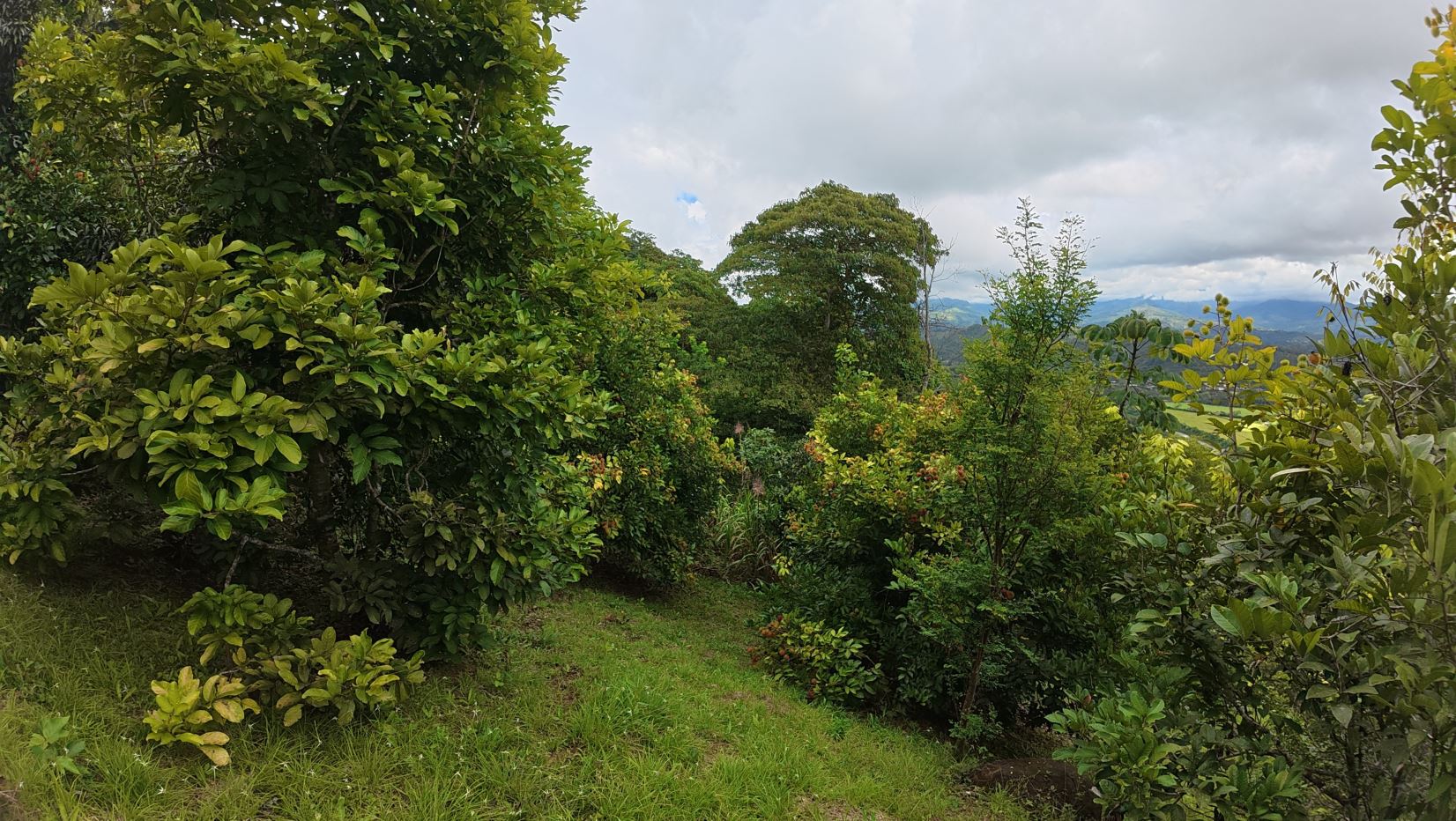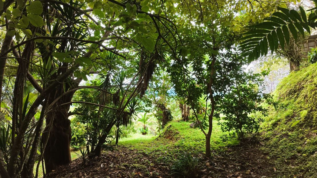 Usable topography surrounded by lush vegetation and a variety of fruit trees.