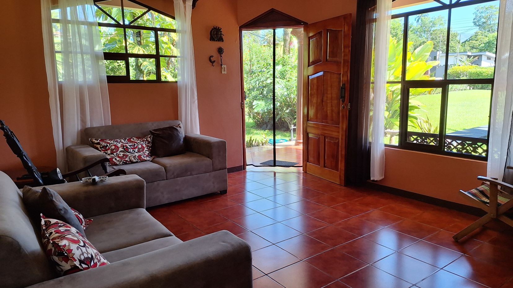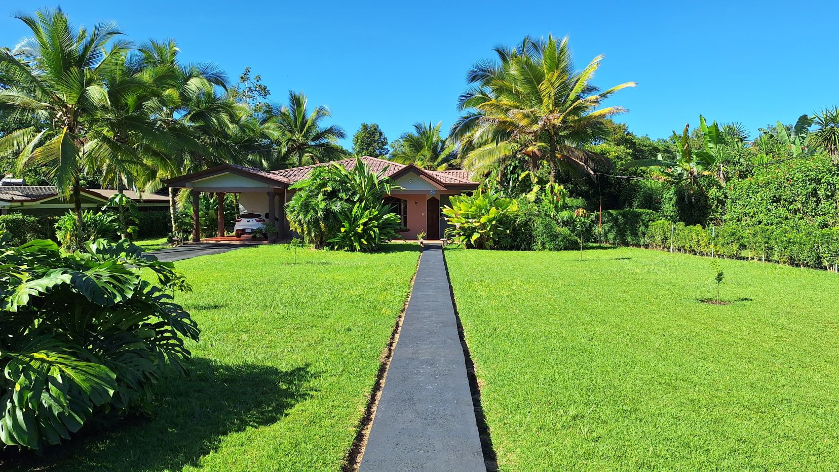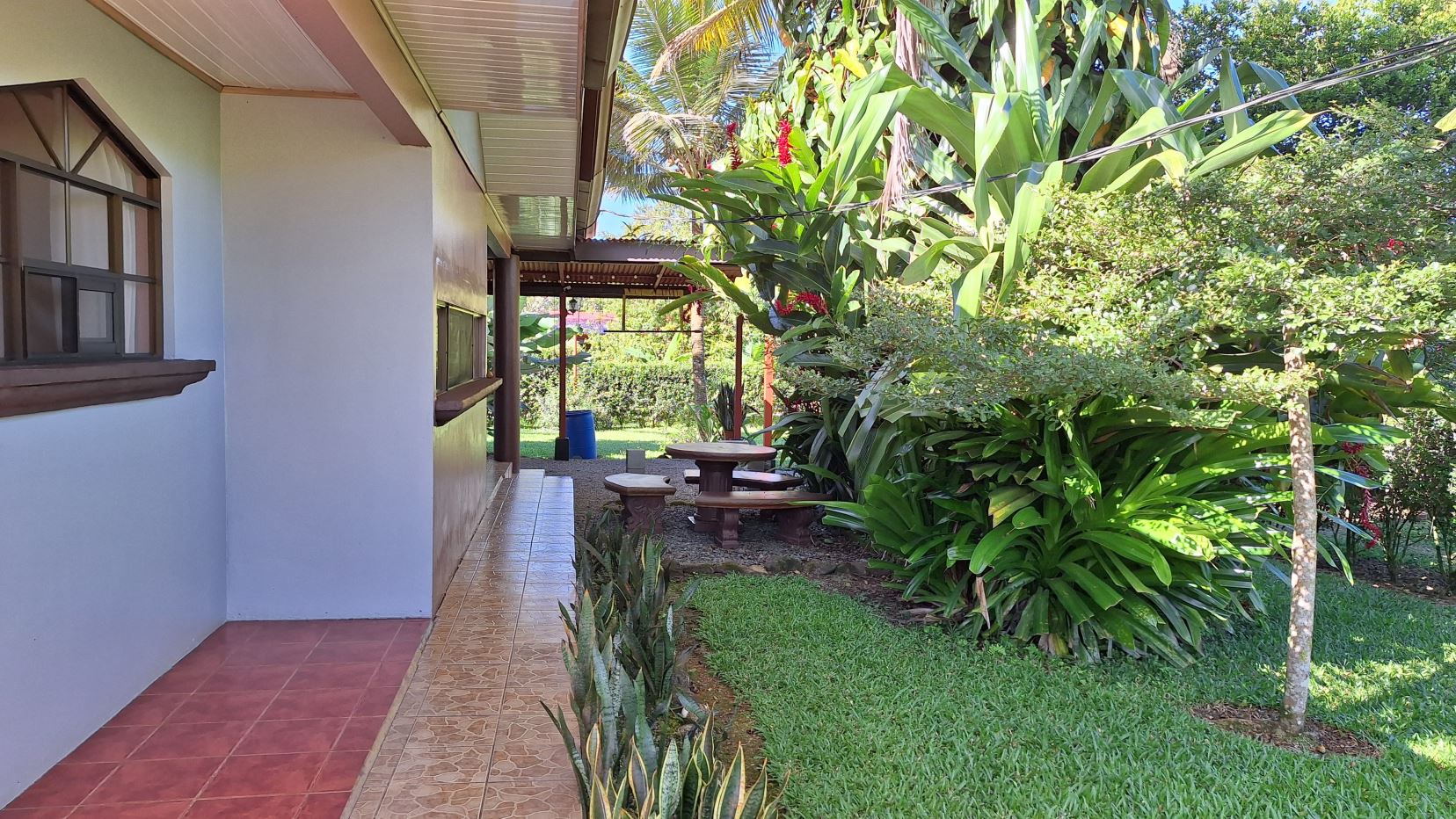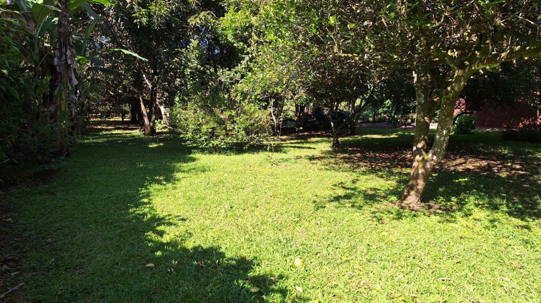 La propiedad está rodeada de exuberante vegetación, jardines cuidadosamente mantenidos, árboles frutales y una amplia zona verde perfecta para disfrutar al aire libre.