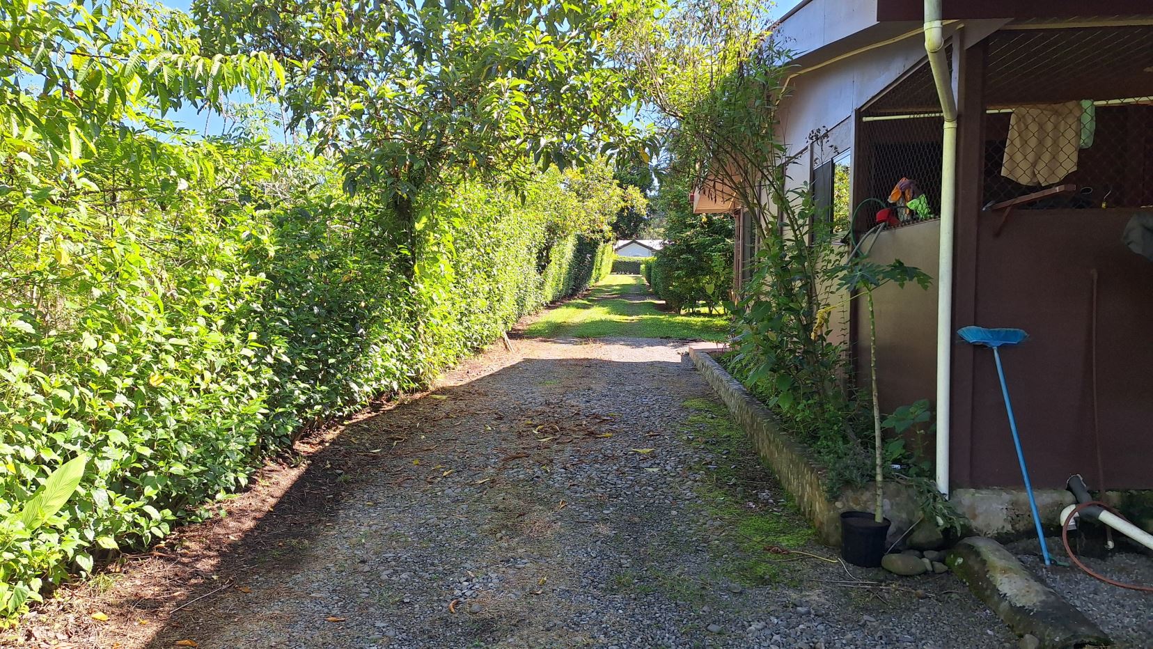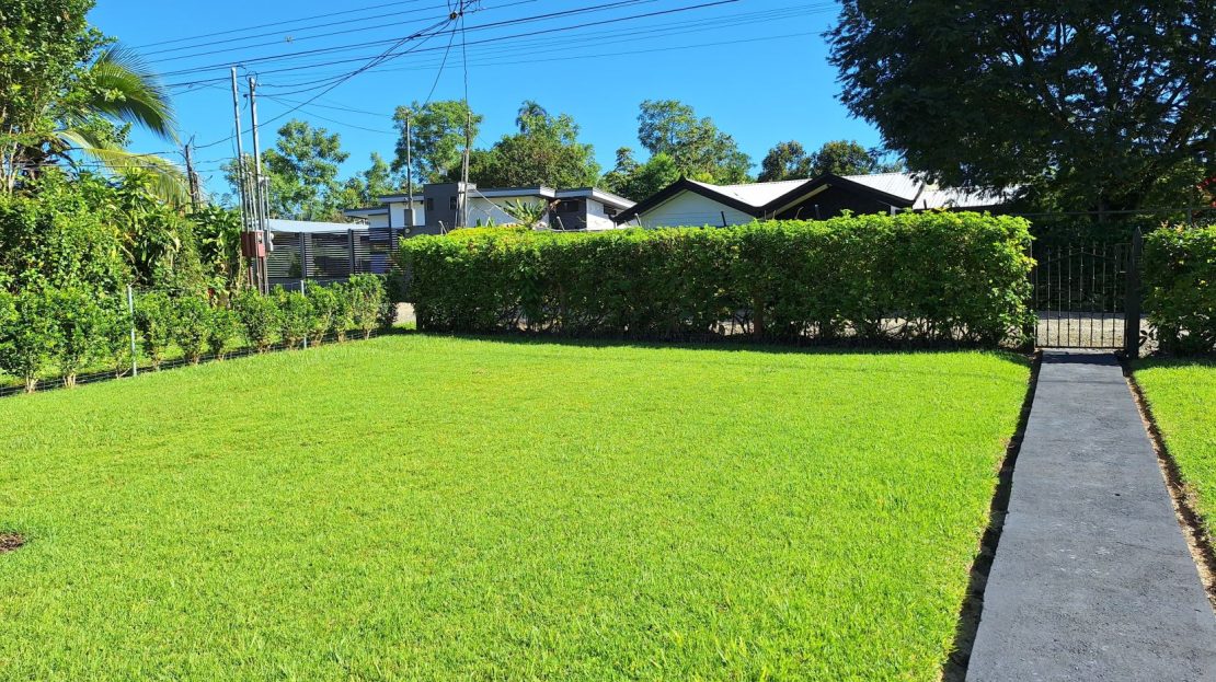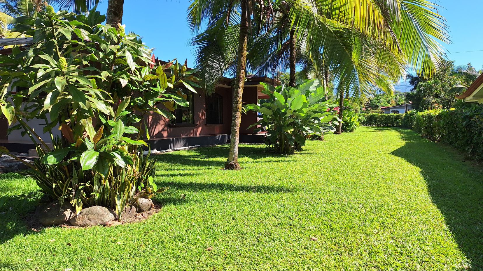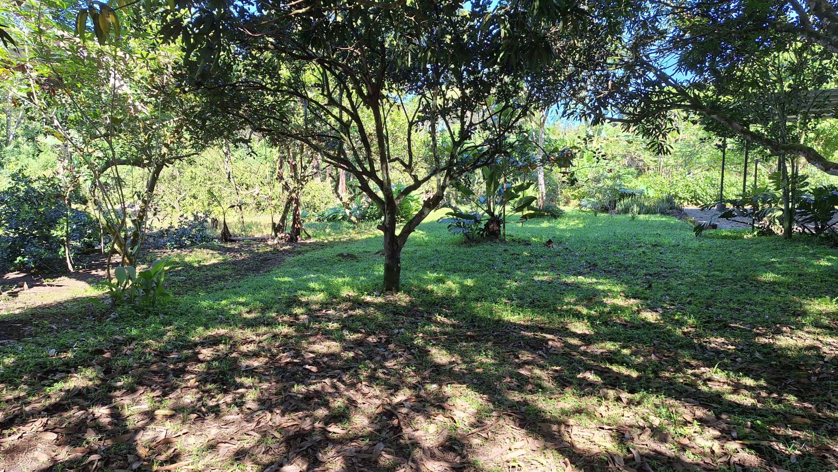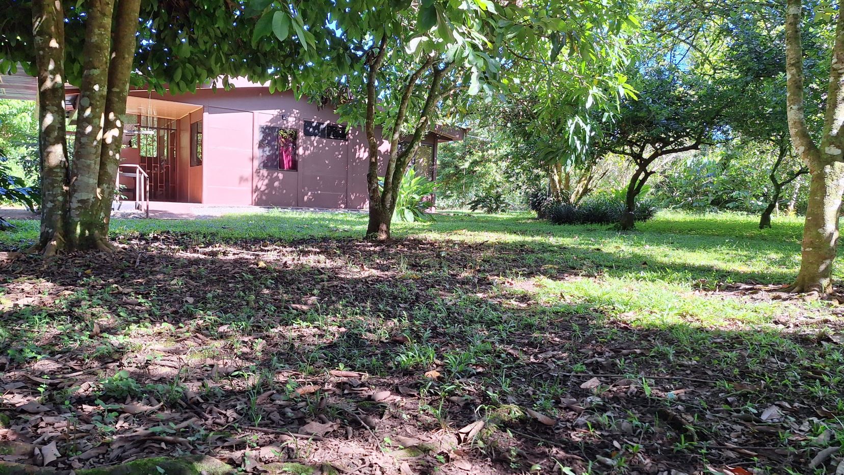 La propiedad está rodeada de exuberante vegetación, jardines cuidadosamente mantenidos, árboles frutales y una amplia zona verde perfecta para disfrutar al aire libre.