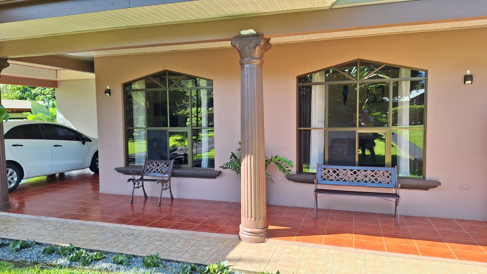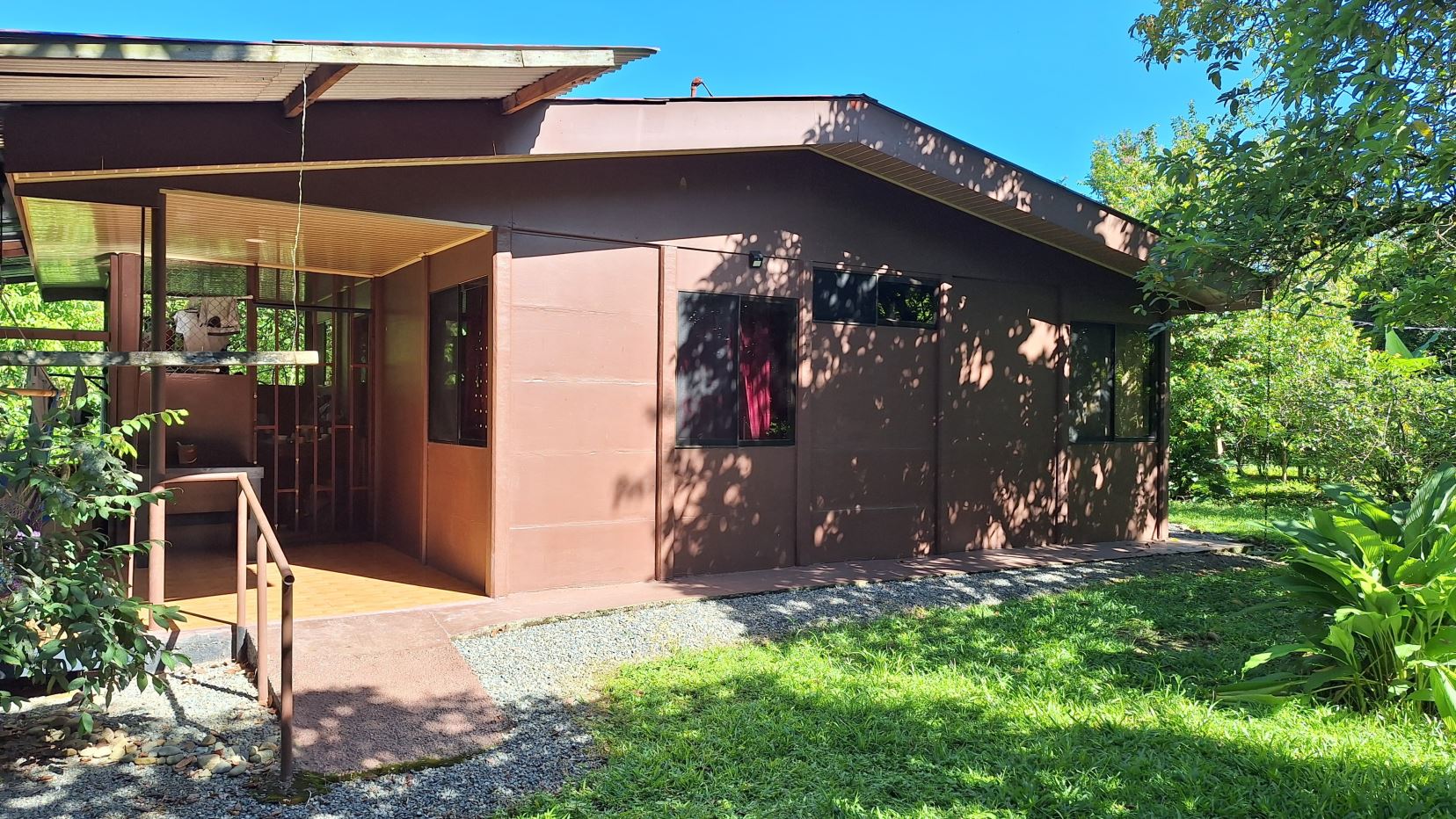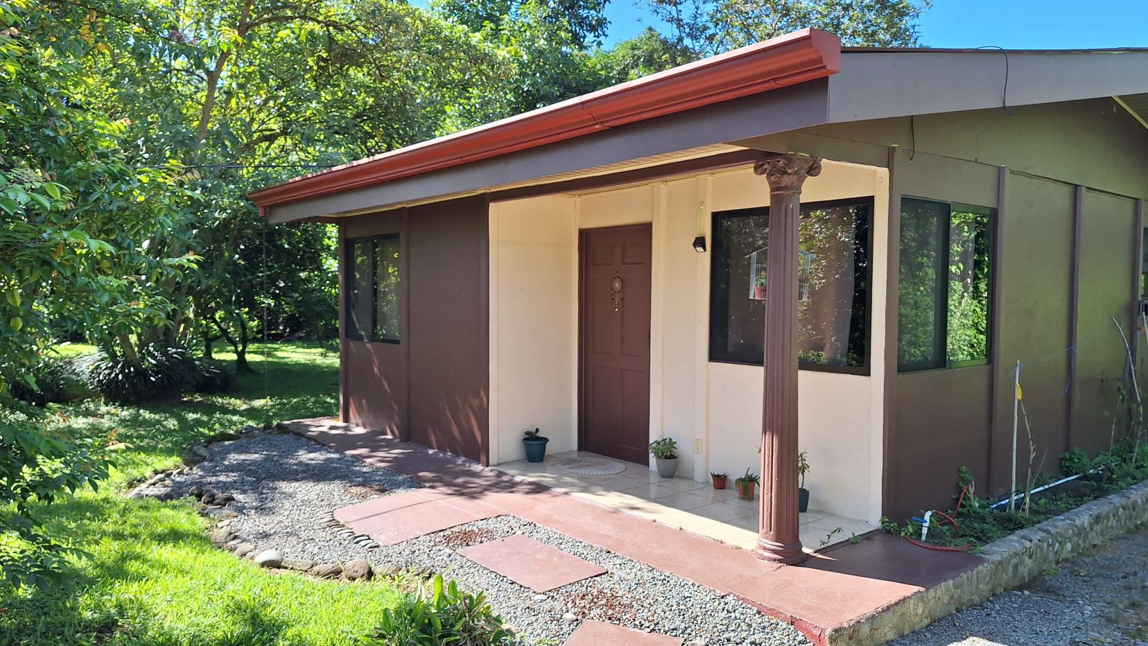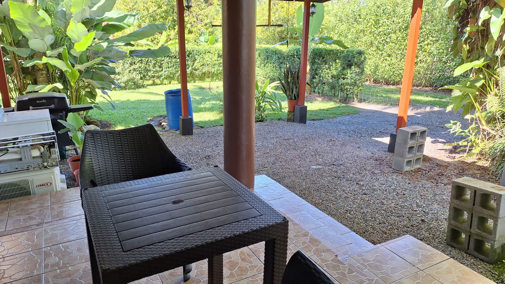 La propiedad está rodeada de exuberante vegetación, jardines cuidadosamente mantenidos, árboles frutales y una amplia zona verde perfecta para disfrutar al aire libre.