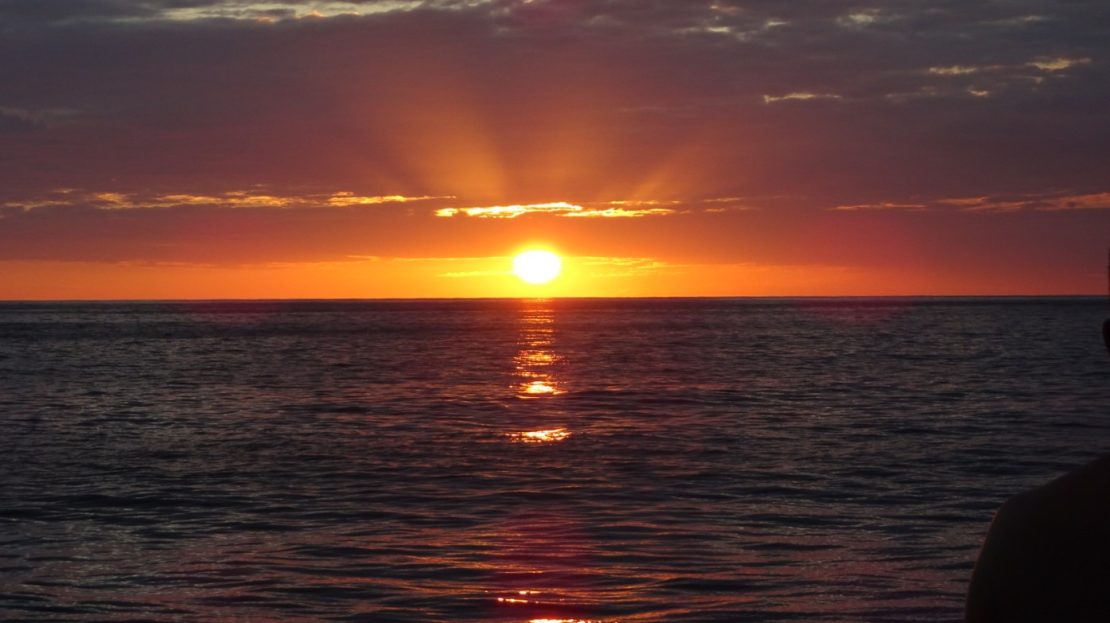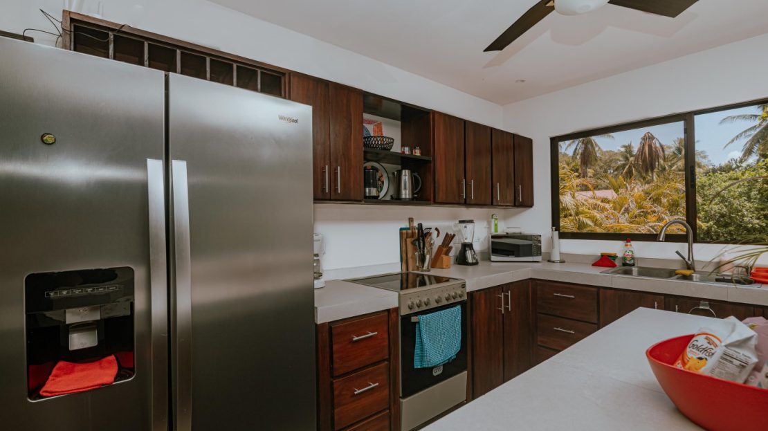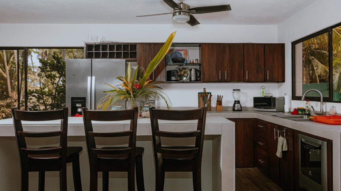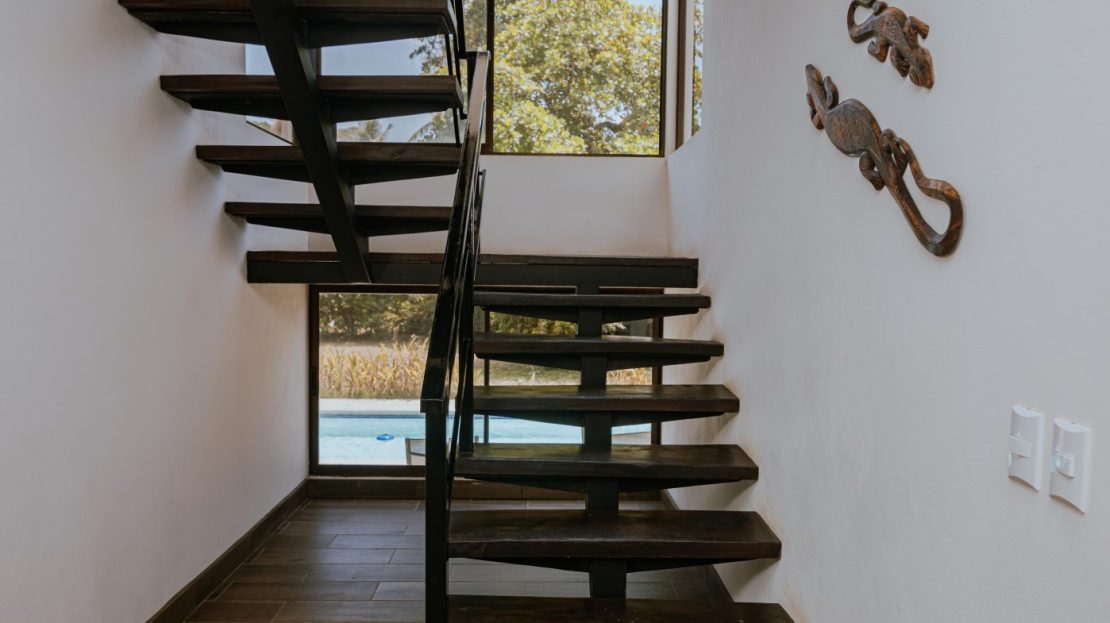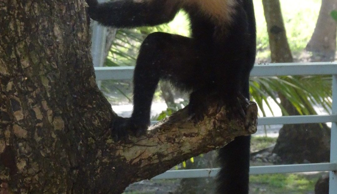 The second floor features a large balcony built around an almond tree, offering stunning ocean views and frequent visits from monkeys and birds.