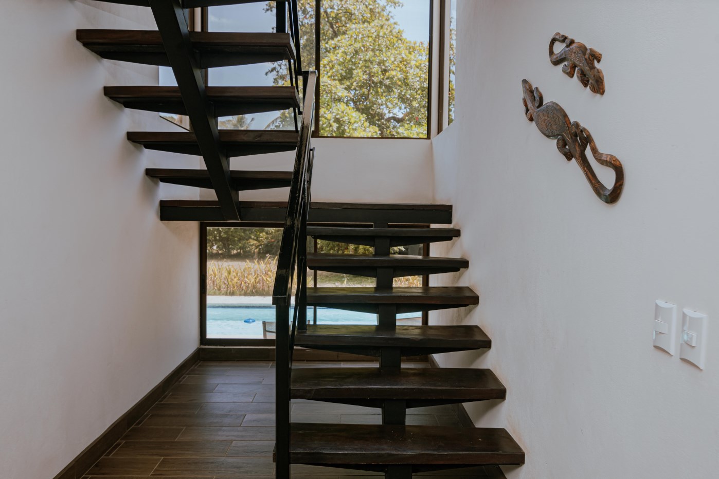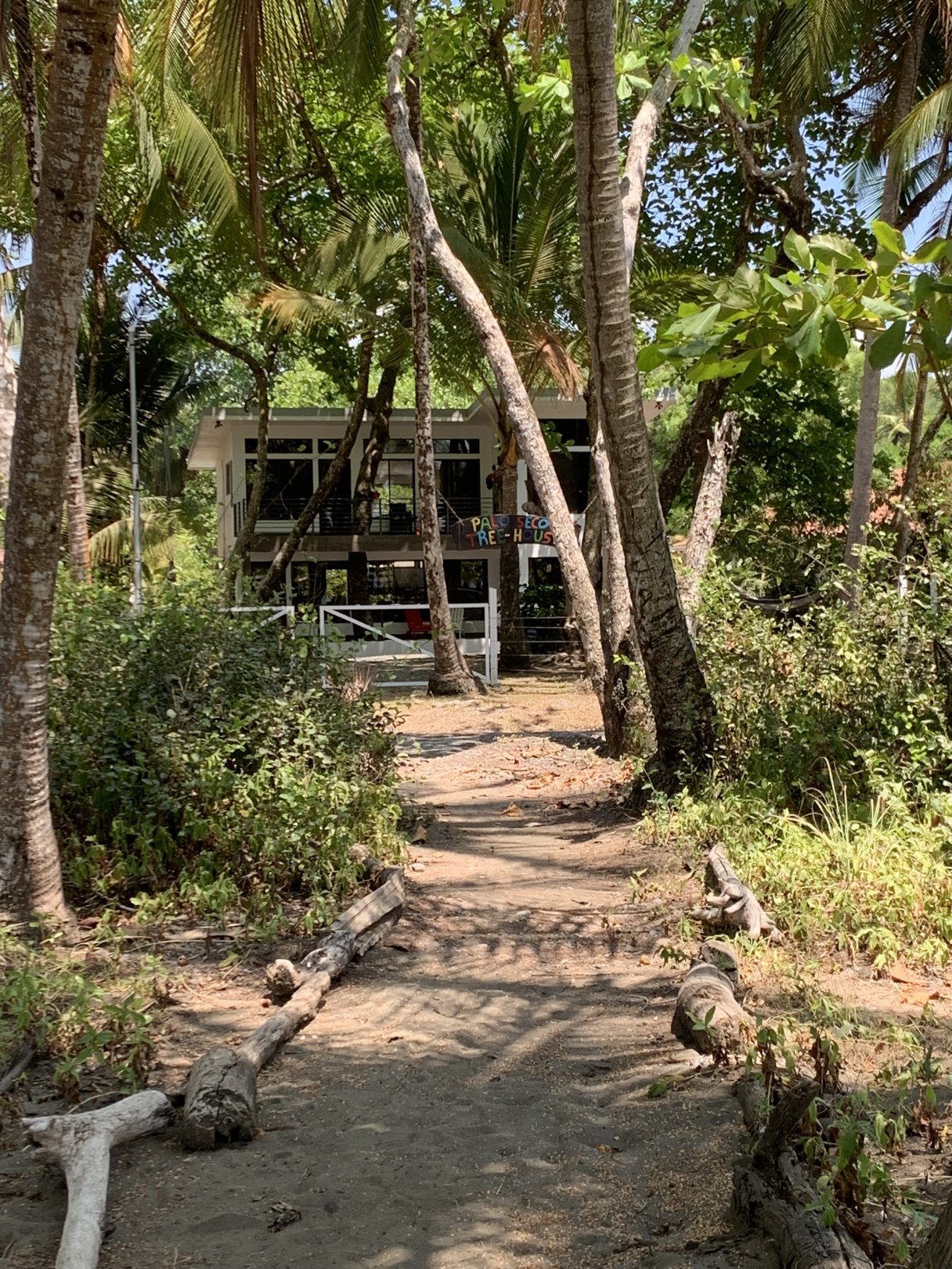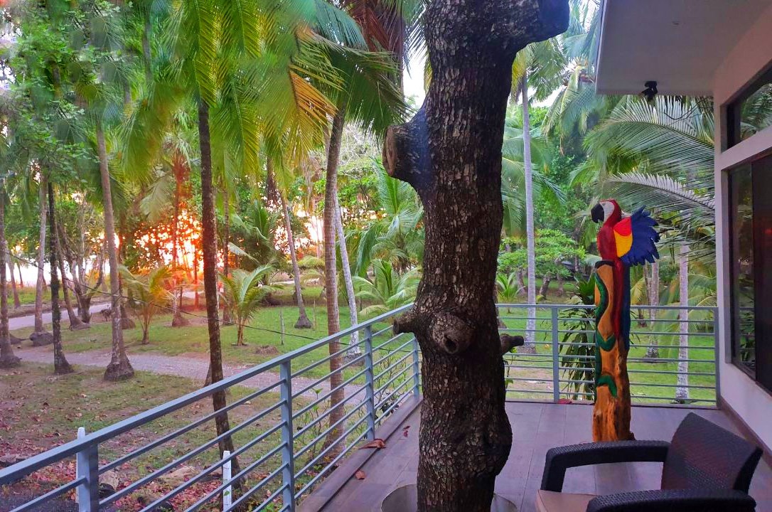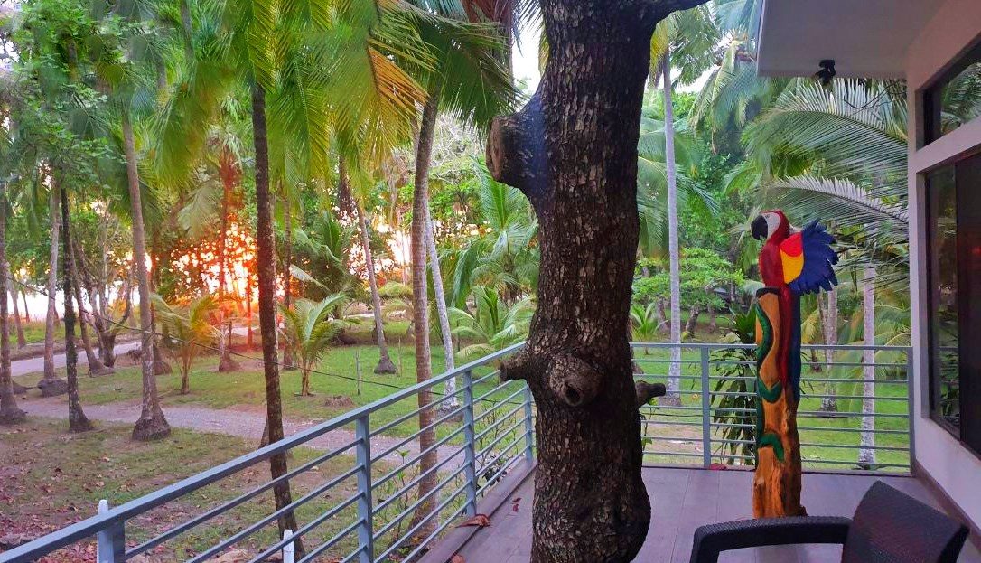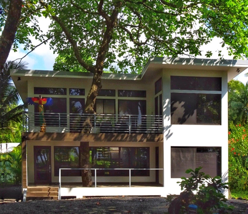 El segundo piso cuenta con un gran balcón construido alrededor de un almendro, que ofrece impresionantes vistas al océano y visitas frecuentes de monos y aves.