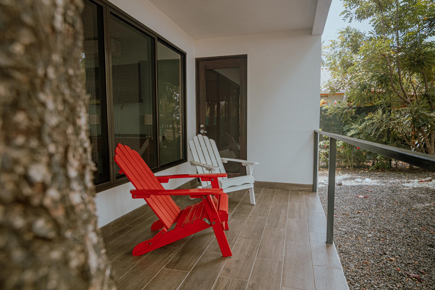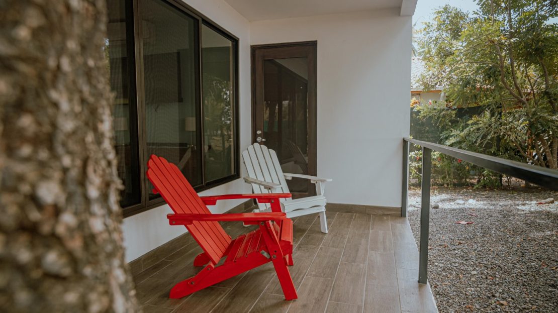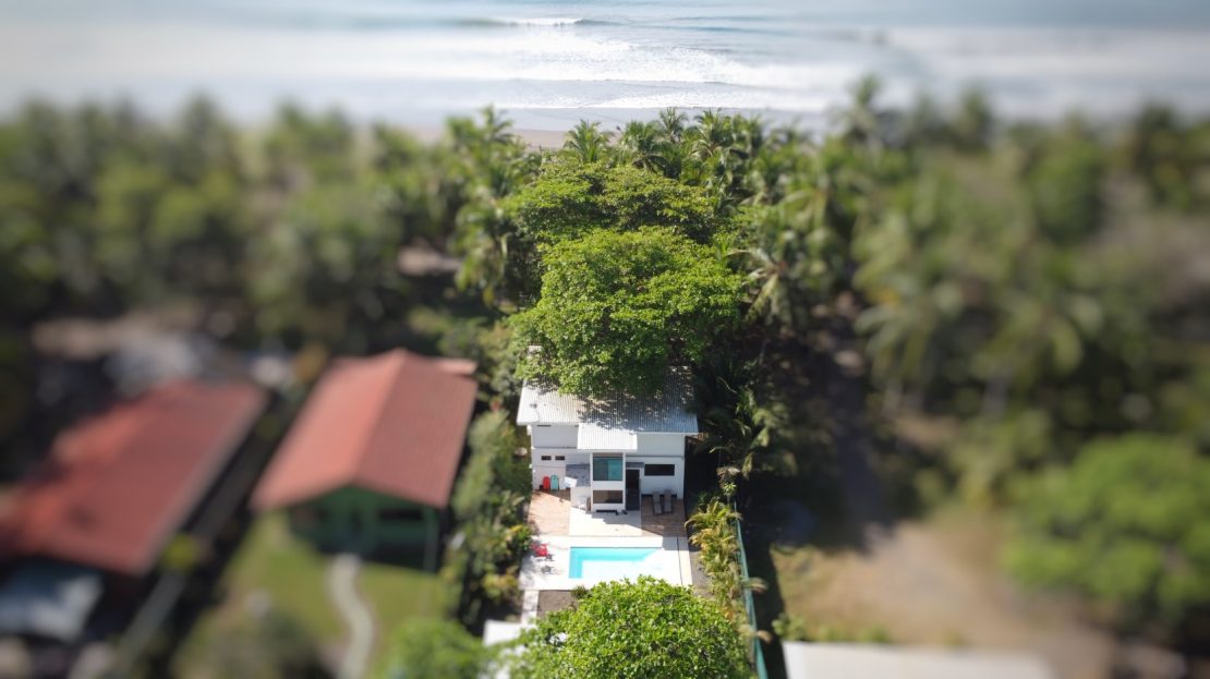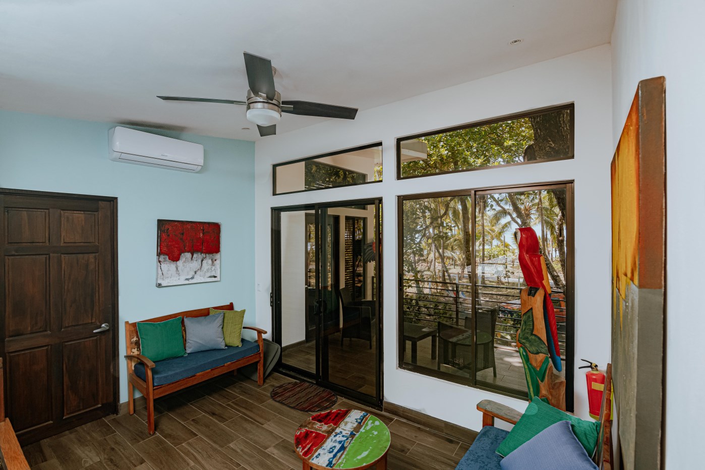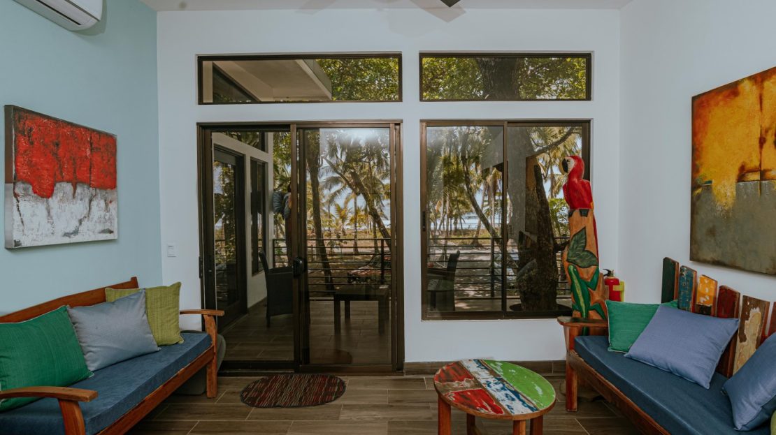 El segundo piso cuenta con un gran balcón construido alrededor de un almendro, que ofrece impresionantes vistas al océano y visitas frecuentes de monos y aves.