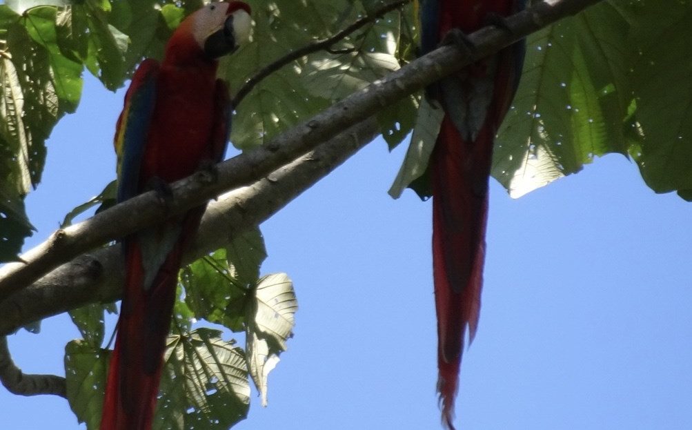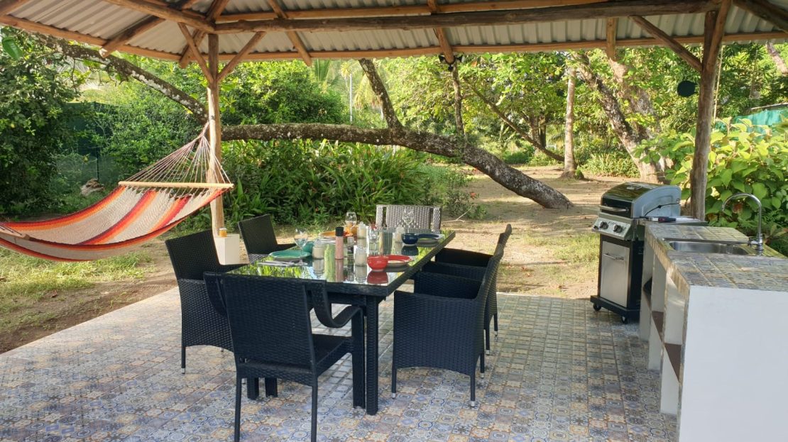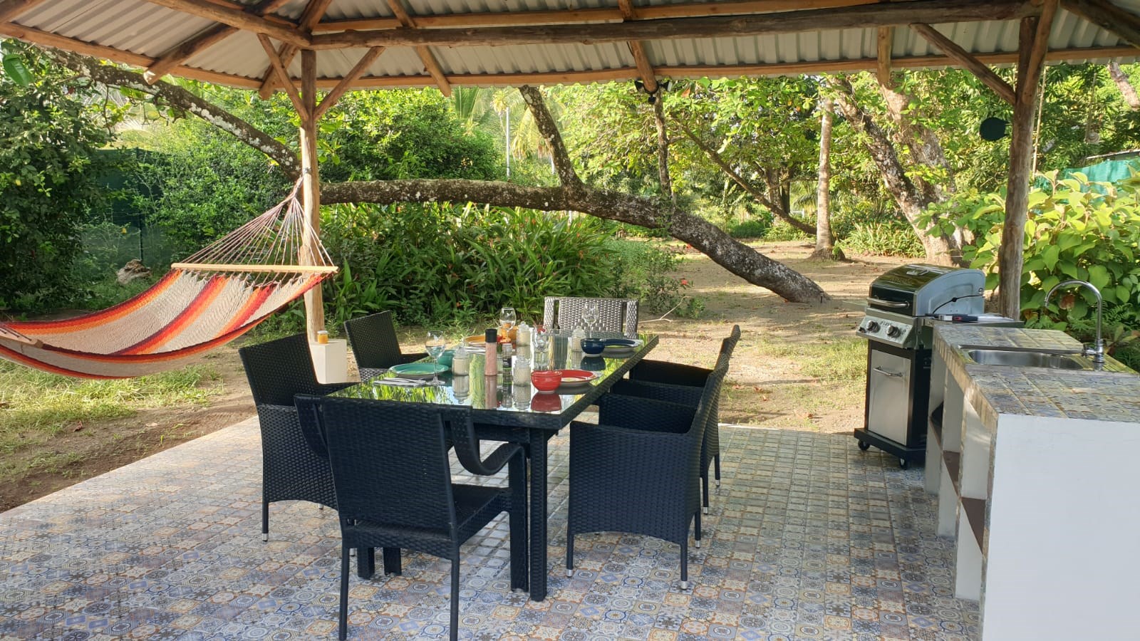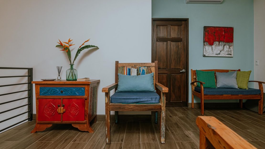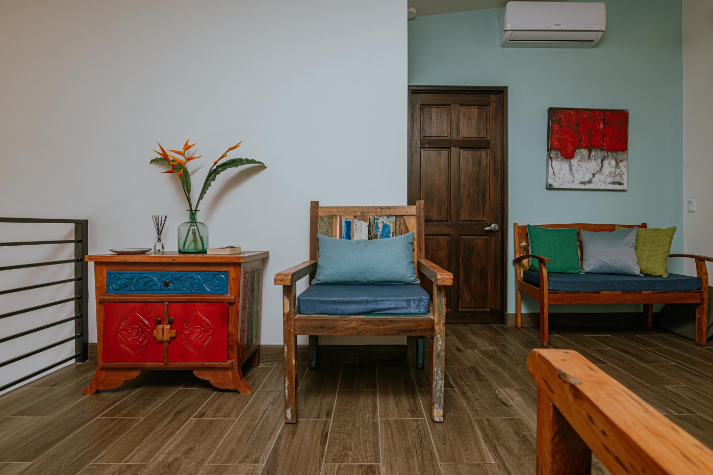 El segundo piso cuenta con un gran balcón construido alrededor de un almendro, que ofrece impresionantes vistas al océano y visitas frecuentes de monos y aves.