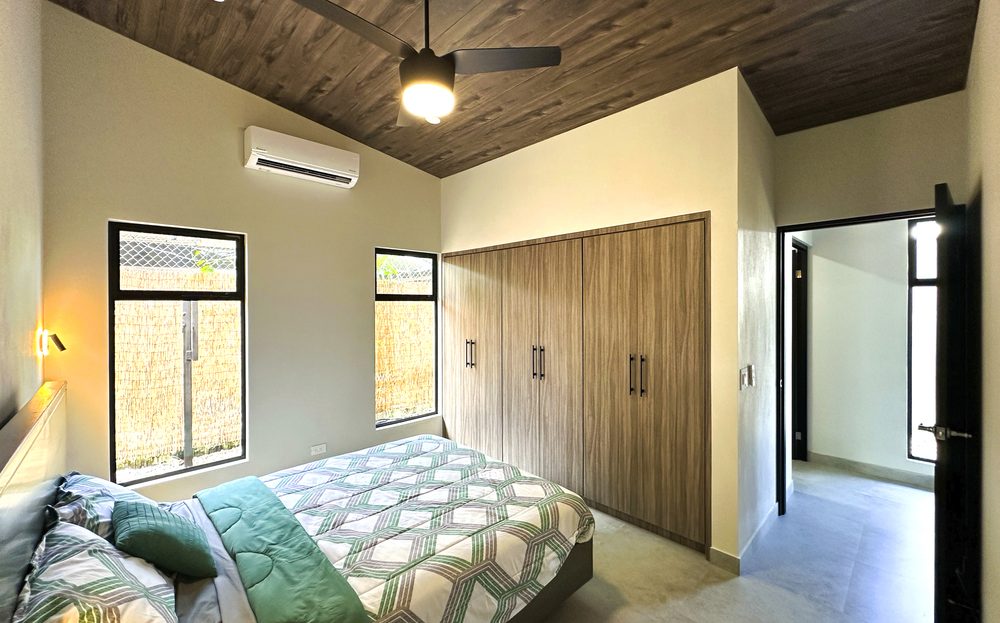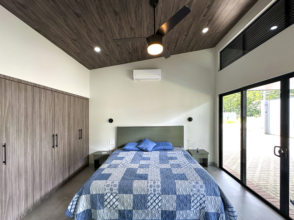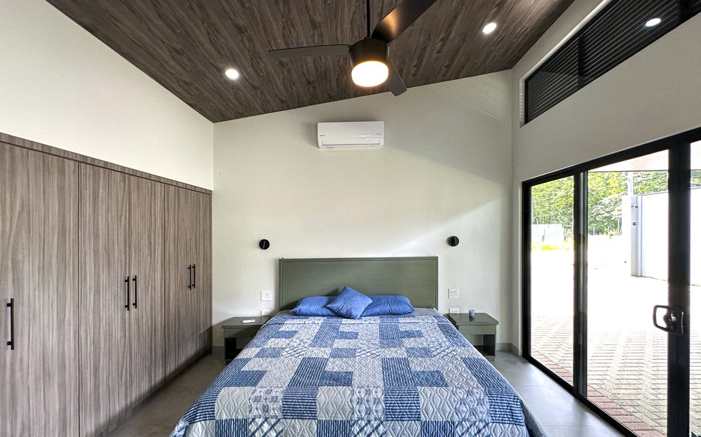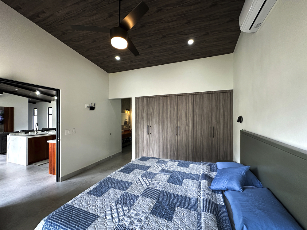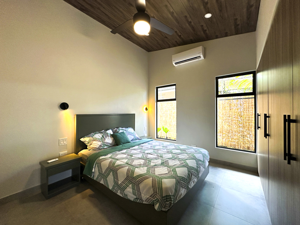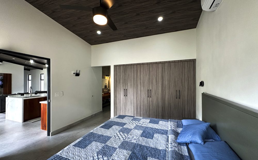 Additional Bedrooms: Two well-appointed bedrooms, each with a queen-size bed, closet, ceiling fan, and air conditioning, share a stylish common bathroom with modern finishes. – Enjoy a seamless flow between the open-concept living room and kitchen, connected to a deck via folding glass doors that enhance the feeling of space and integration, high ceilings and angled roof lines add to the sense of openness..