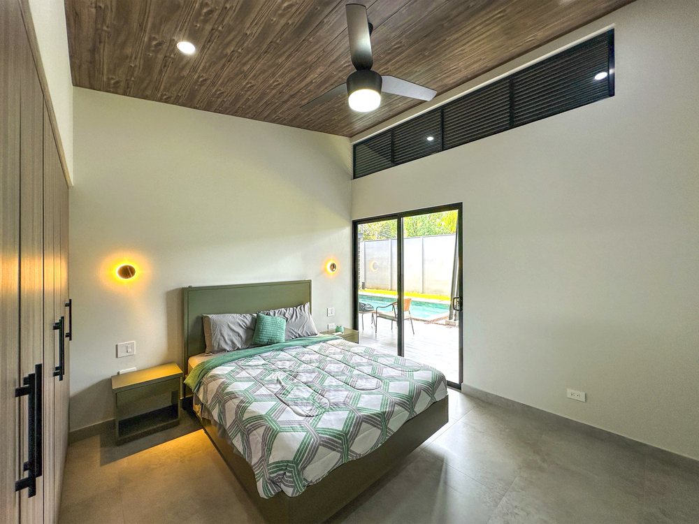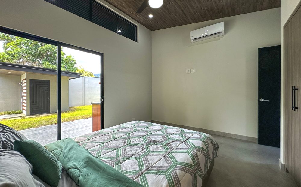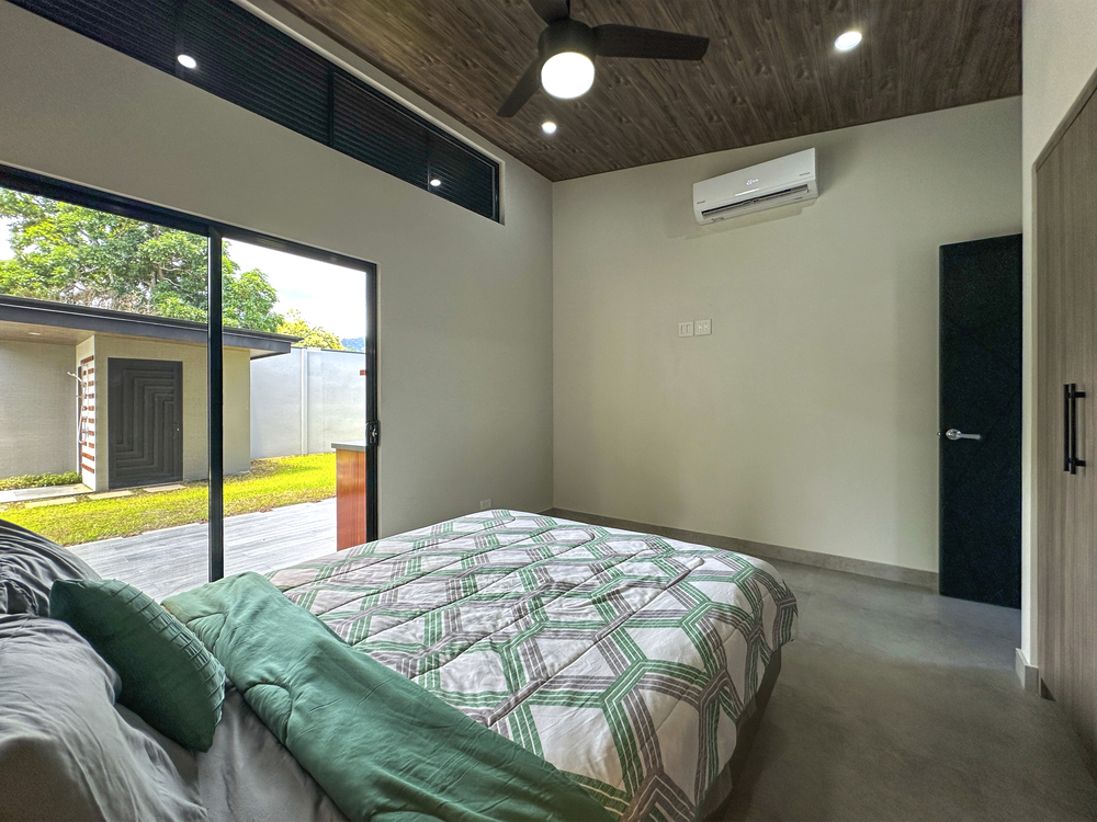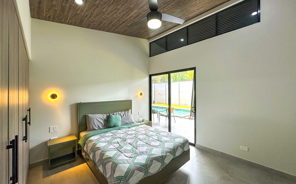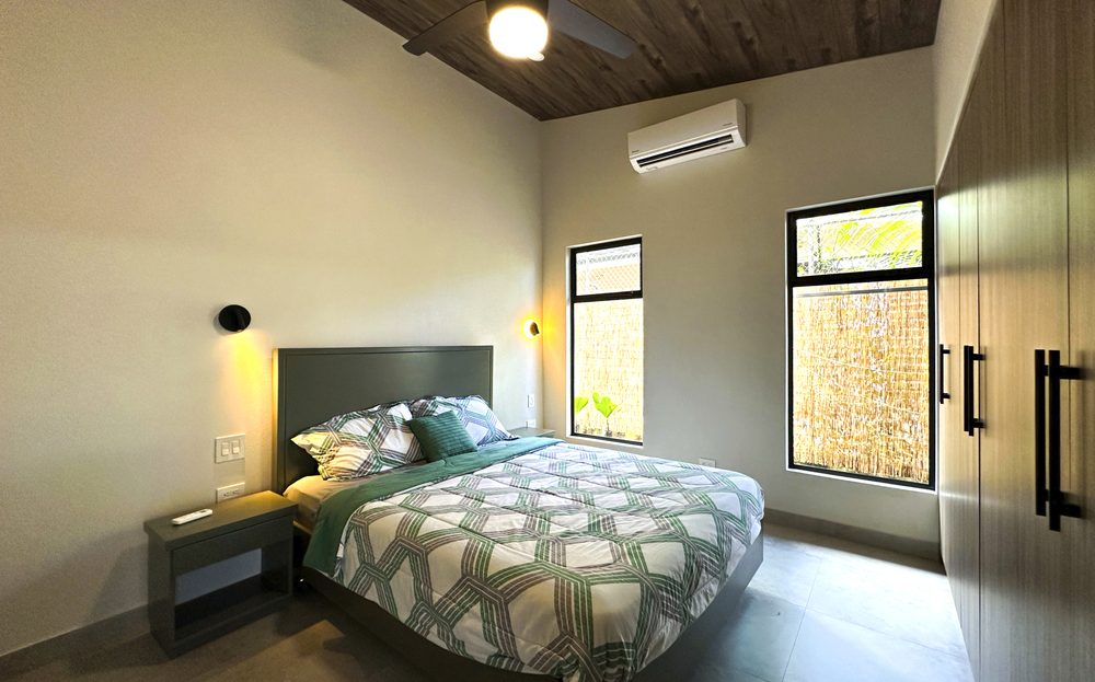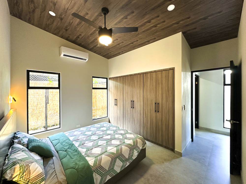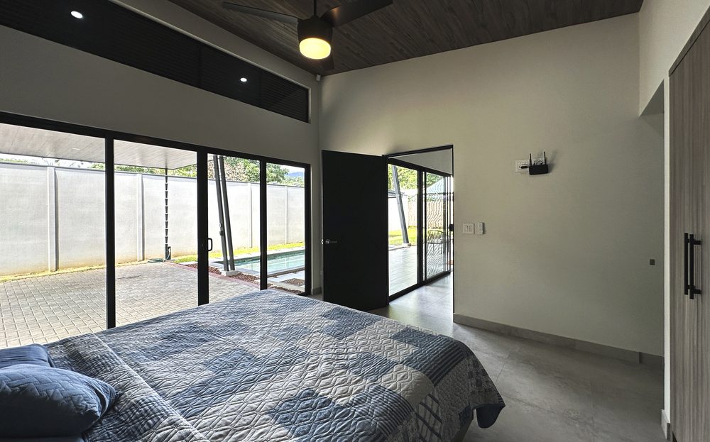 Additional Bedrooms: Two well-appointed bedrooms, each with a queen-size bed, closet, ceiling fan, and air conditioning, share a stylish common bathroom with modern finishes. – Enjoy a seamless flow between the open-concept living room and kitchen, connected to a deck via folding glass doors that enhance the feeling of space and integration, high ceilings and angled roof lines add to the sense of openness..