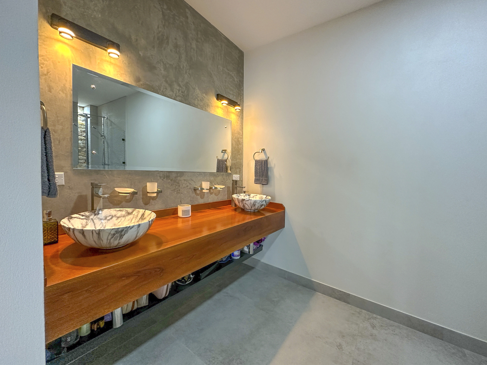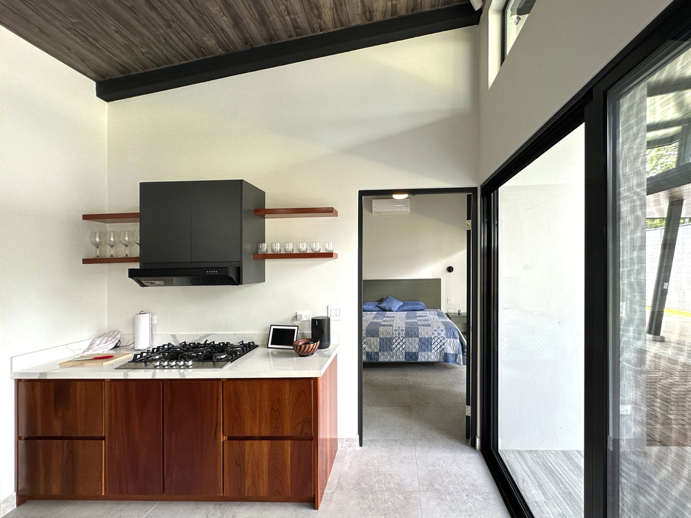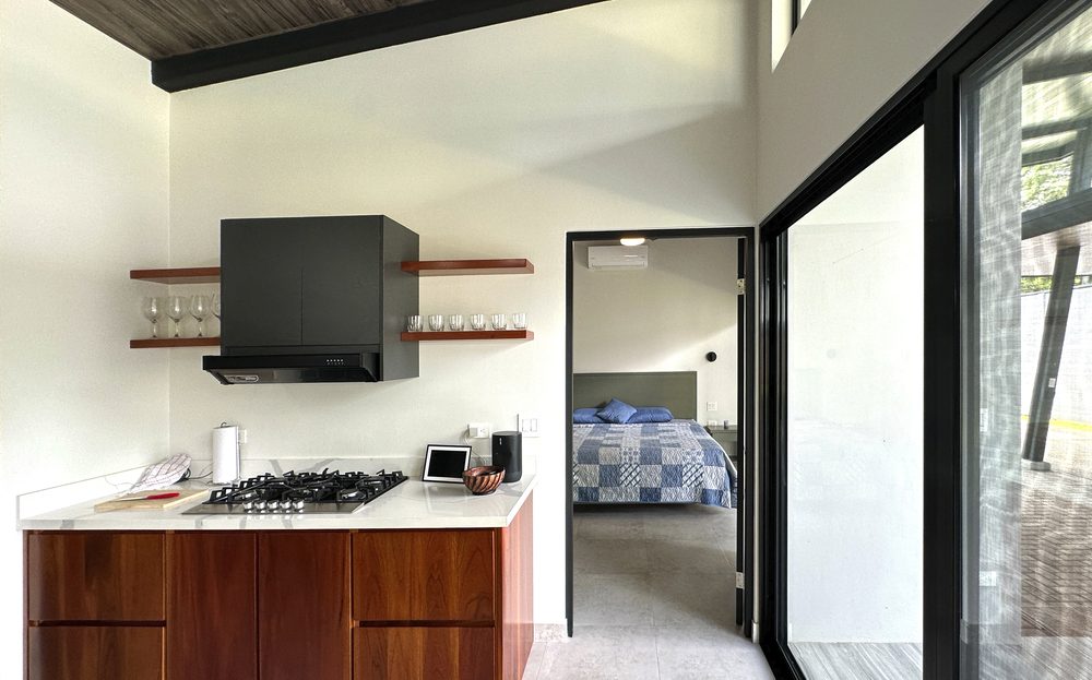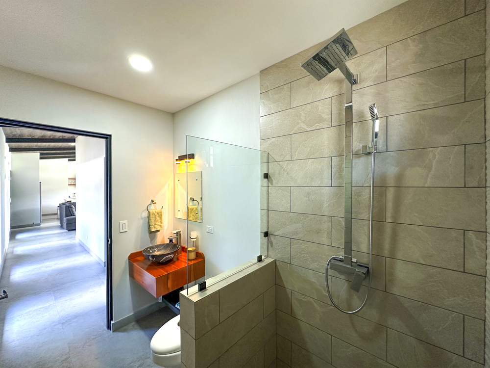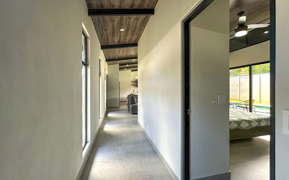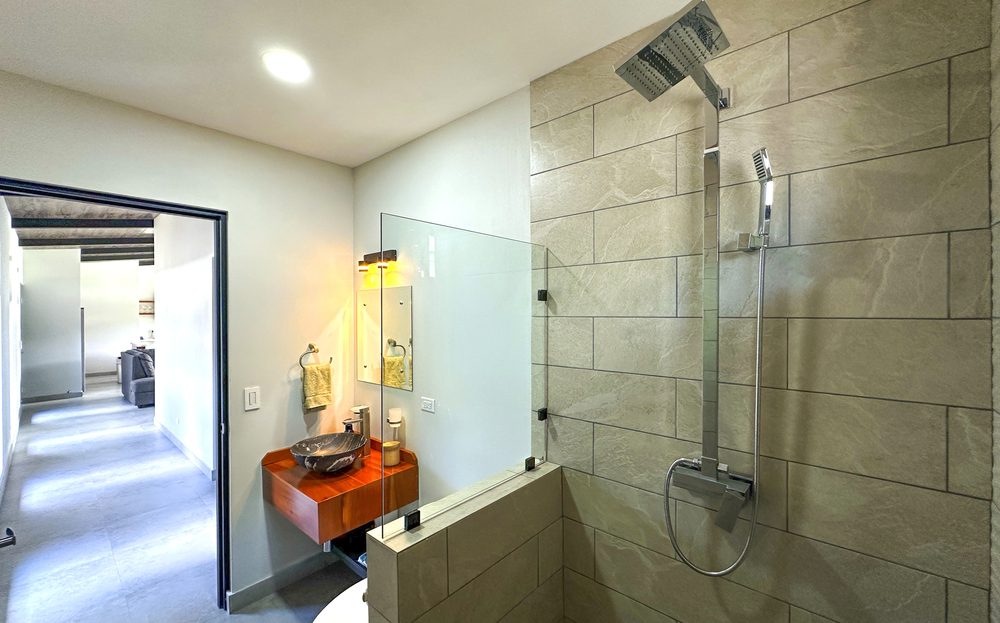 Additional Bedrooms: Two well-appointed bedrooms, each with a queen-size bed, closet, ceiling fan, and air conditioning, share a stylish common bathroom with modern finishes. – Enjoy a seamless flow between the open-concept living room and kitchen, connected to a deck via folding glass doors that enhance the feeling of space and integration, high ceilings and angled roof lines add to the sense of openness..