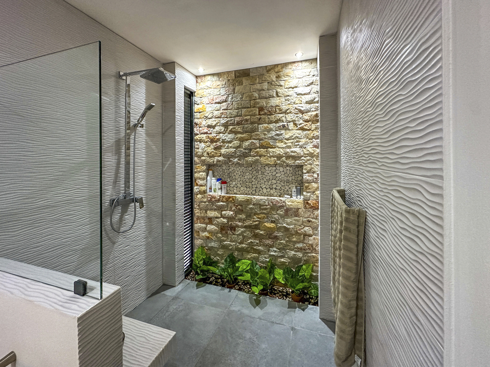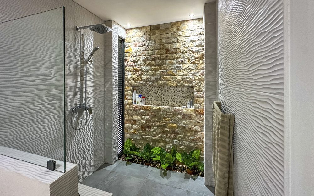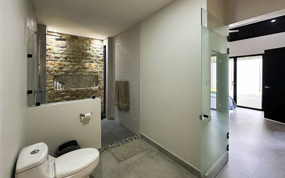 The Master Bedroom features a king-size bed, spacious closet, ceiling fan, air conditioning, and a luxurious en-suite bathroom with dual sinks, modern faucets, and veneered walls. –
