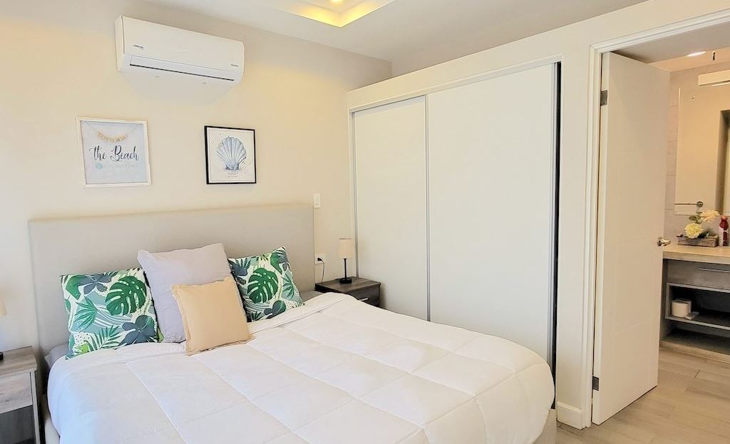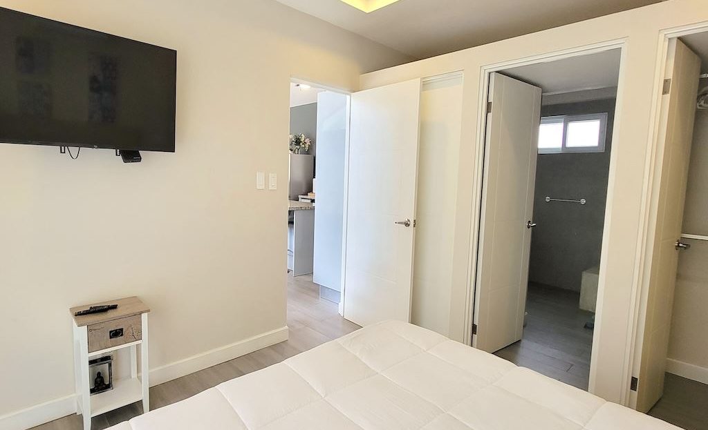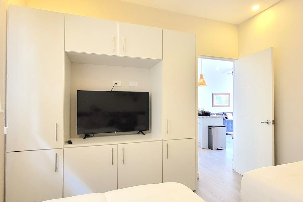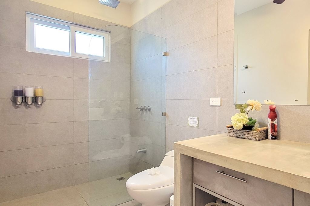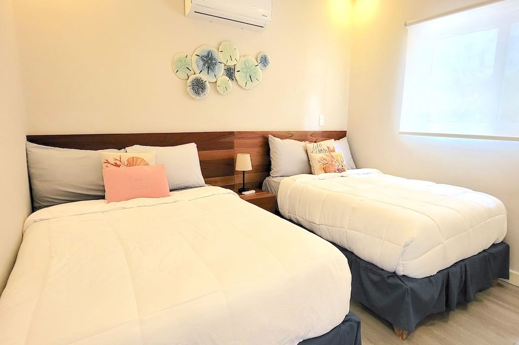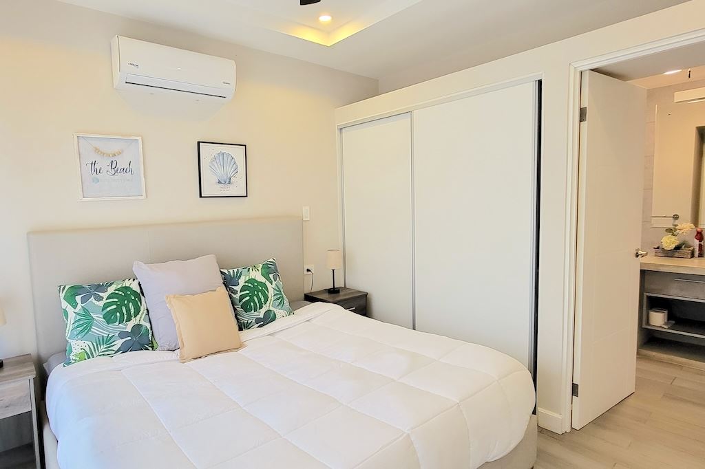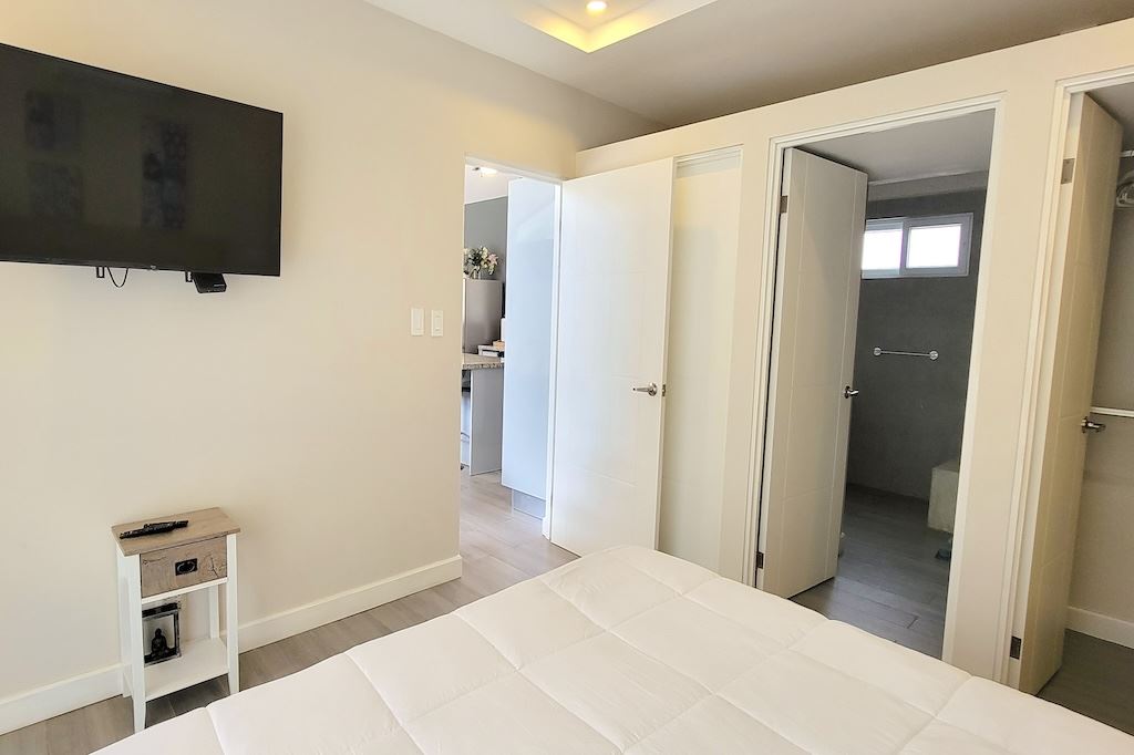 The primary bedroom offers a comfortable and functional layout, complemented by high-end finishes in the ensuite bathroom. The second bedroom includes a queen-size bed and built-in closets, and shares a Jack-and-Jill bathroom with the third bedroom, which accommodates two double beds, perfect for hosting family and friends. The kitchen and living areas are designed with an open-concept layout, creating an inviting space to gather and enjoy everyday living. Outside, the home is surrounded by a tropical garden that serves as a blank canvas for the new owner to design a beautiful terrace, add more flowers, or enhance the landscaping to their taste. Additional storage is conveniently located next to the laundry area, and the property includes two parking spaces.