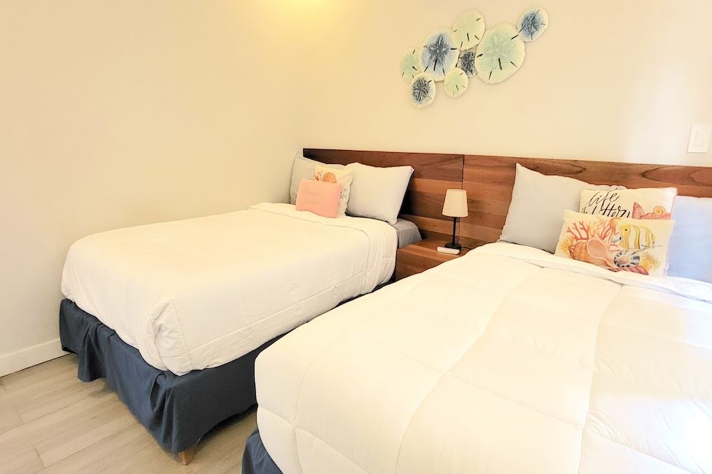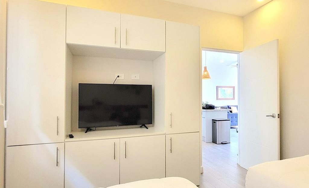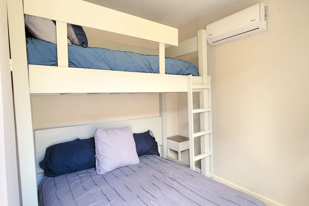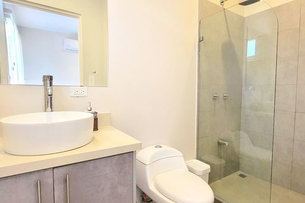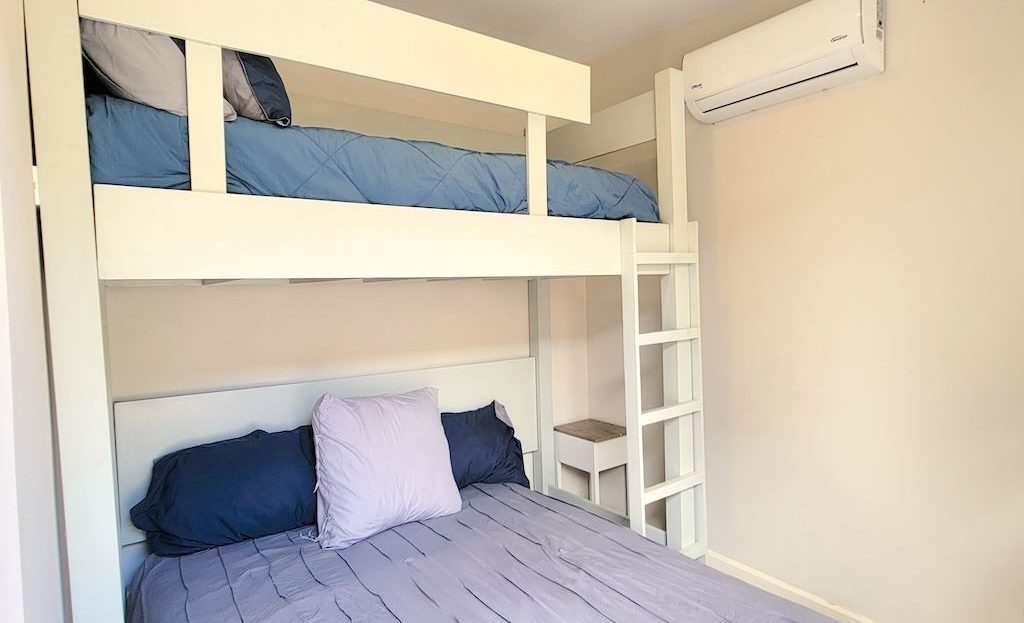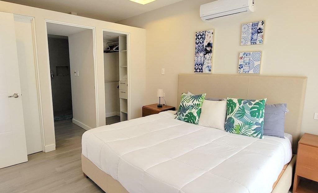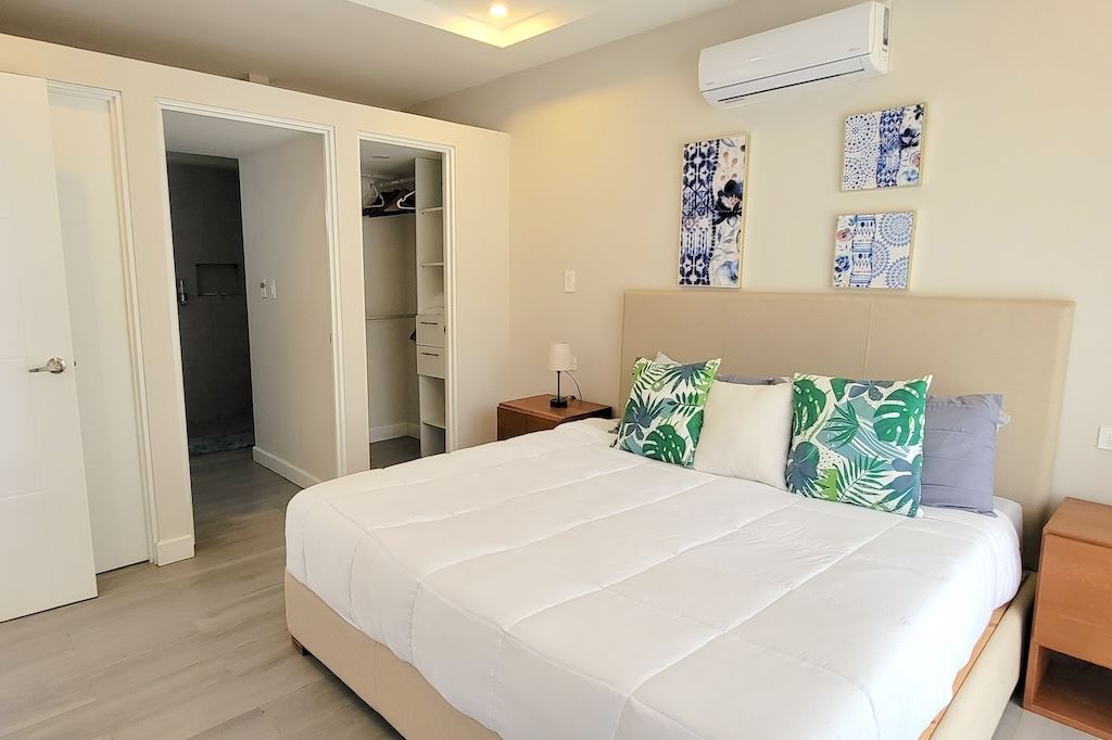 The primary bedroom offers a comfortable and functional layout, complemented by high-end finishes in the ensuite bathroom. The second bedroom includes a queen-size bed and built-in closets, and shares a Jack-and-Jill bathroom with the third bedroom, which accommodates two double beds, perfect for hosting family and friends. The kitchen and living areas are designed with an open-concept layout, creating an inviting space to gather and enjoy everyday living. Outside, the home is surrounded by a tropical garden that serves as a blank canvas for the new owner to design a beautiful terrace, add more flowers, or enhance the landscaping to their taste. Additional storage is conveniently located next to the laundry area, and the property includes two parking spaces.