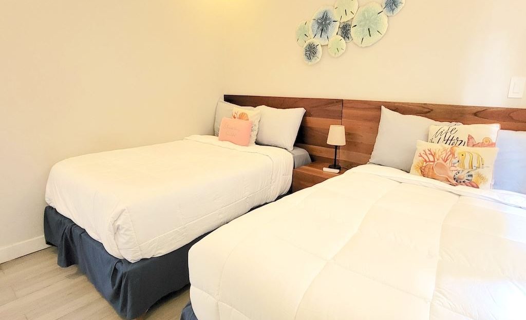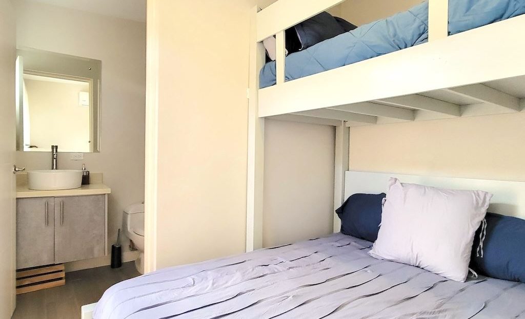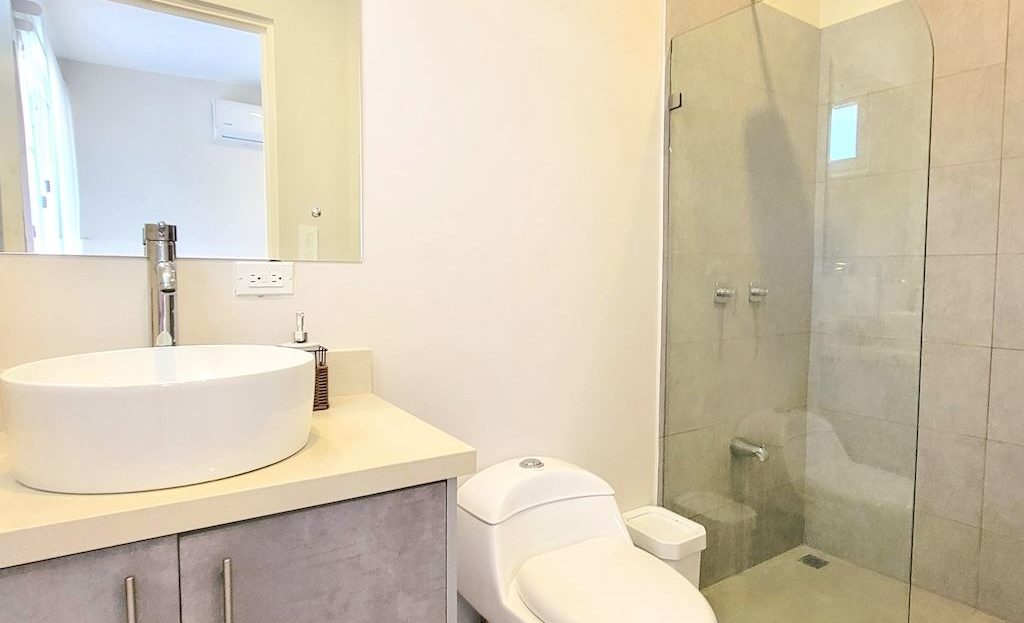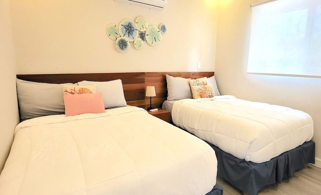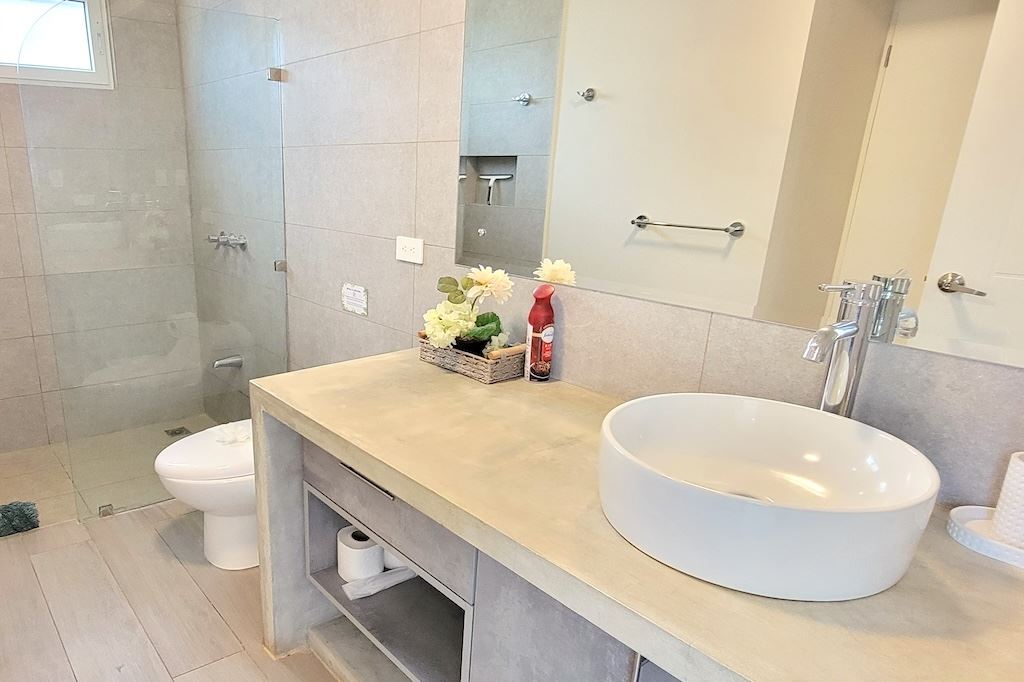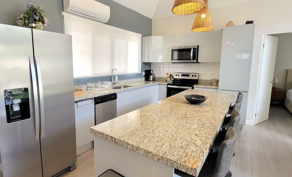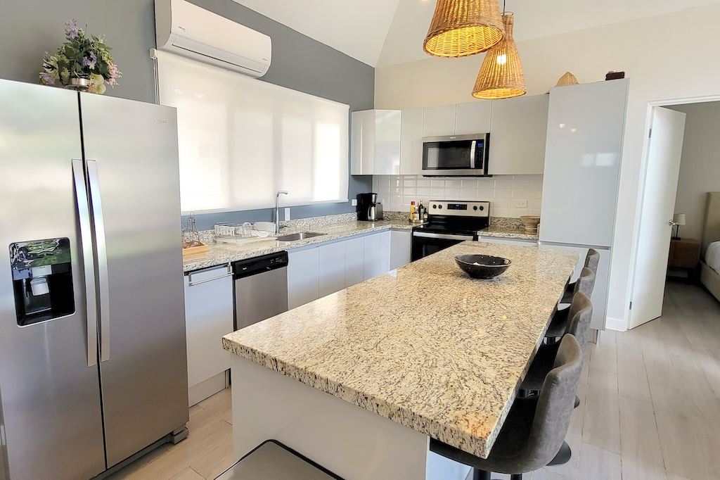 The primary bedroom offers a comfortable and functional layout, complemented by high-end finishes in the ensuite bathroom. The second bedroom includes a queen-size bed and built-in closets, and shares a Jack-and-Jill bathroom with the third bedroom, which accommodates two double beds, perfect for hosting family and friends. The kitchen and living areas are designed with an open-concept layout, creating an inviting space to gather and enjoy everyday living. Outside, the home is surrounded by a tropical garden that serves as a blank canvas for the new owner to design a beautiful terrace, add more flowers, or enhance the landscaping to their taste. Additional storage is conveniently located next to the laundry area, and the property includes two parking spaces.
