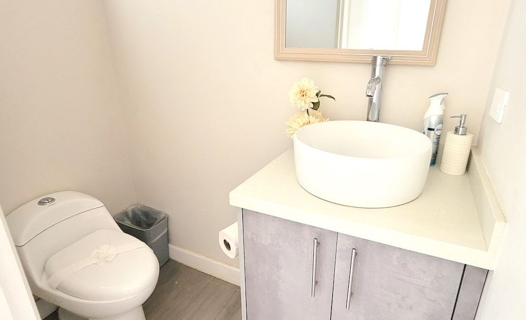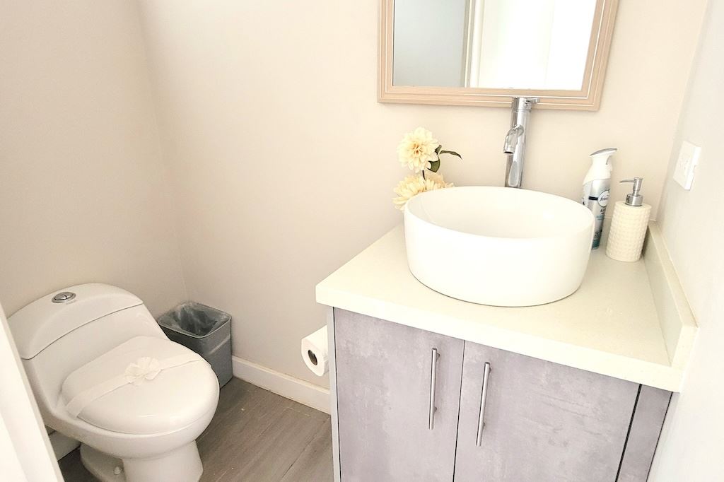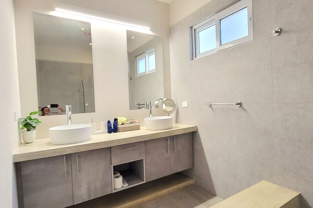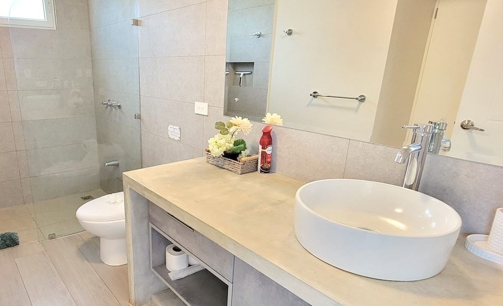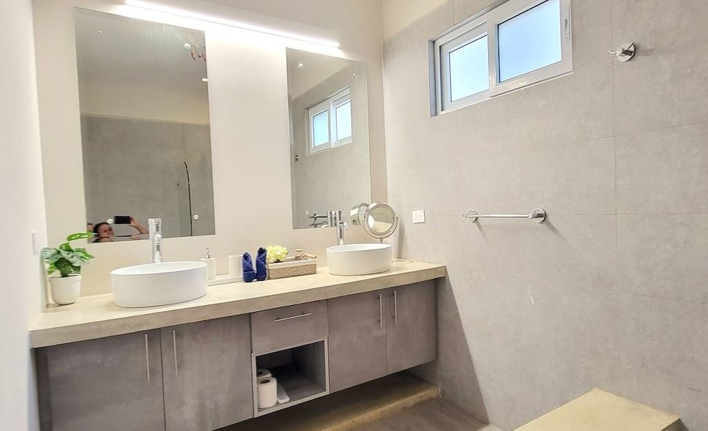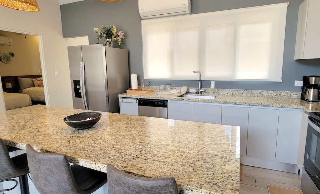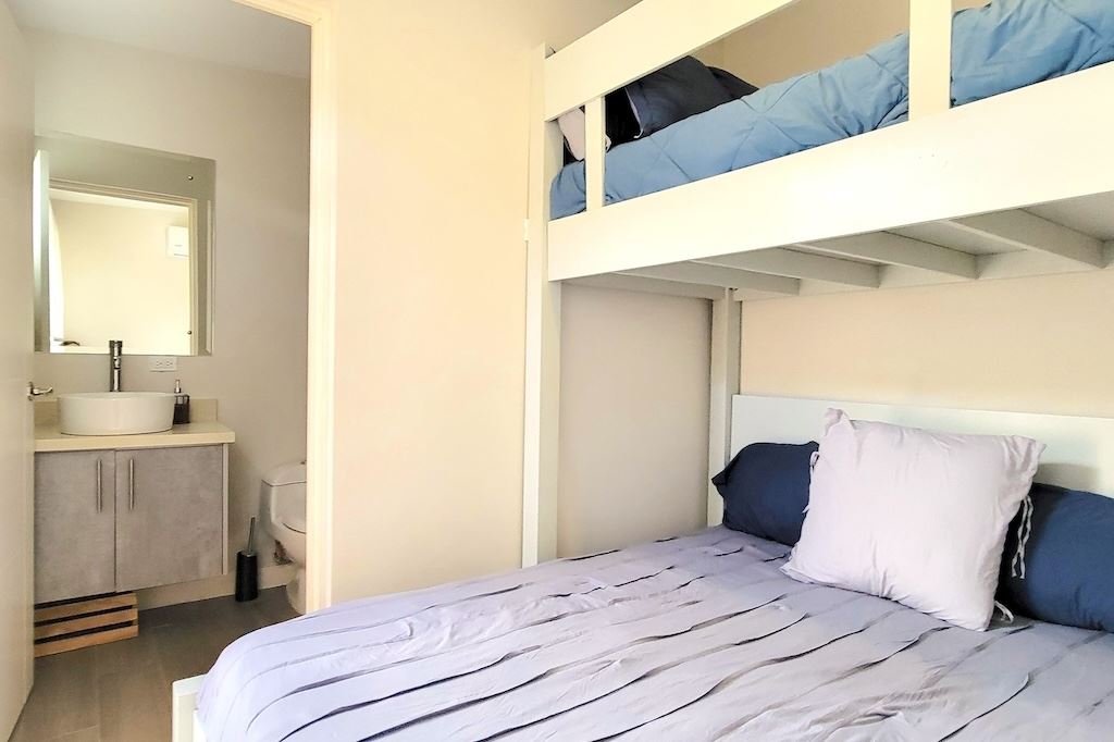 The primary bedroom offers a comfortable and functional layout, complemented by high-end finishes in the ensuite bathroom. The second bedroom includes a queen-size bed and built-in closets, and shares a Jack-and-Jill bathroom with the third bedroom, which accommodates two double beds, perfect for hosting family and friends. The kitchen and living areas are designed with an open-concept layout, creating an inviting space to gather and enjoy everyday living. Outside, the home is surrounded by a tropical garden that serves as a blank canvas for the new owner to design a beautiful terrace, add more flowers, or enhance the landscaping to their taste. Additional storage is conveniently located next to the laundry area, and the property includes two parking spaces.