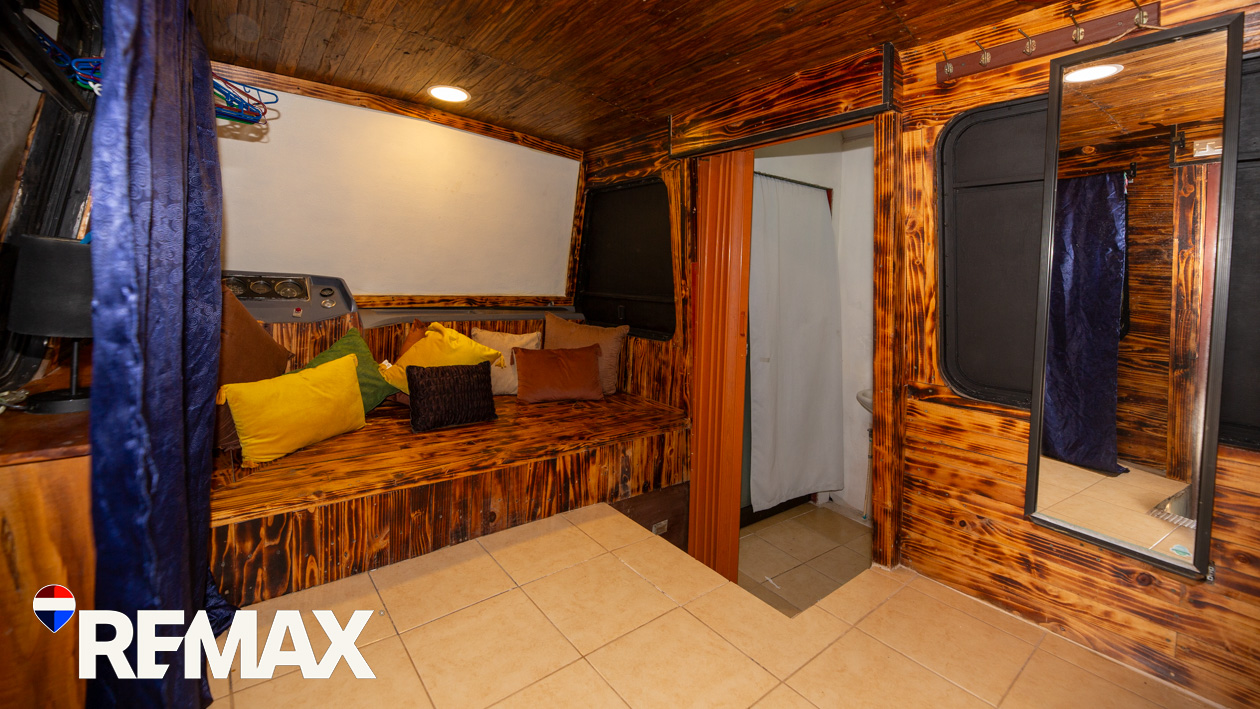 Up front the ocean view tower has a full master suite on the top floor, a middle floor with a common kitchen, four bedrooms and three and a half baths, and the bottom floor with potential commercial space and another one bedroom apartment. And no, your eyes do not deceive you, that is a bus in the living room housing another bedroom and bathroom.