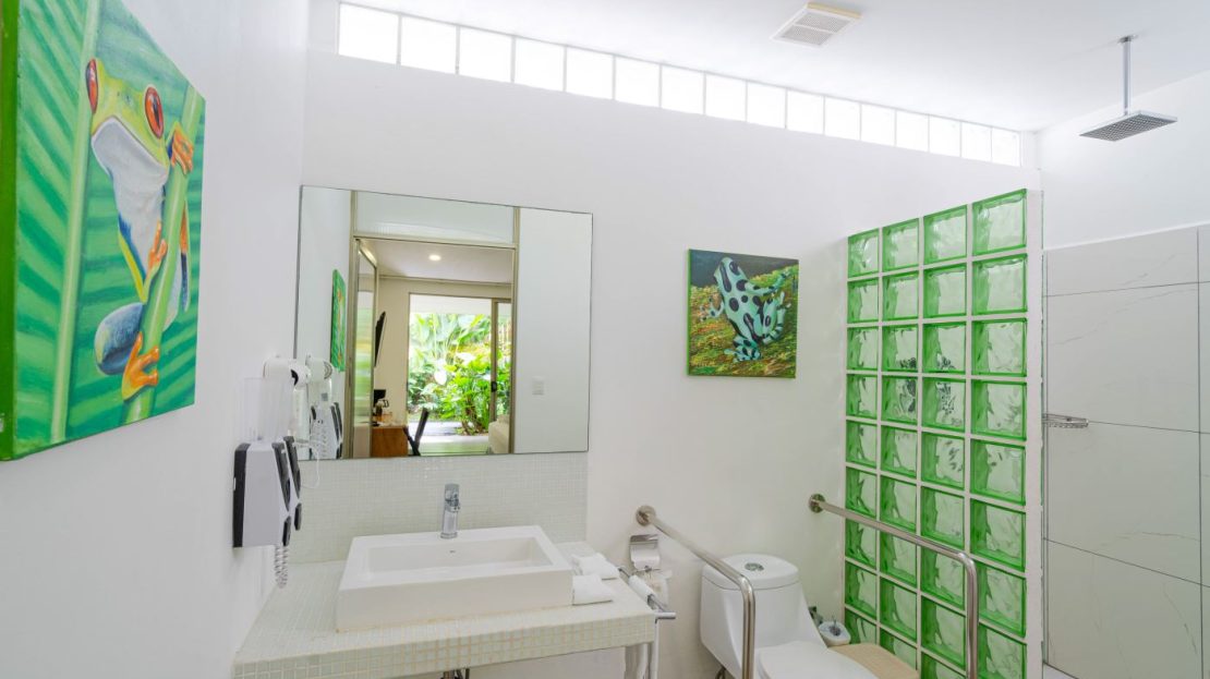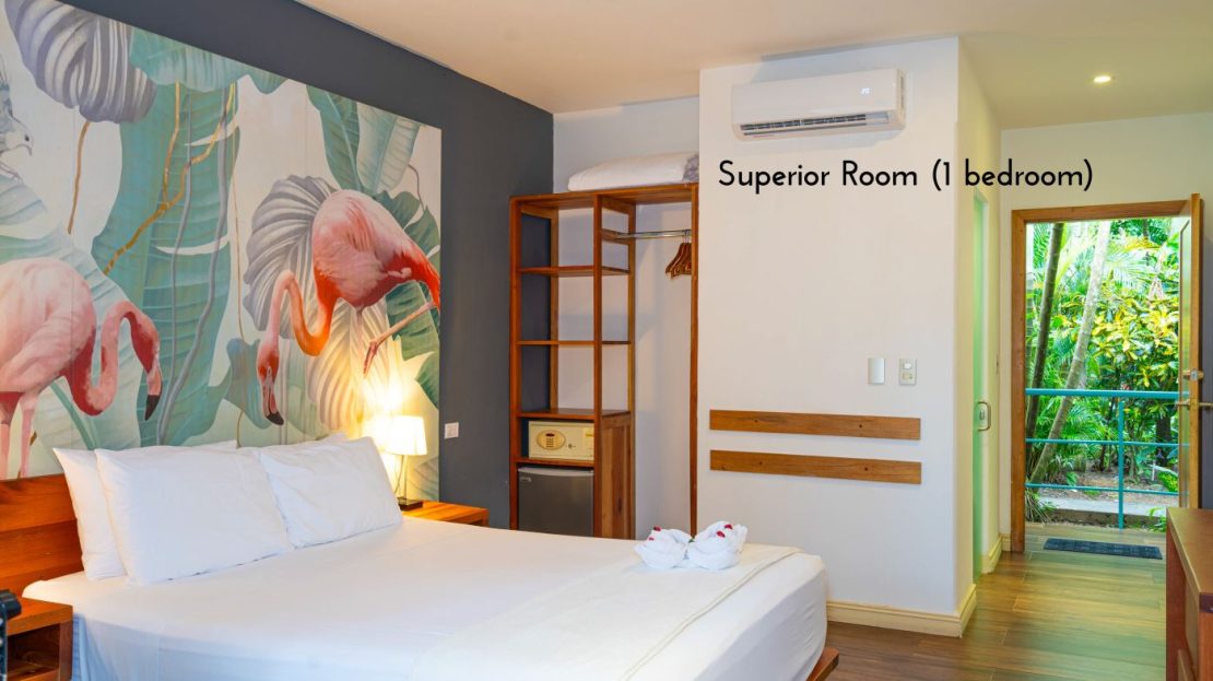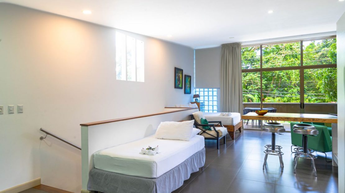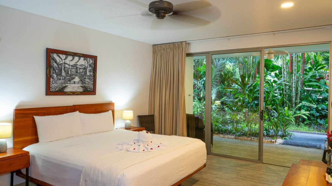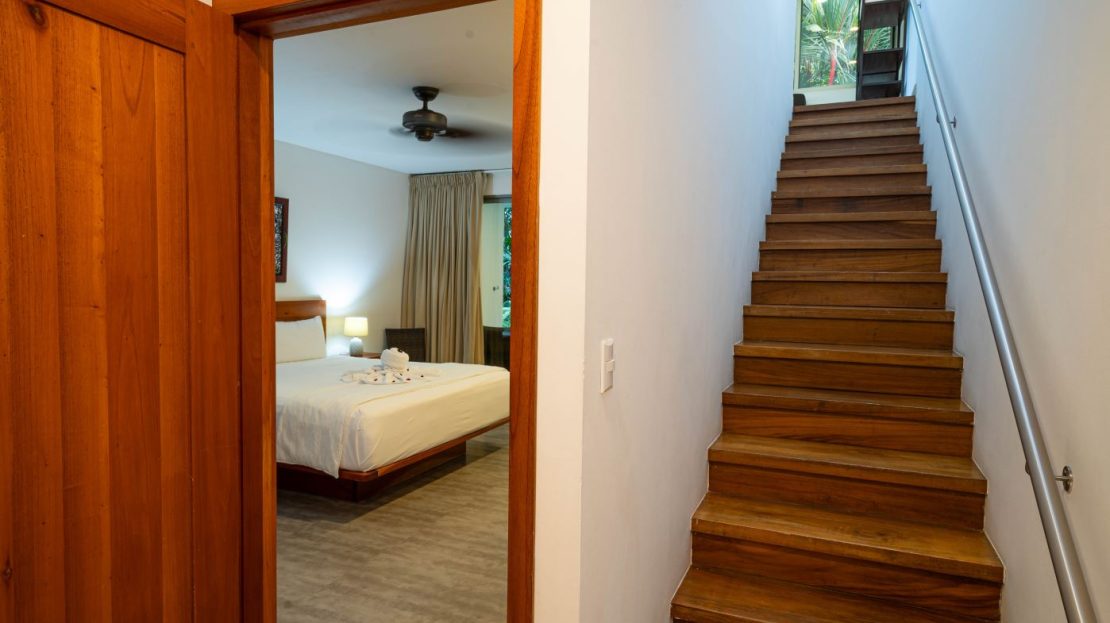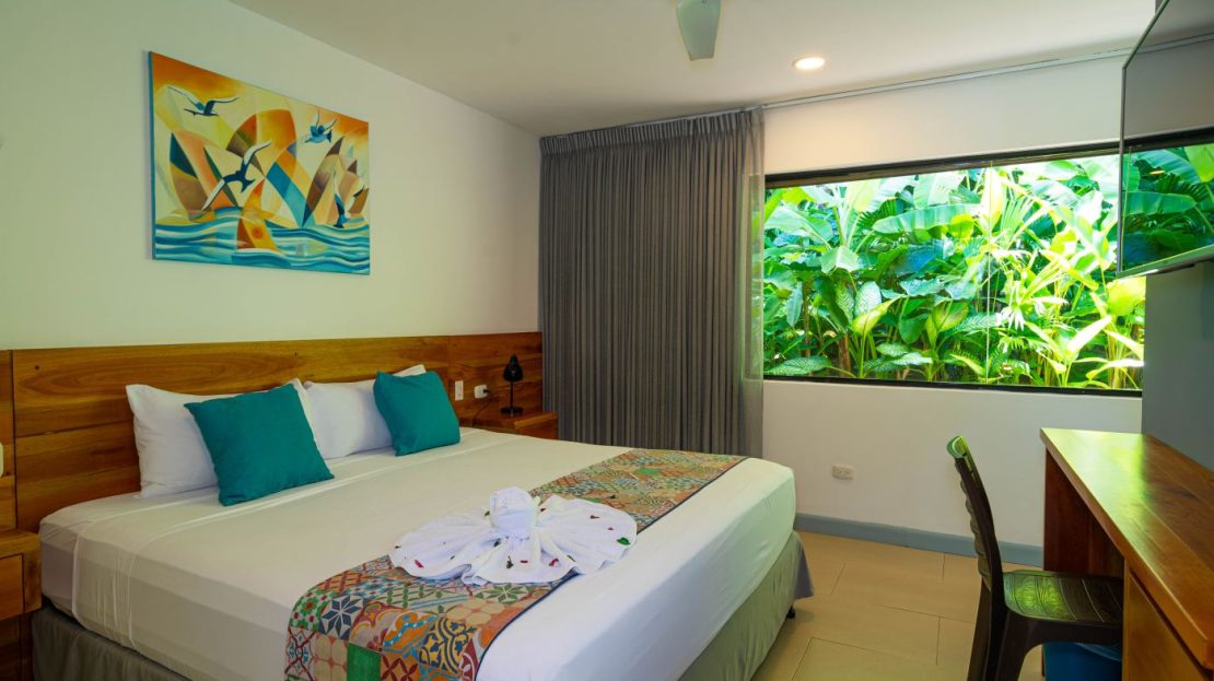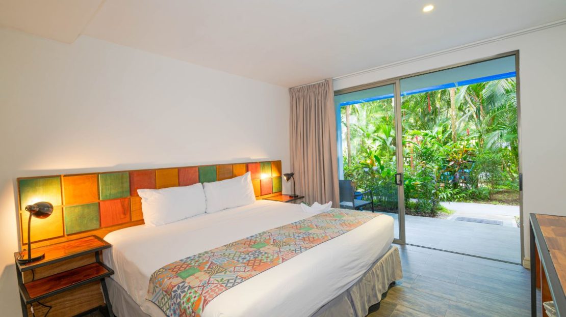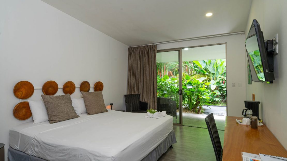 Las habitaciones —Standard, Superior, Deluxe y Suites— están equipadas con sábanas de algodón egipcio, aire acondicionado, baños modernos, televisores y terrazas privadas con vistas a la piscina o jardines tropicales. Los huéspedes disfrutan de encuentros diarios con monos, perezosos, tucanes y mariposas, una verdadera experiencia costarricense.