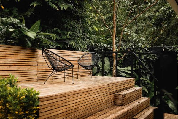 Plataforma elevada para yoga y ejercicio, ideal para clases, meditación o movimiento consciente bajo el dosel del bosque