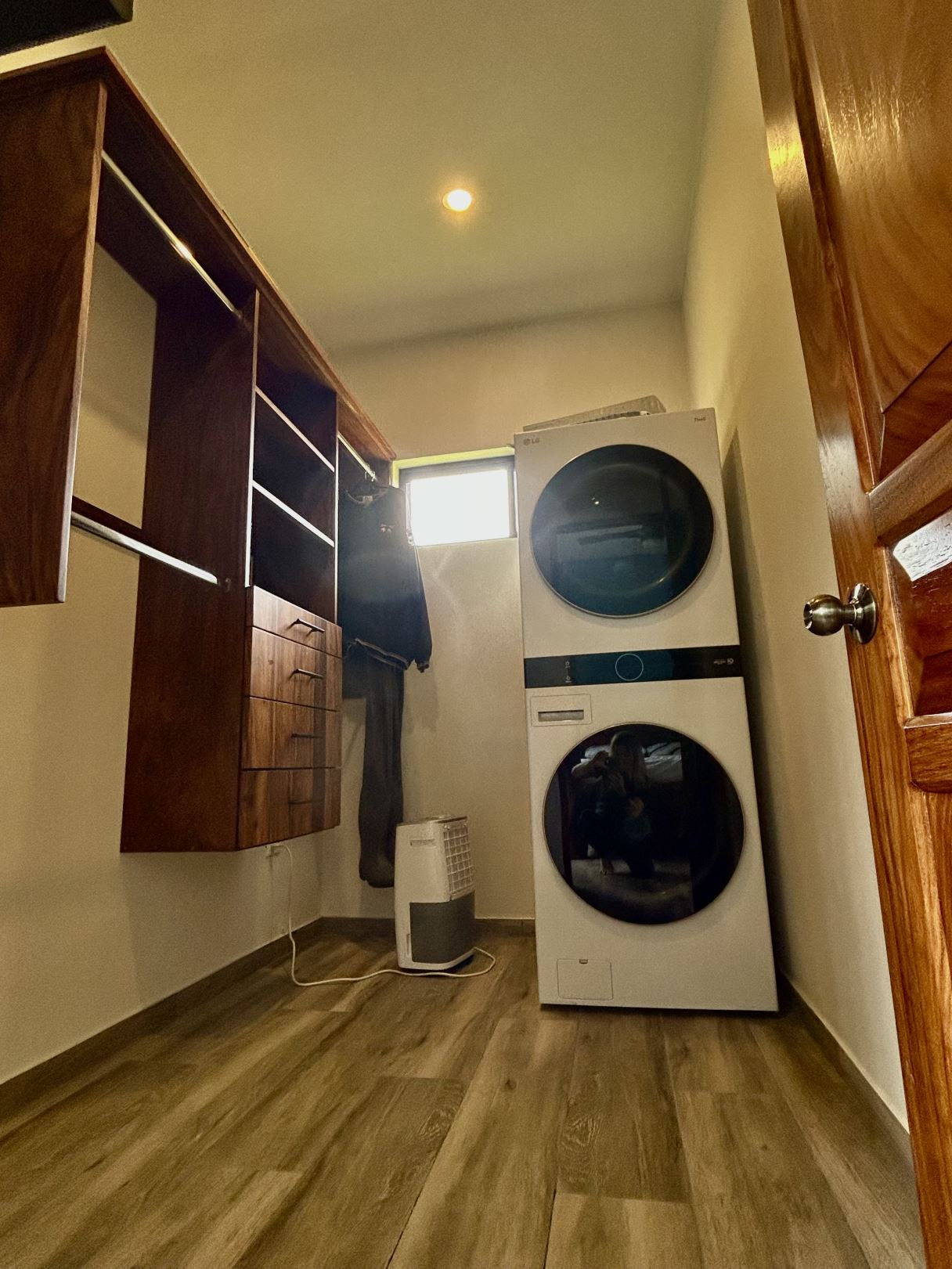 La espaciosa suite principal incluye un lujoso baño en suite con ducha a ras de suelo, elegantes griferías y un vestidor con lavadora/secadora apiladas, caja fuerte empotrada y amplio espacio de almacenamiento.