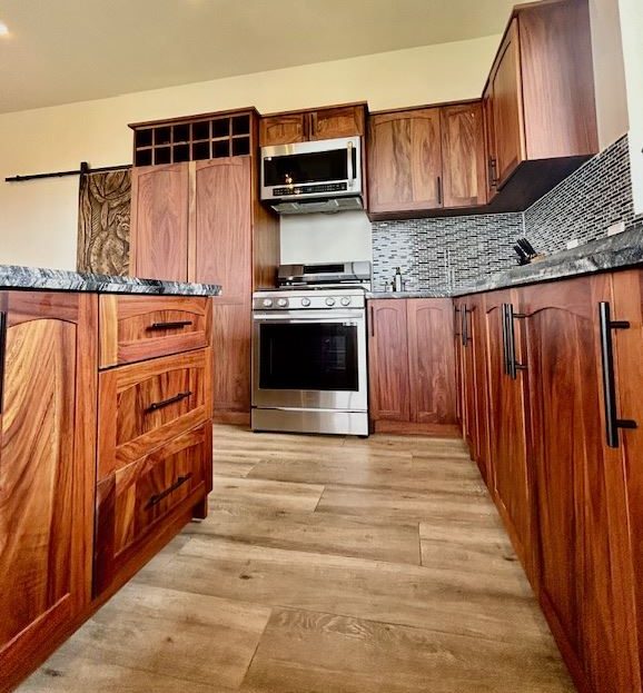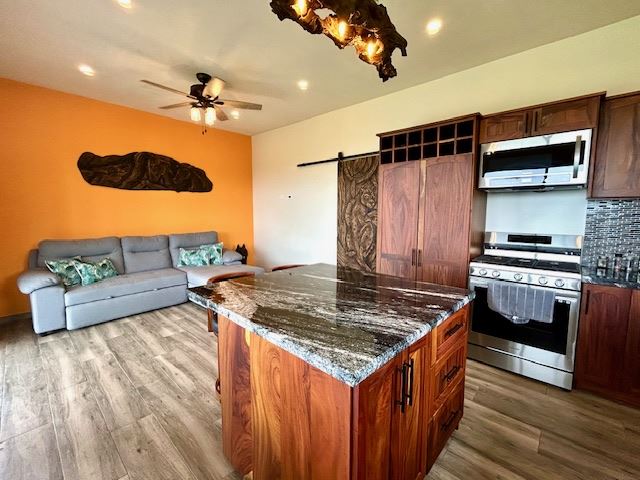 Step inside to an open-plan kitchen featuring a mobile central island, granite countertops, self-closing cabinetry, and top-quality appliances including a Samsung gas oven, Samsung built in microwave, LG refrigerator and delf draining dehumidifier. The kitchen flows into a comfortable living room and transitions seamlessly to the covered 408 m2 terrace, where the outdoor dining area invites you to enjoy warm breezes and spectacular lake views. The expansive deck functions as a natural extension of the living space, ideal for entertaining, relaxing, or simply watching the sunrise and sunset over the lake.