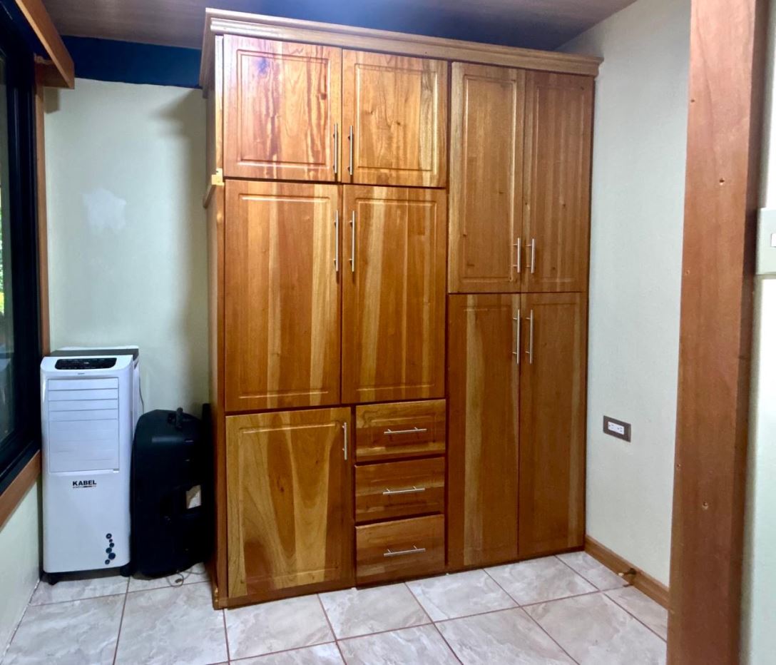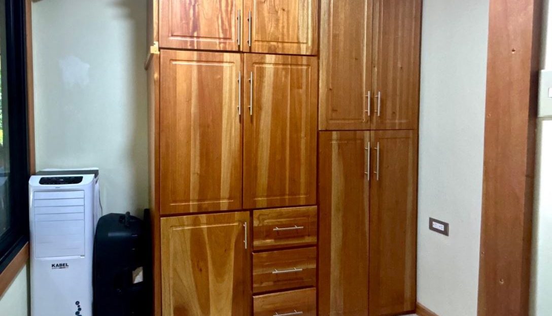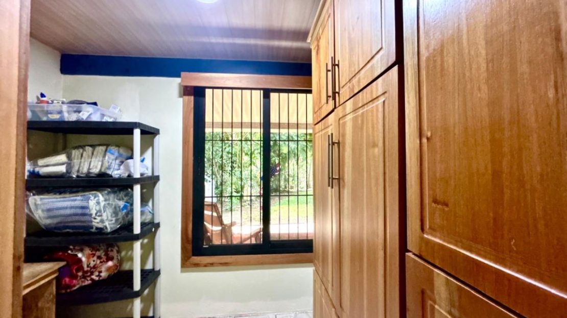 En este nivel también se encuentra un amplio dormitorio con muebles de madera empotrados, ideal para visitas o para quienes prefieren vivir en un solo nivel. A su lado, un espacio multifuncional con almacenamiento incorporado puede utilizarse como despensa, área de almacenamiento o incluso convertirse en oficina con vista a los jardines. En toda la casa se destacan soluciones de almacenamiento en madera cuidadosamente diseñadas, como closets, gabinetes y estanterías, aportando funcionalidad y confort diario.