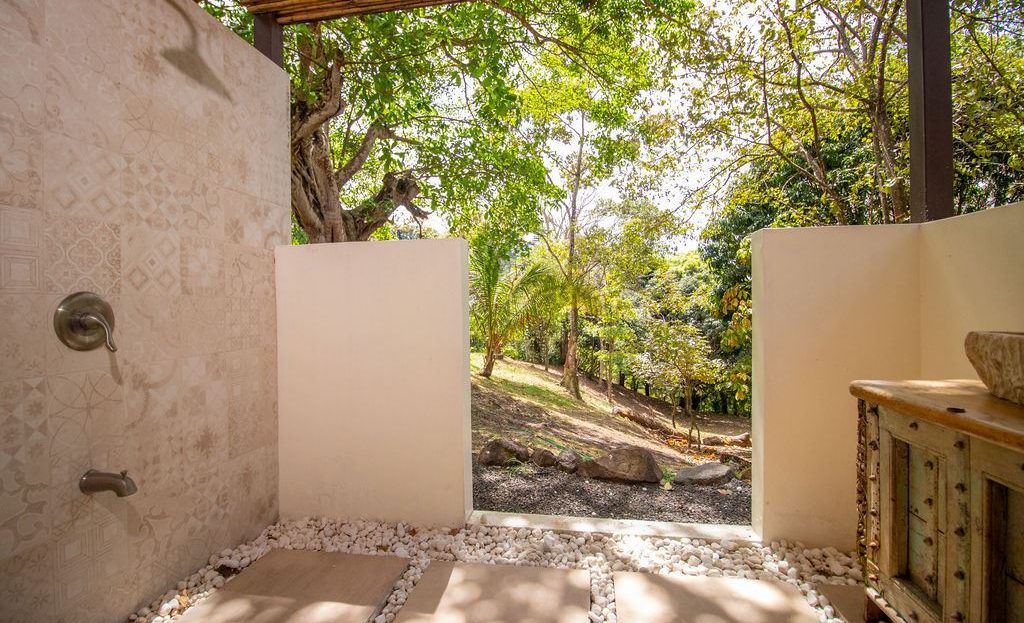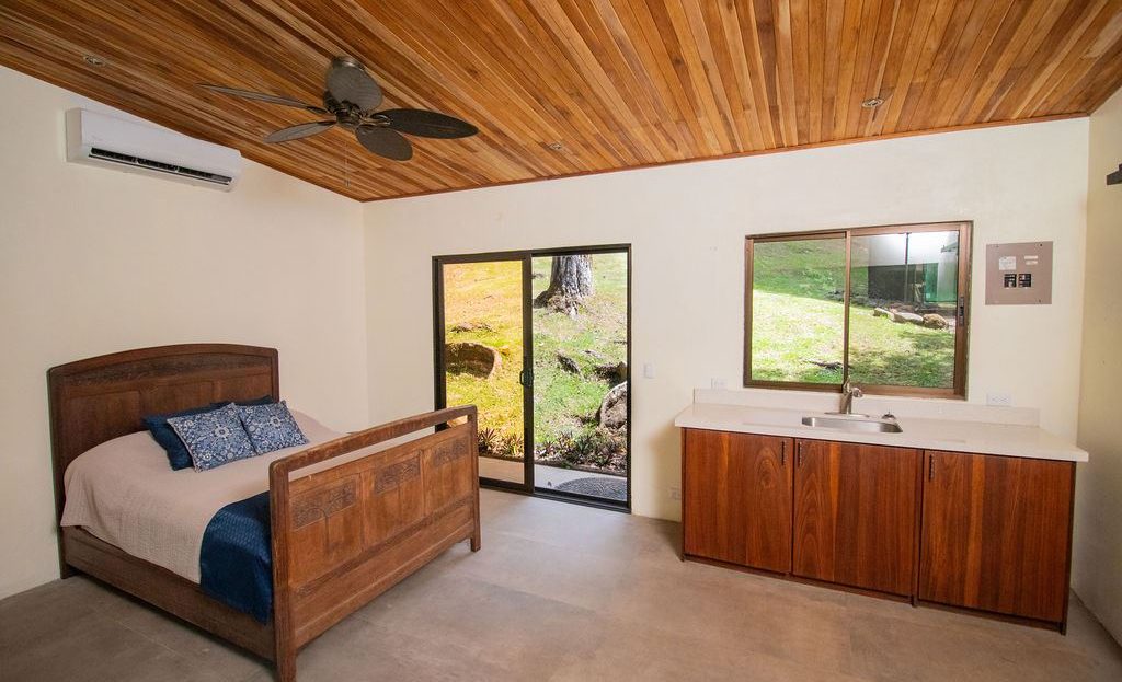 The 1-bedroom, 1-bathroom studio guesthouse offers even more flexibility—ideal for an office, gym, or private retreat. It is equipped with a small kitchen, closet space, an outdoor shower, and a sitting area under the trees.