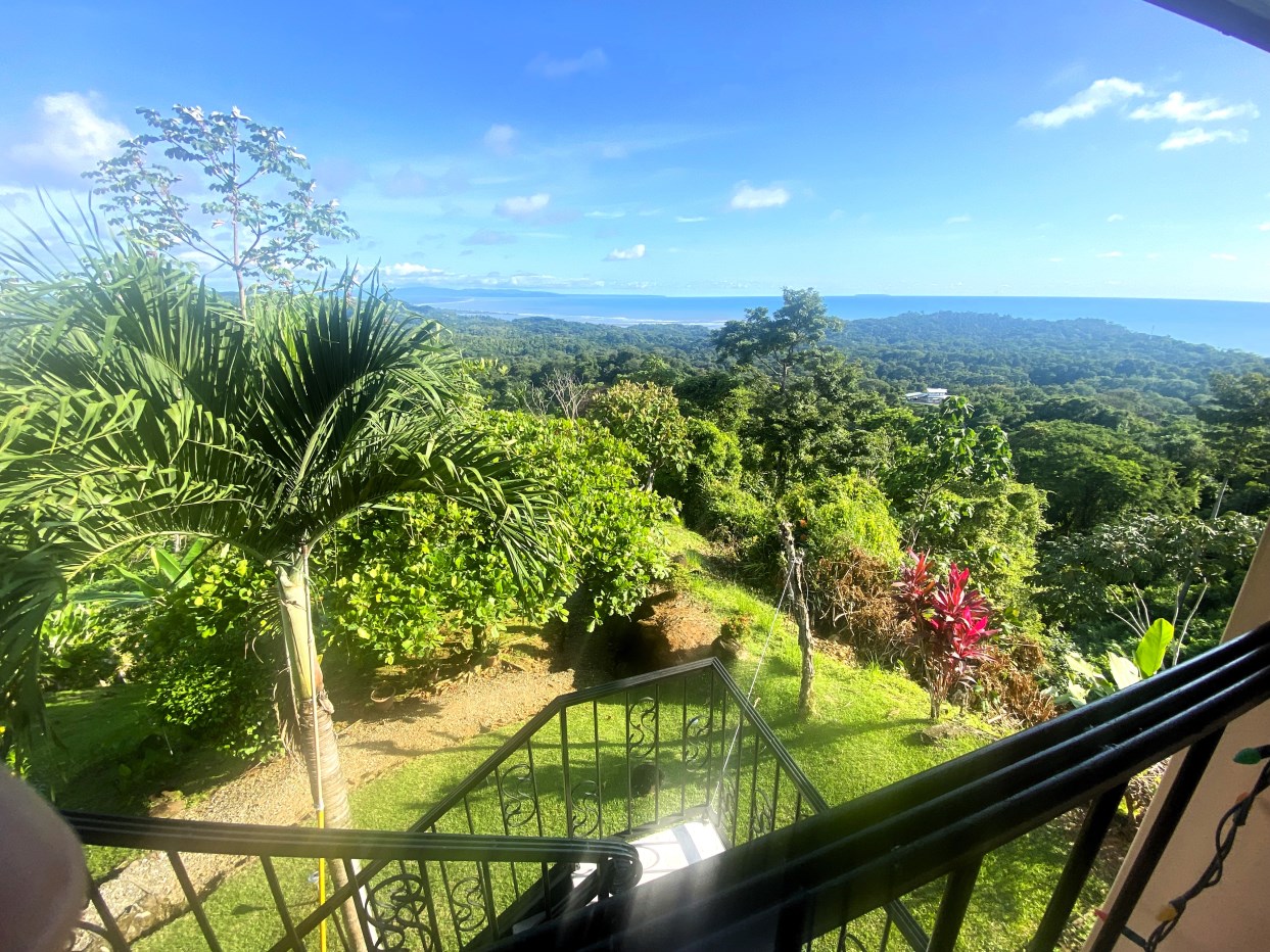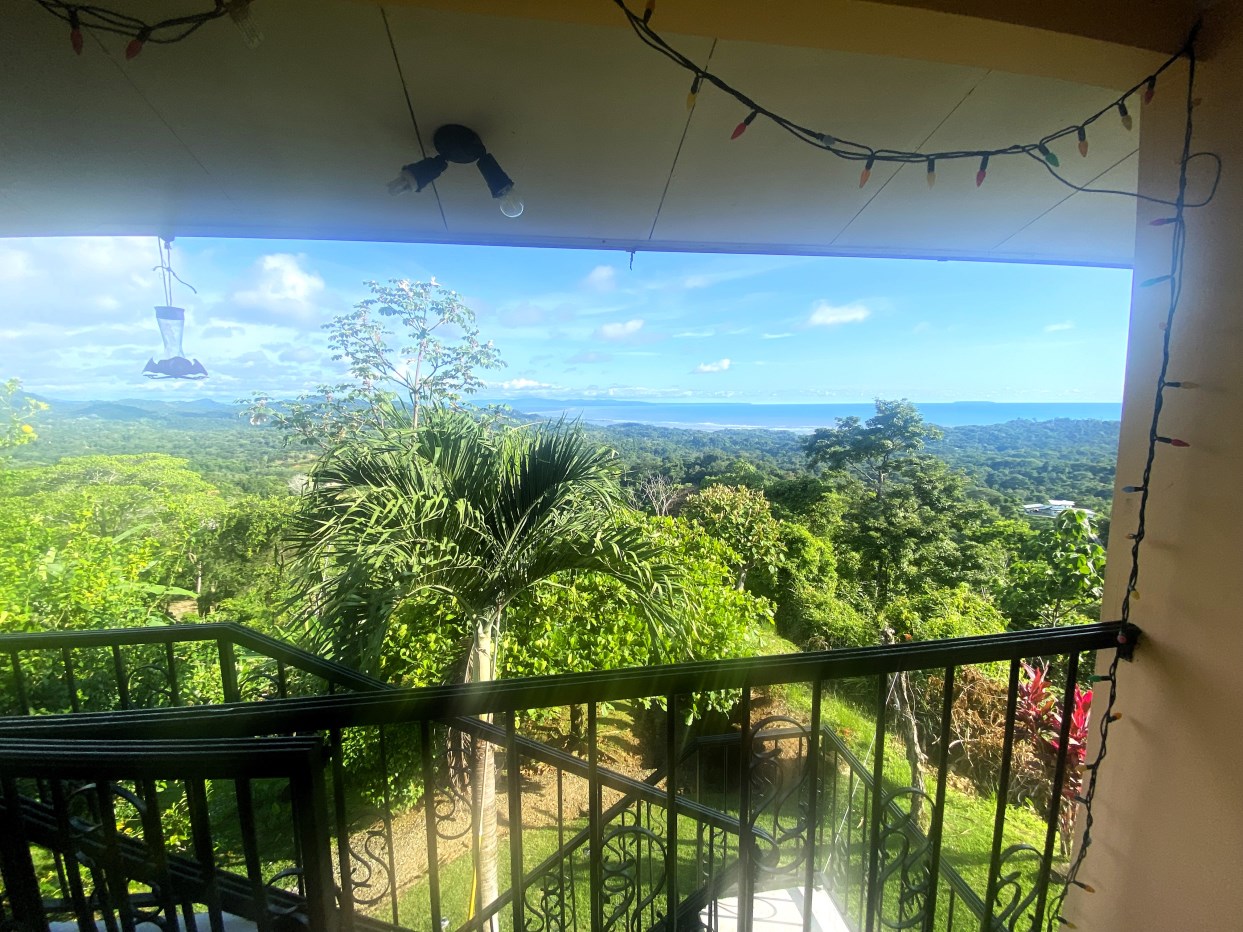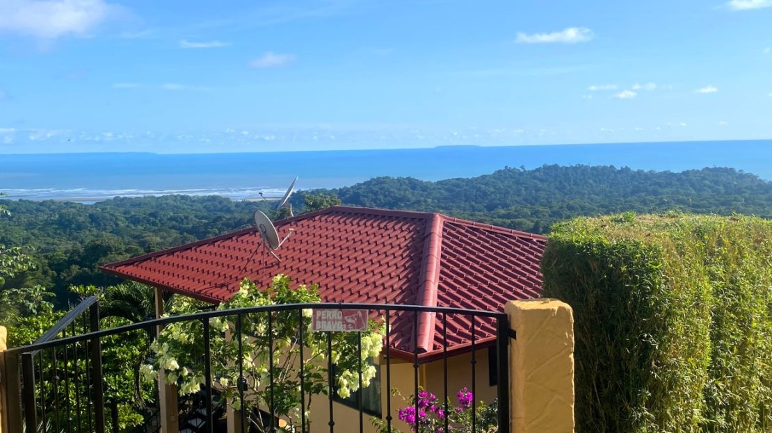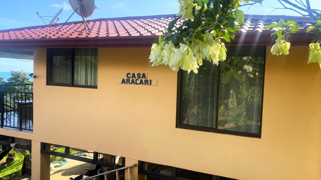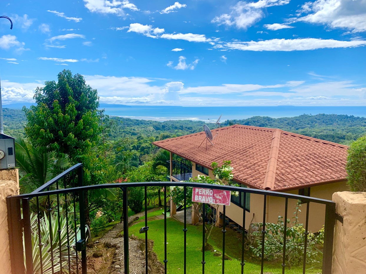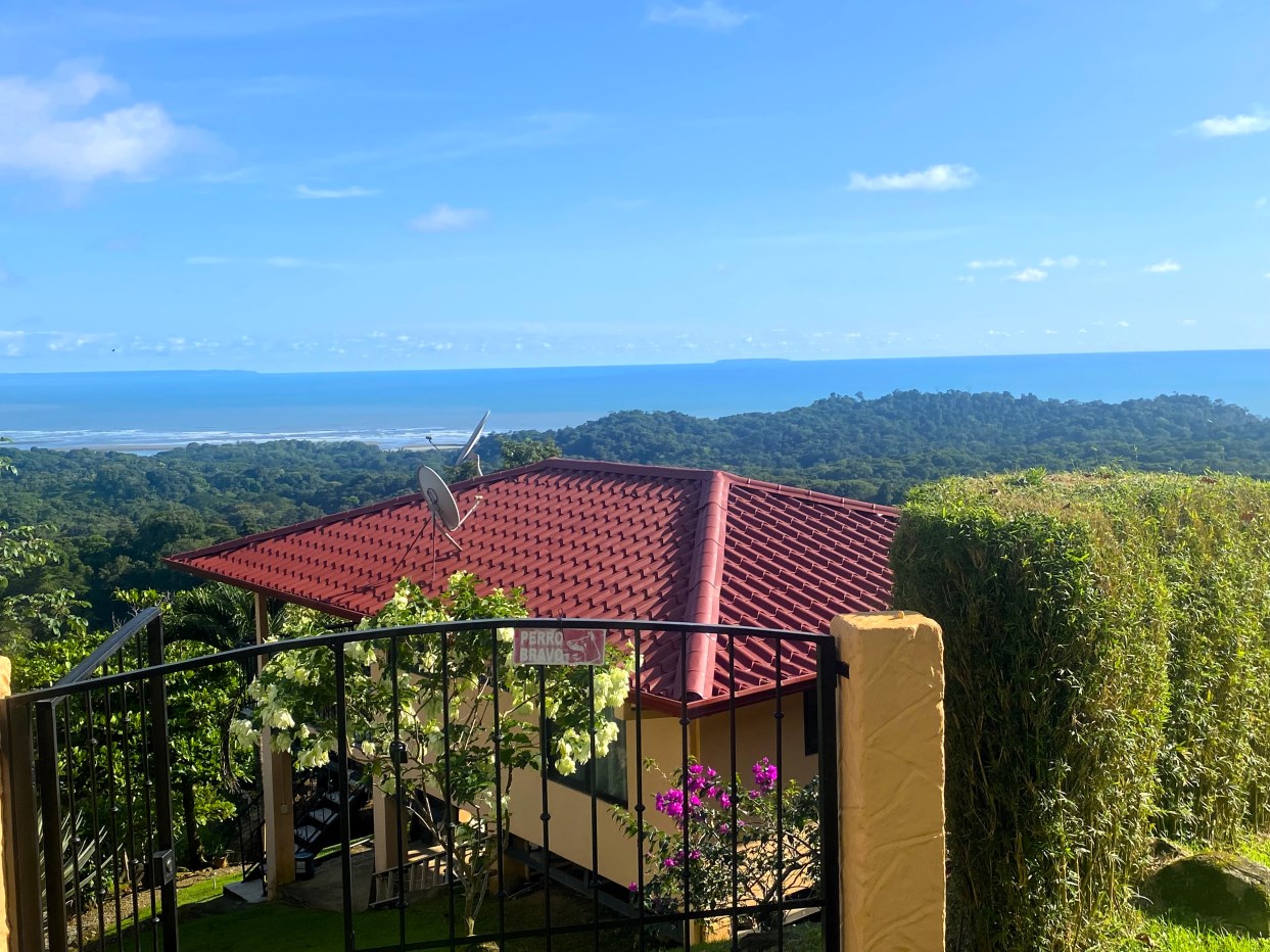 Casa Aracari is a 2 bedroom house with one of the most stunning views of the Pacific Ocean and rain forest in all of Ojochal. Situated at the top of a hill in a gated community , it is about 700 ft above sea level. Built on steel and concrete pillars, the living areas of the house are all on the second floor which allows you to look down on the birds flying and even into their nests. The sounds of nature totally surround you.The tiled outside patio overlooks Casa Aracari’s very large garden. From the patio, a front door leads you in to a living room and kitchen area. The kitchen has a built in breakfast bar with stools, a 4 burner electric stove/oven , a single door fridge/freezer and a microwave built into wooden wall shelving. To the left of the front door after entering there are 2 bedrooms and a bathroom. The Stunning View Bedroom with windows to the 200 degree Pacific view and rain forest valley literally directly below you; the full bathroom and the second bedroom which has room for a Queen bed and a single bed and has views of the virgin rain forest valley right below. Although originally built as a guest house, Casa Aracari was wired for possible expansion as it has a large ground floor area under the patio/living room that could be walled in and used as a third bedroom, an office or exercise room or laundry room. The laundry is currently done in the open area underneath the house which has a concrete floor and a laundry sized basin with hot and cold water.The house also has a fiber optic cable junction box less than 30 feet away so super high speed internet is available if needed. Otherwise internet can either come wirelessly from the ICE tower which is in direct sight 2 km away and has a 5 bar signal, or from Skyfiber, using a small dish.The gardens have everything from various flowers to mature banana, coconut and lemon trees. For the scarlet macaws that land within 30 ft of the balcony there are mature almond trees for them to feed on.There is also plenty of room to put in a swimming pool 20 feet away from the house & even room to dramatically expand the house or even build another house on the very large lot . Soil testing has been done to confirm the soil is good for building a pool and another house.Ojochal is renowned as the best culinary village in all of Costa Rica and the village has its own free-to-use library, soccer pitch and community hall where the farmers bring their fresh produce every week.The owners had planned to build a large outside patio all around the house plus a pool, but physical health issues have made them decide to sell.