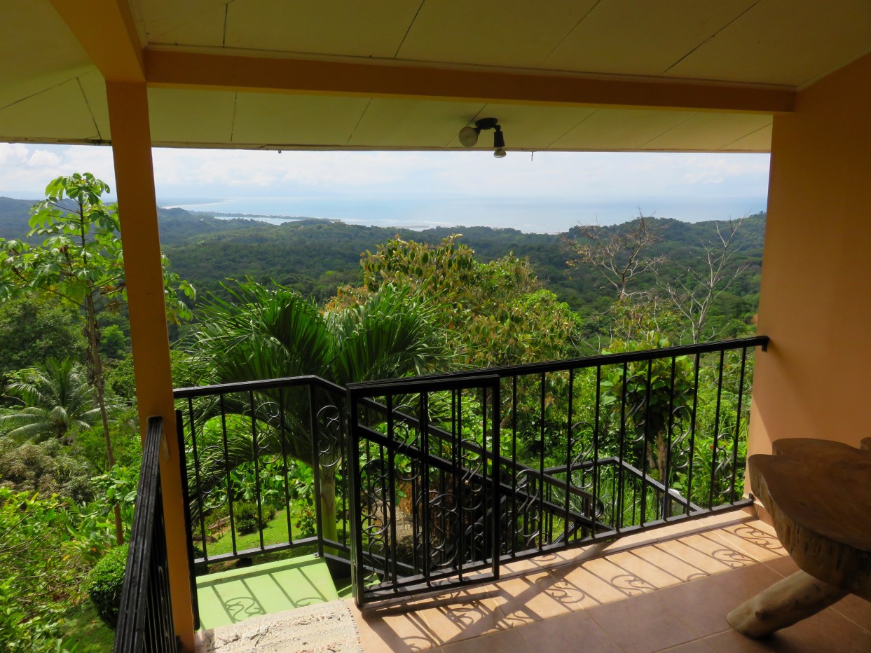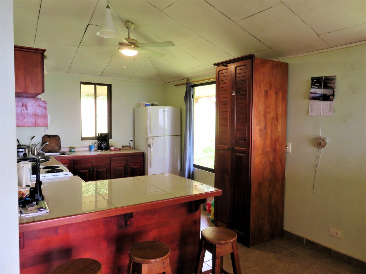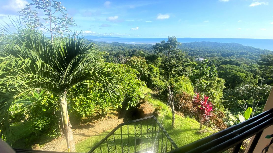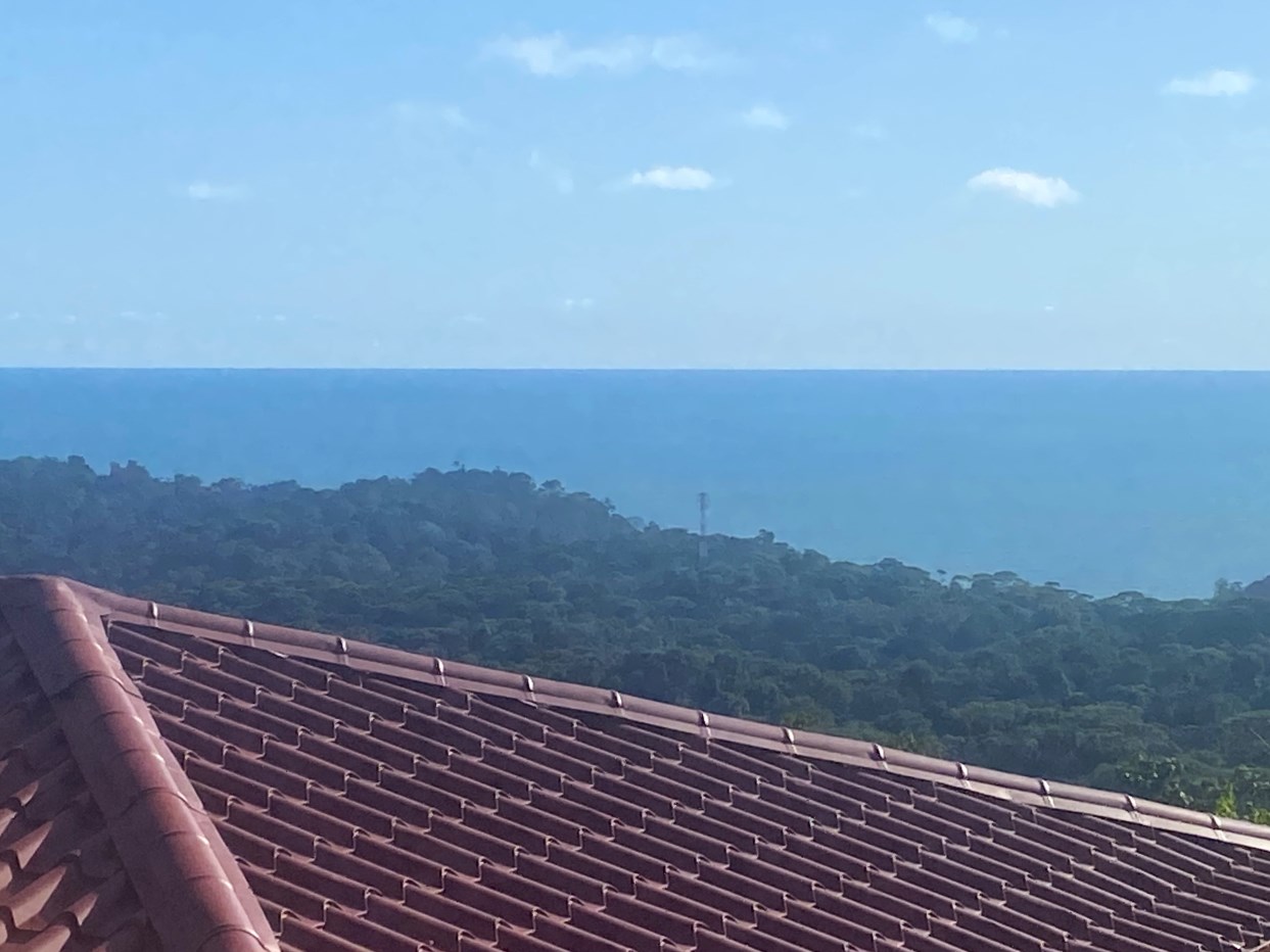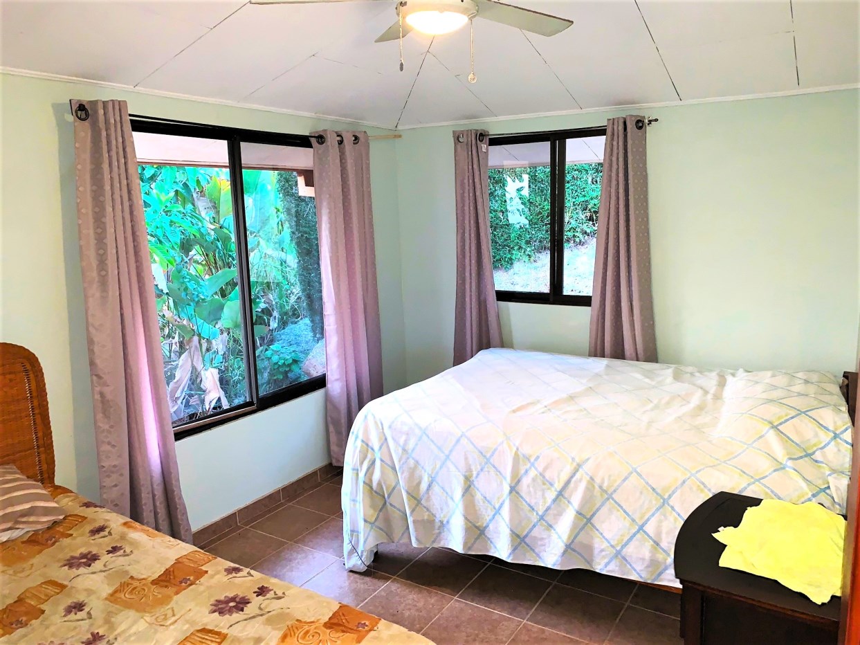 Casa Aracari is a 2 bedroom house with one of the most stunning views of the Pacific Ocean and rain forest in all of Ojochal. Situated at the top of a hill in a gated community , it is about 700 ft above sea level. Built on steel and concrete pillars, the living areas of the house are all on the second floor which allows you to look down on the birds flying and even into their nests. The sounds of nature totally surround you.The tiled outside patio overlooks Casa Aracari’s very large garden. From the patio, a front door leads you in to a living room and kitchen area. The kitchen has a built in breakfast bar with stools, a 4 burner electric stove/oven , a single door fridge/freezer and a microwave built into wooden wall shelving. To the left of the front door after entering there are 2 bedrooms and a bathroom. The Stunning View Bedroom with windows to the 200 degree Pacific view and rain forest valley literally directly below you; the full bathroom and the second bedroom which has room for a Queen bed and a single bed and has views of the virgin rain forest valley right below. Although originally built as a guest house, Casa Aracari was wired for possible expansion as it has a large ground floor area under the patio/living room that could be walled in and used as a third bedroom, an office or exercise room or laundry room. The laundry is currently done in the open area underneath the house which has a concrete floor and a laundry sized basin with hot and cold water.The house also has a fiber optic cable junction box less than 30 feet away so super high speed internet is available if needed. Otherwise internet can either come wirelessly from the ICE tower which is in direct sight 2 km away and has a 5 bar signal, or from Skyfiber, using a small dish.The gardens have everything from various flowers to mature banana, coconut and lemon trees. For the scarlet macaws that land within 30 ft of the balcony there are mature almond trees for them to feed on.There is also plenty of room to put in a swimming pool 20 feet away from the house & even room to dramatically expand the house or even build another house on the very large lot . Soil testing has been done to confirm the soil is good for building a pool and another house.Ojochal is renowned as the best culinary village in all of Costa Rica and the village has its own free-to-use library, soccer pitch and community hall where the farmers bring their fresh produce every week.The owners had planned to build a large outside patio all around the house plus a pool, but physical health issues have made them decide to sell.