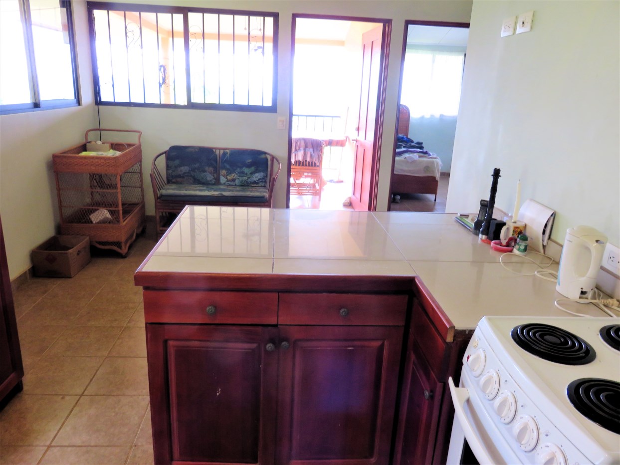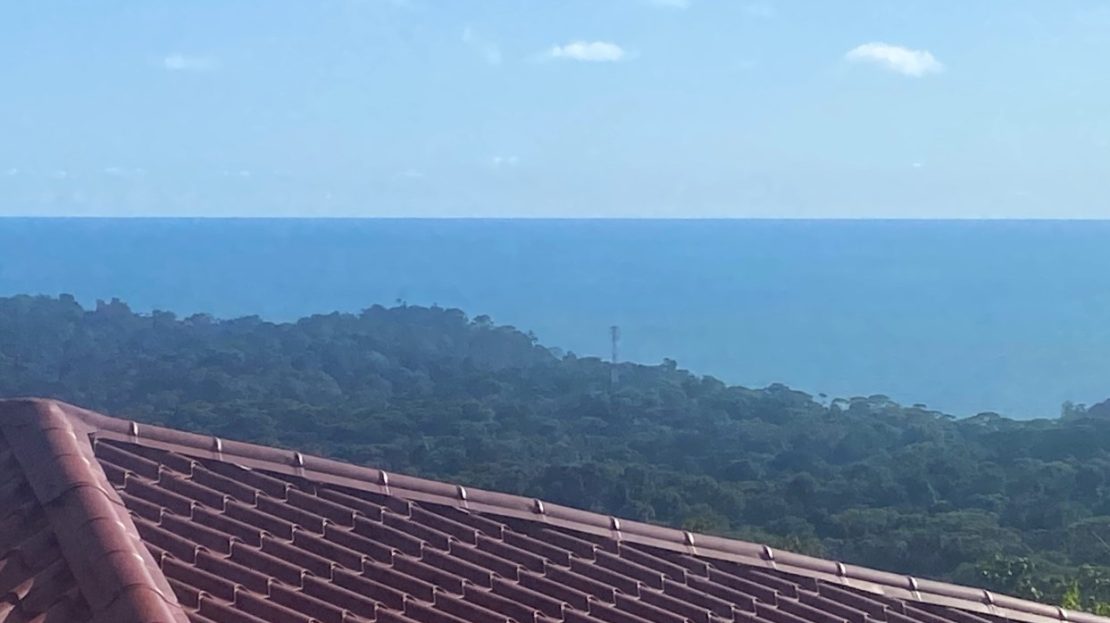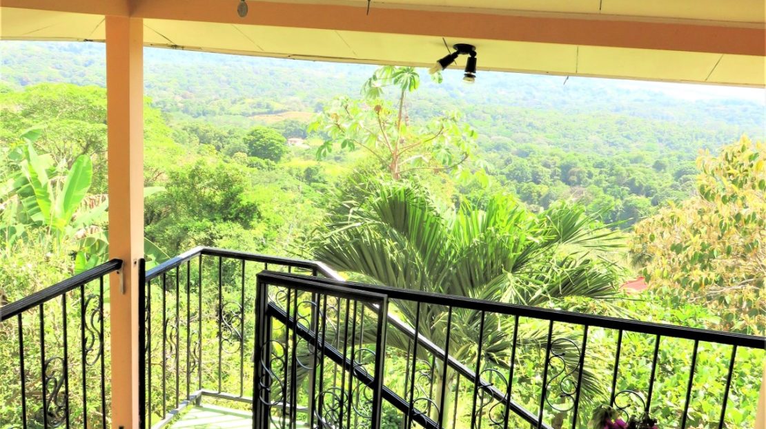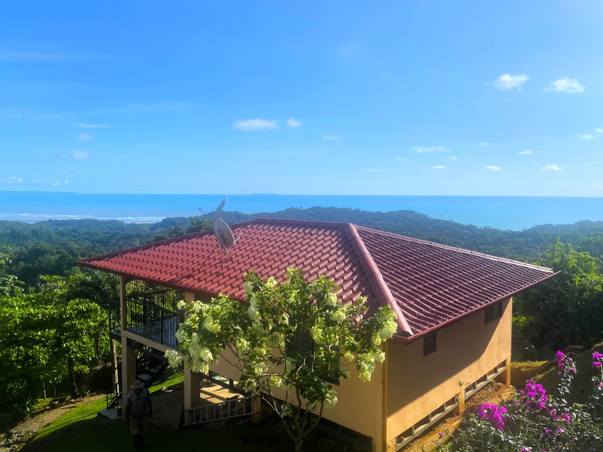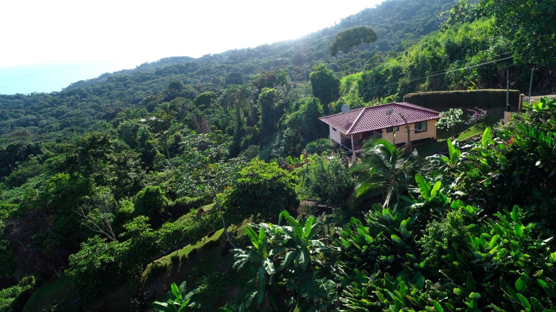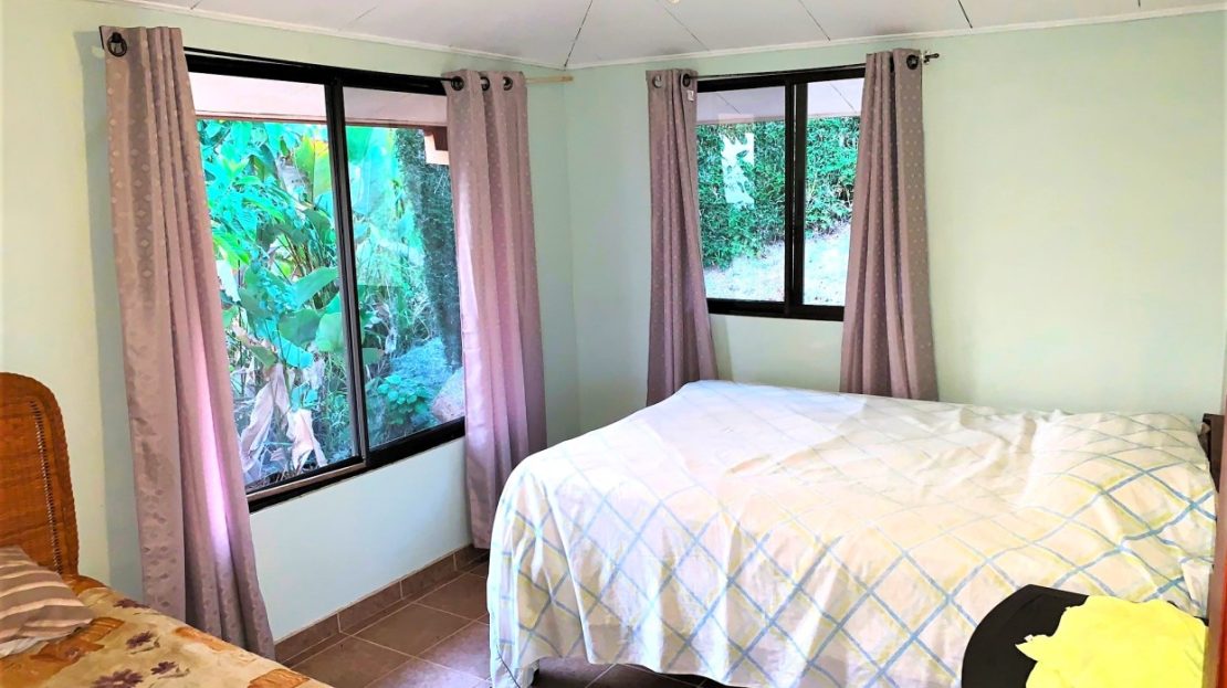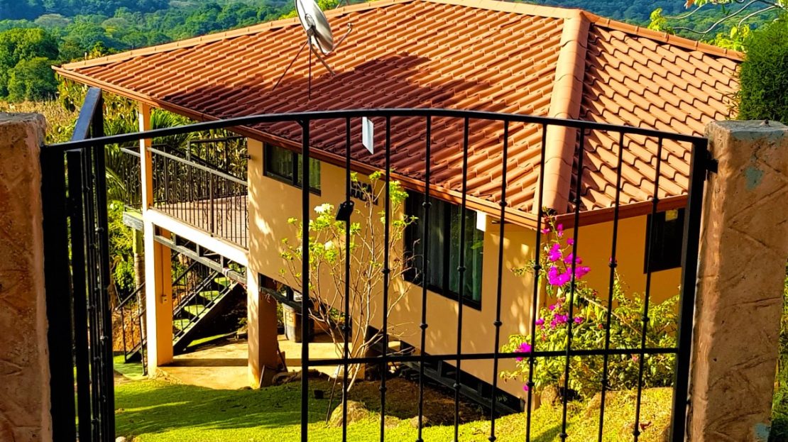 Casa Aracari is a 2 bedroom house with one of the most stunning views of the Pacific Ocean and rain forest in all of Ojochal. Situated at the top of a hill in a gated community , it is about 700 ft above sea level. Built on steel and concrete pillars, the living areas of the house are all on the second floor which allows you to look down on the birds flying and even into their nests. The sounds of nature totally surround you.The tiled outside patio overlooks Casa Aracari’s very large garden. From the patio, a front door leads you in to a living room and kitchen area. The kitchen has a built in breakfast bar with stools, a 4 burner electric stove/oven , a single door fridge/freezer and a microwave built into wooden wall shelving. To the left of the front door after entering there are 2 bedrooms and a bathroom. The Stunning View Bedroom with windows to the 200 degree Pacific view and rain forest valley literally directly below you; the full bathroom and the second bedroom which has room for a Queen bed and a single bed and has views of the virgin rain forest valley right below. Although originally built as a guest house, Casa Aracari was wired for possible expansion as it has a large ground floor area under the patio/living room that could be walled in and used as a third bedroom, an office or exercise room or laundry room. The laundry is currently done in the open area underneath the house which has a concrete floor and a laundry sized basin with hot and cold water.The house also has a fiber optic cable junction box less than 30 feet away so super high speed internet is available if needed. Otherwise internet can either come wirelessly from the ICE tower which is in direct sight 2 km away and has a 5 bar signal, or from Skyfiber, using a small dish.The gardens have everything from various flowers to mature banana, coconut and lemon trees. For the scarlet macaws that land within 30 ft of the balcony there are mature almond trees for them to feed on.There is also plenty of room to put in a swimming pool 20 feet away from the house & even room to dramatically expand the house or even build another house on the very large lot . Soil testing has been done to confirm the soil is good for building a pool and another house.Ojochal is renowned as the best culinary village in all of Costa Rica and the village has its own free-to-use library, soccer pitch and community hall where the farmers bring their fresh produce every week.The owners had planned to build a large outside patio all around the house plus a pool, but physical health issues have made them decide to sell.