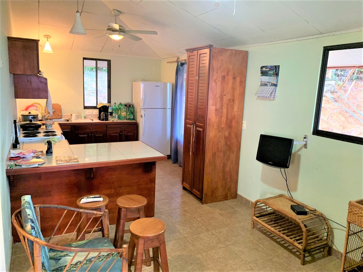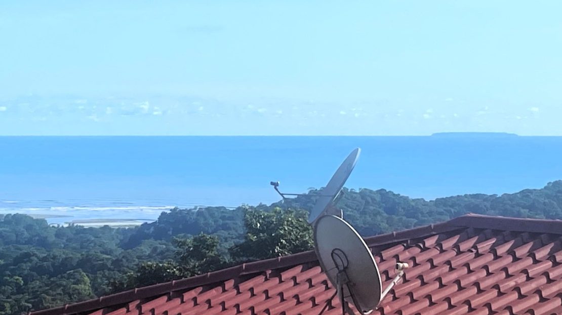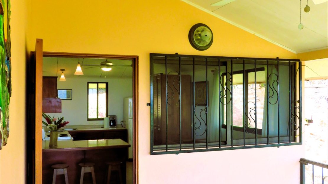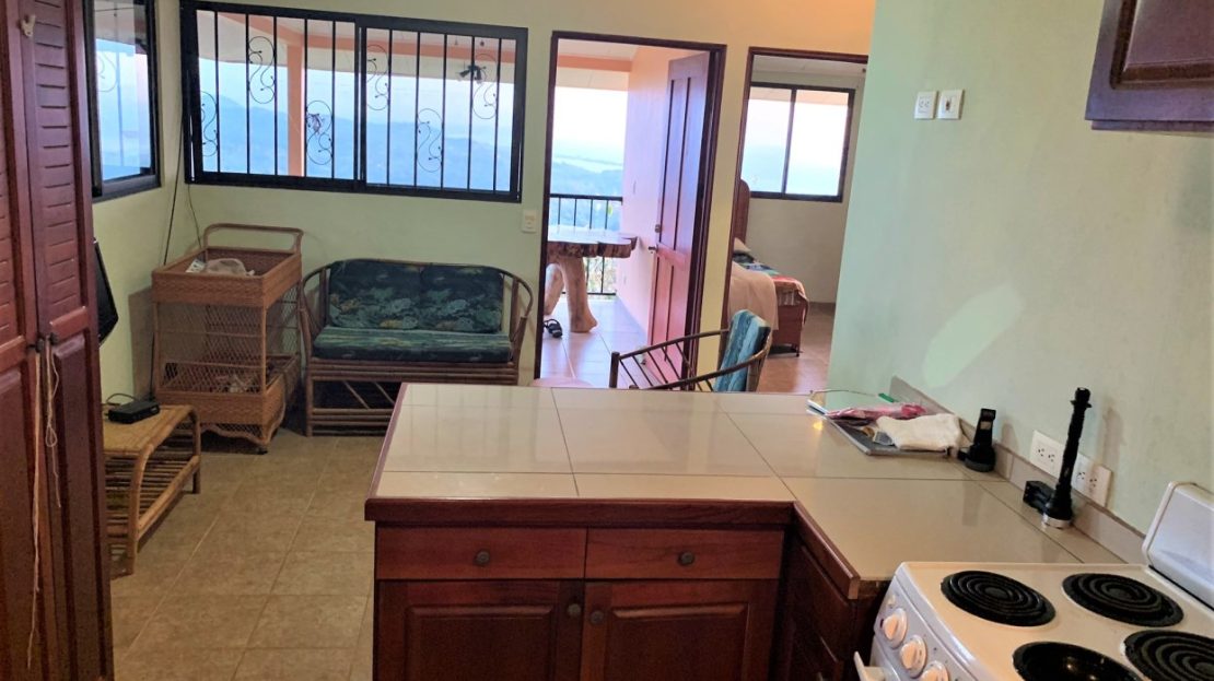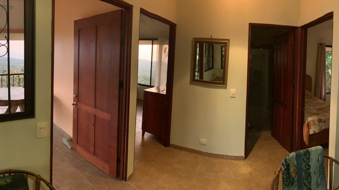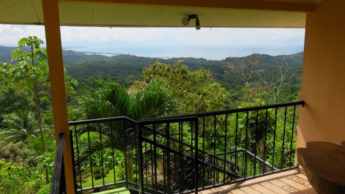 Casa Aracari is a 2 bedroom house with one of the most stunning views of the Pacific Ocean and rain forest in all of Ojochal. Situated at the top of a hill in a gated community , it is about 700 ft above sea level. Built on steel and concrete pillars, the living areas of the house are all on the second floor which allows you to look down on the birds flying and even into their nests. The sounds of nature totally surround you.The tiled outside patio overlooks Casa Aracari’s very large garden. From the patio, a front door leads you in to a living room and kitchen area. The kitchen has a built in breakfast bar with stools, a 4 burner electric stove/oven , a single door fridge/freezer and a microwave built into wooden wall shelving. To the left of the front door after entering there are 2 bedrooms and a bathroom. The Stunning View Bedroom with windows to the 200 degree Pacific view and rain forest valley literally directly below you; the full bathroom and the second bedroom which has room for a Queen bed and a single bed and has views of the virgin rain forest valley right below. Although originally built as a guest house, Casa Aracari was wired for possible expansion as it has a large ground floor area under the patio/living room that could be walled in and used as a third bedroom, an office or exercise room or laundry room. The laundry is currently done in the open area underneath the house which has a concrete floor and a laundry sized basin with hot and cold water.The house also has a fiber optic cable junction box less than 30 feet away so super high speed internet is available if needed. Otherwise internet can either come wirelessly from the ICE tower which is in direct sight 2 km away and has a 5 bar signal, or from Skyfiber, using a small dish.The gardens have everything from various flowers to mature banana, coconut and lemon trees. For the scarlet macaws that land within 30 ft of the balcony there are mature almond trees for them to feed on.There is also plenty of room to put in a swimming pool 20 feet away from the house & even room to dramatically expand the house or even build another house on the very large lot . Soil testing has been done to confirm the soil is good for building a pool and another house.Ojochal is renowned as the best culinary village in all of Costa Rica and the village has its own free-to-use library, soccer pitch and community hall where the farmers bring their fresh produce every week.The owners had planned to build a large outside patio all around the house plus a pool, but physical health issues have made them decide to sell.