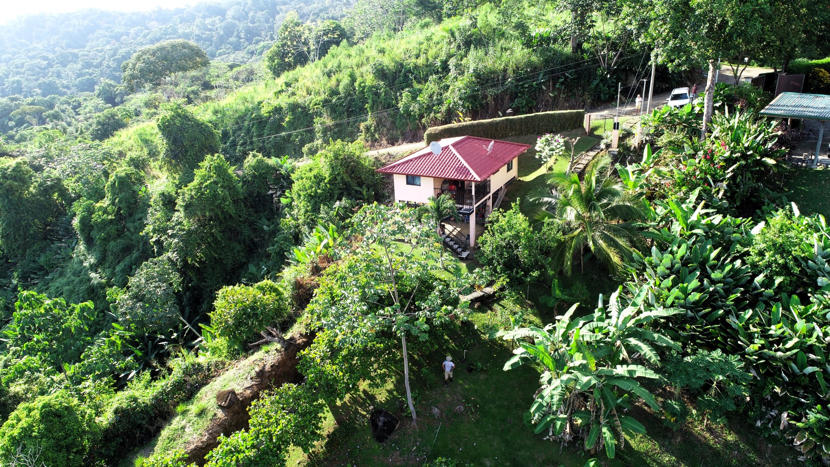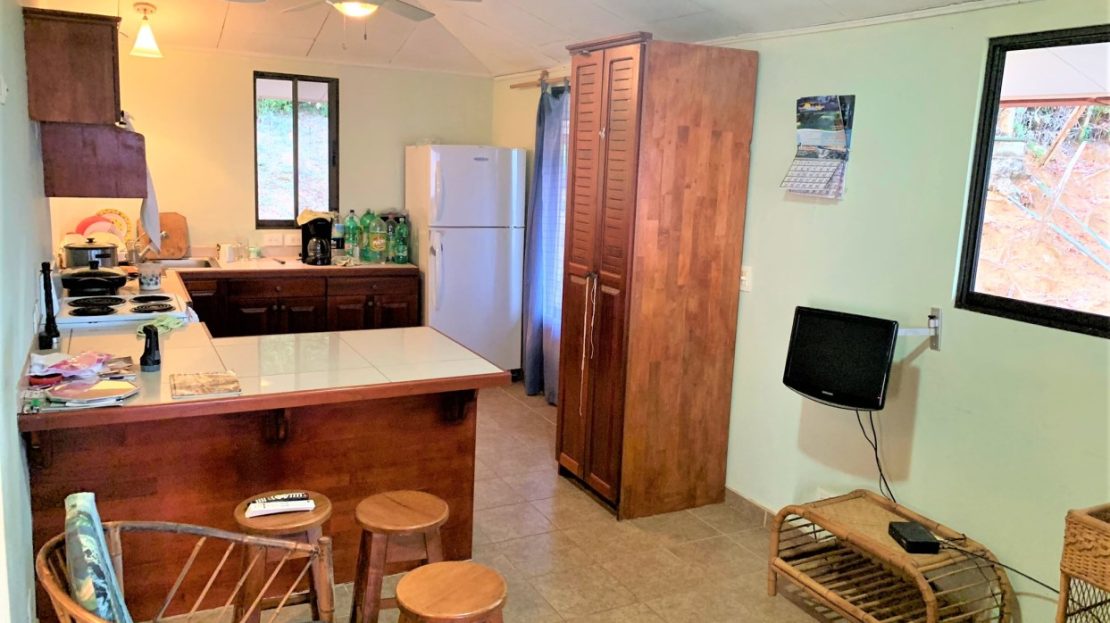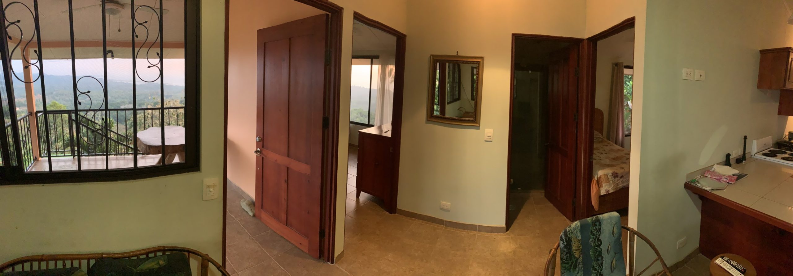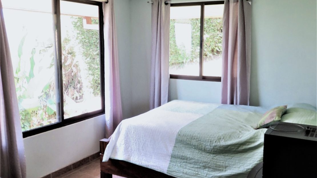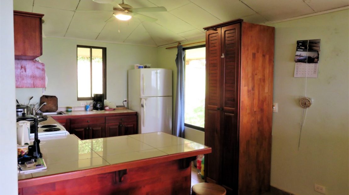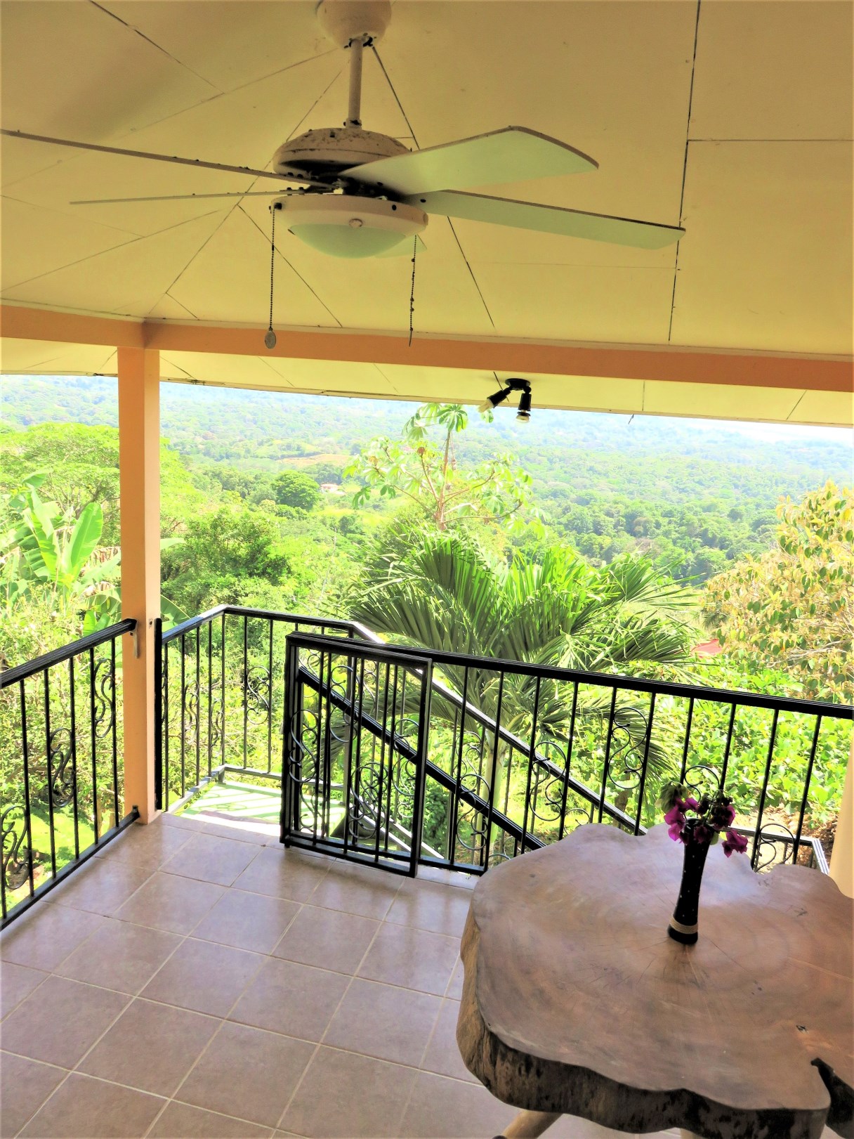 Casa Aracari is a 2 bedroom house with one of the most stunning views of the Pacific Ocean and rain forest in all of Ojochal. Situated at the top of a hill in a gated community , it is about 700 ft above sea level. Built on steel and concrete pillars, the living areas of the house are all on the second floor which allows you to look down on the birds flying and even into their nests. The sounds of nature totally surround you.The tiled outside patio overlooks Casa Aracari’s very large garden. From the patio, a front door leads you in to a living room and kitchen area. The kitchen has a built in breakfast bar with stools, a 4 burner electric stove/oven , a single door fridge/freezer and a microwave built into wooden wall shelving. To the left of the front door after entering there are 2 bedrooms and a bathroom. The Stunning View Bedroom with windows to the 200 degree Pacific view and rain forest valley literally directly below you; the full bathroom and the second bedroom which has room for a Queen bed and a single bed and has views of the virgin rain forest valley right below. Although originally built as a guest house, Casa Aracari was wired for possible expansion as it has a large ground floor area under the patio/living room that could be walled in and used as a third bedroom, an office or exercise room or laundry room. The laundry is currently done in the open area underneath the house which has a concrete floor and a laundry sized basin with hot and cold water.The house also has a fiber optic cable junction box less than 30 feet away so super high speed internet is available if needed. Otherwise internet can either come wirelessly from the ICE tower which is in direct sight 2 km away and has a 5 bar signal, or from Skyfiber, using a small dish.The gardens have everything from various flowers to mature banana, coconut and lemon trees. For the scarlet macaws that land within 30 ft of the balcony there are mature almond trees for them to feed on.There is also plenty of room to put in a swimming pool 20 feet away from the house & even room to dramatically expand the house or even build another house on the very large lot . Soil testing has been done to confirm the soil is good for building a pool and another house.Ojochal is renowned as the best culinary village in all of Costa Rica and the village has its own free-to-use library, soccer pitch and community hall where the farmers bring their fresh produce every week.The owners had planned to build a large outside patio all around the house plus a pool, but physical health issues have made them decide to sell.