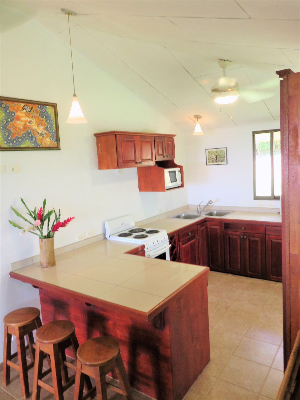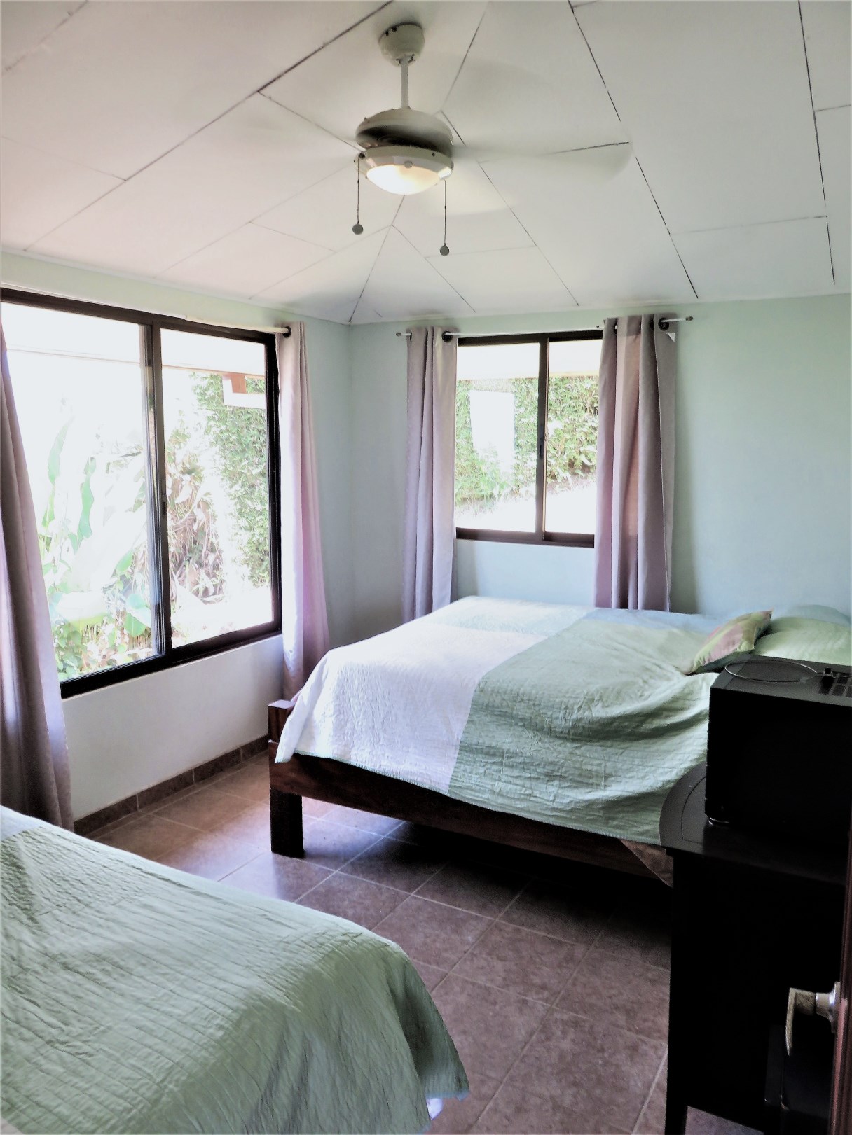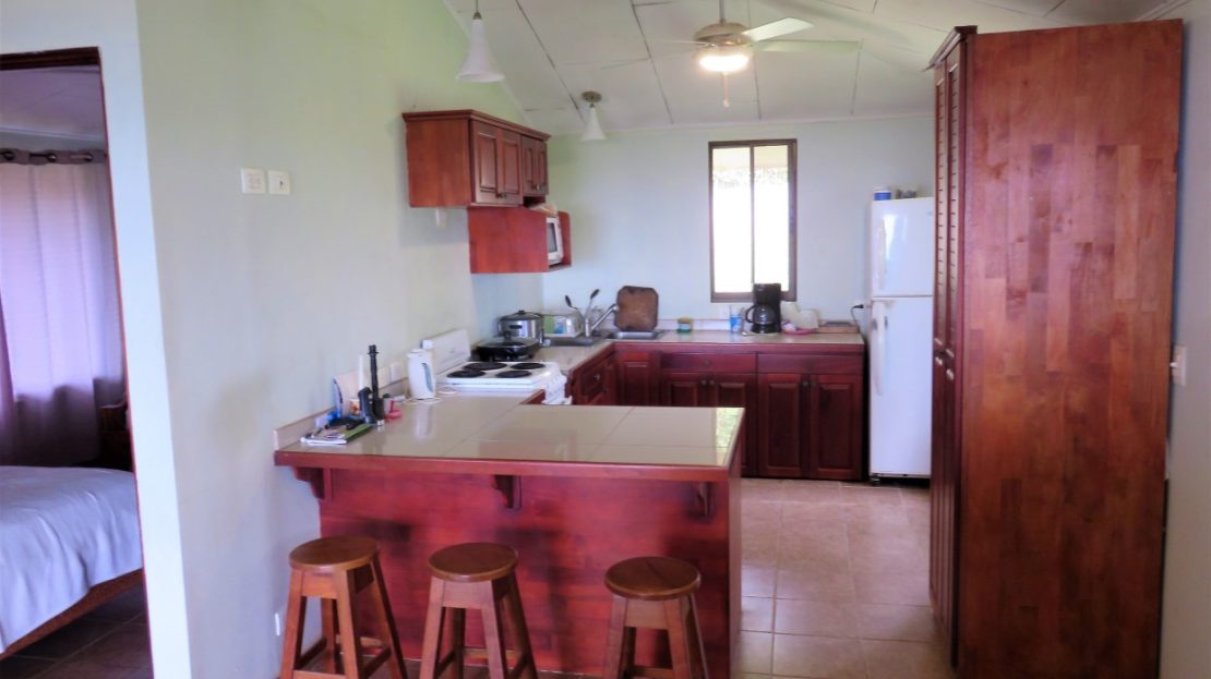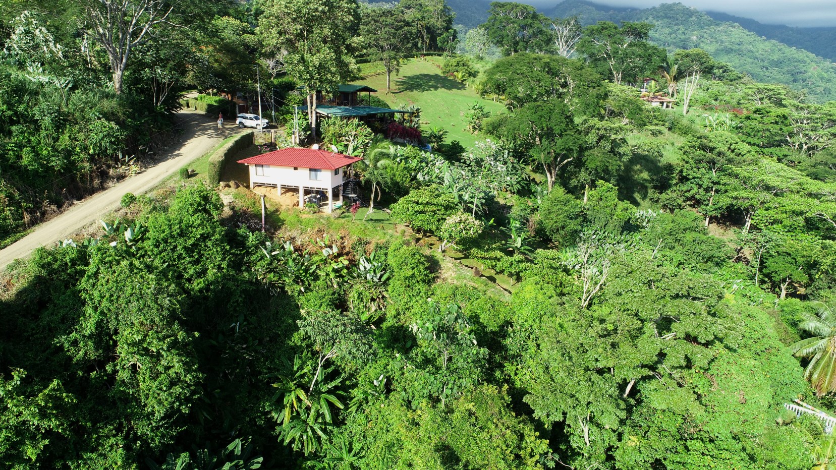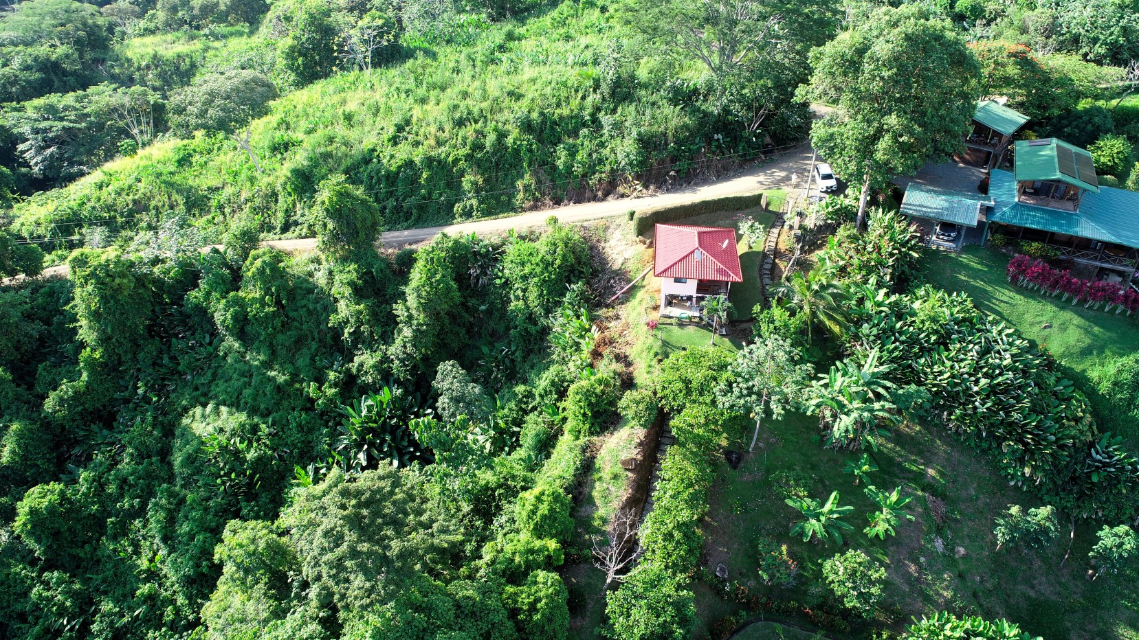 Casa Aracari is a 2 bedroom house with one of the most stunning views of the Pacific Ocean and rain forest in all of Ojochal. Situated at the top of a hill in a gated community , it is about 700 ft above sea level. Built on steel and concrete pillars, the living areas of the house are all on the second floor which allows you to look down on the birds flying and even into their nests. The sounds of nature totally surround you.The tiled outside patio overlooks Casa Aracari’s very large garden. From the patio, a front door leads you in to a living room and kitchen area. The kitchen has a built in breakfast bar with stools, a 4 burner electric stove/oven , a single door fridge/freezer and a microwave built into wooden wall shelving. To the left of the front door after entering there are 2 bedrooms and a bathroom. The Stunning View Bedroom with windows to the 200 degree Pacific view and rain forest valley literally directly below you; the full bathroom and the second bedroom which has room for a Queen bed and a single bed and has views of the virgin rain forest valley right below. Although originally built as a guest house, Casa Aracari was wired for possible expansion as it has a large ground floor area under the patio/living room that could be walled in and used as a third bedroom, an office or exercise room or laundry room. The laundry is currently done in the open area underneath the house which has a concrete floor and a laundry sized basin with hot and cold water.The house also has a fiber optic cable junction box less than 30 feet away so super high speed internet is available if needed. Otherwise internet can either come wirelessly from the ICE tower which is in direct sight 2 km away and has a 5 bar signal, or from Skyfiber, using a small dish.The gardens have everything from various flowers to mature banana, coconut and lemon trees. For the scarlet macaws that land within 30 ft of the balcony there are mature almond trees for them to feed on.There is also plenty of room to put in a swimming pool 20 feet away from the house & even room to dramatically expand the house or even build another house on the very large lot . Soil testing has been done to confirm the soil is good for building a pool and another house.Ojochal is renowned as the best culinary village in all of Costa Rica and the village has its own free-to-use library, soccer pitch and community hall where the farmers bring their fresh produce every week.The owners had planned to build a large outside patio all around the house plus a pool, but physical health issues have made them decide to sell.