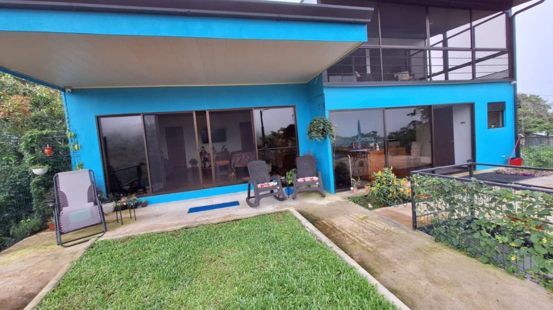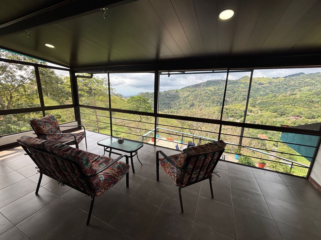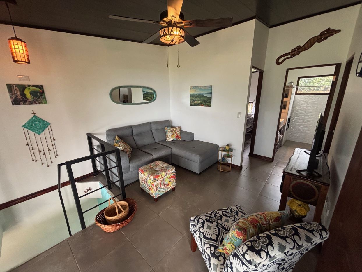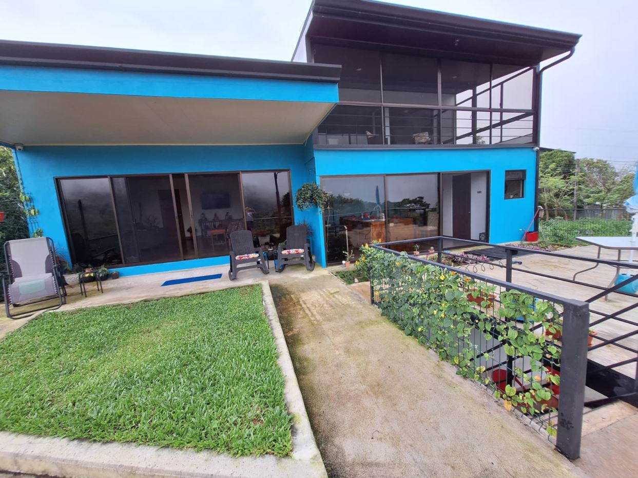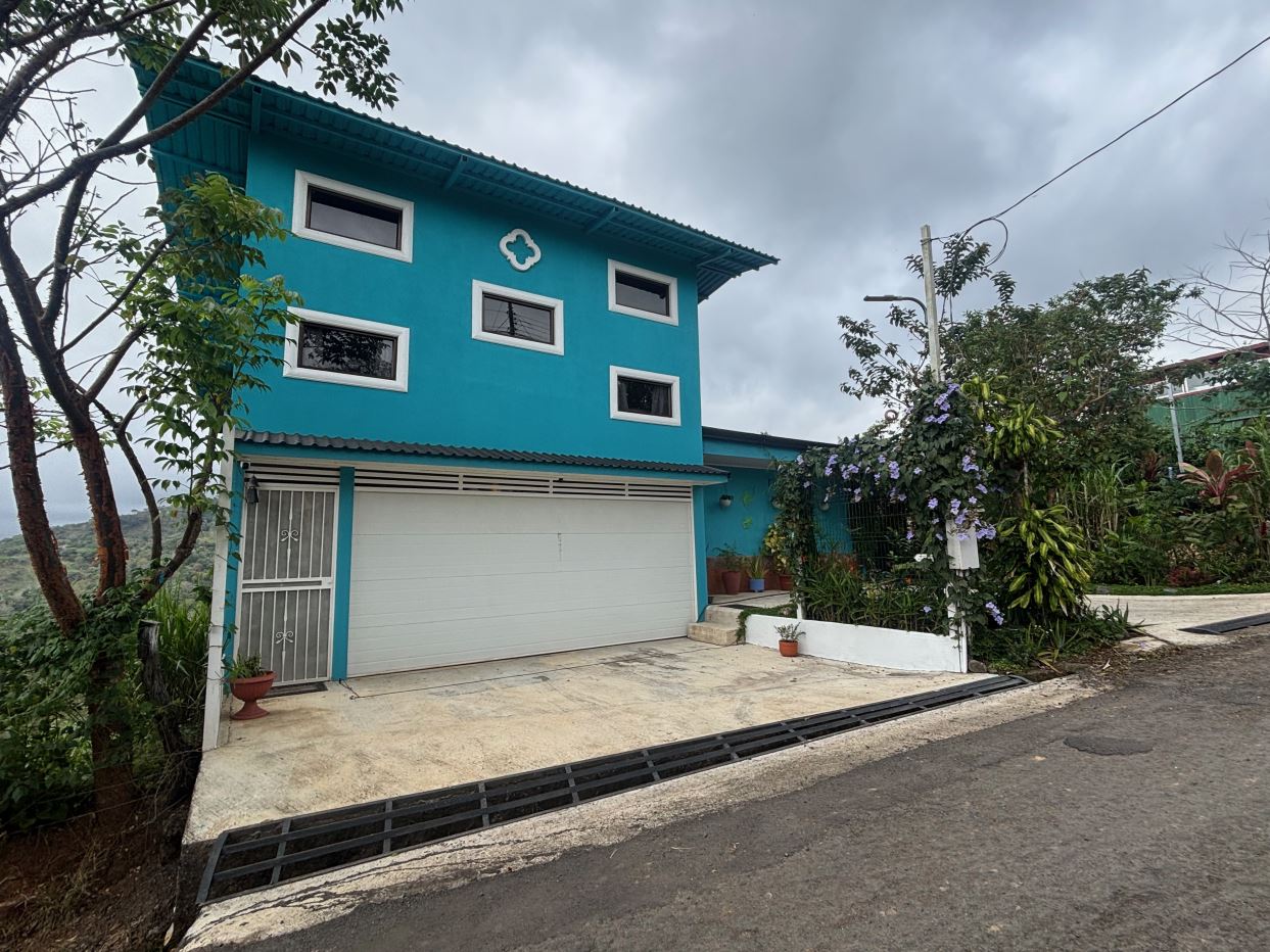 This unique style home is located in a quaint small neighborhood with big Pacific Ocean views and only 20 minutes from Atenas Center. Entering into the home one finds the living, kitchen and dinig area that leads to a downstairs main bedroom suite with on suite bathroom and small walk in closet. Adjacent to the kitchen is a half guest bath and a separate laundry area. Both of these areas feature access through the sliding glass doors to a large covered patio area with great views of the area mountains. Stairs lead downstairs to a bottom level covered deck that can serve for added storage or can be outfitted to serve as another area. Inside stairs lead to an upstairs added 3 bedrooms and 1 baths as well as an upper level screened in porch and inside living room. There is a 2-car garage and plenty of added room for added parking outside. All the furniture and appliances can be included in the negotiated price.