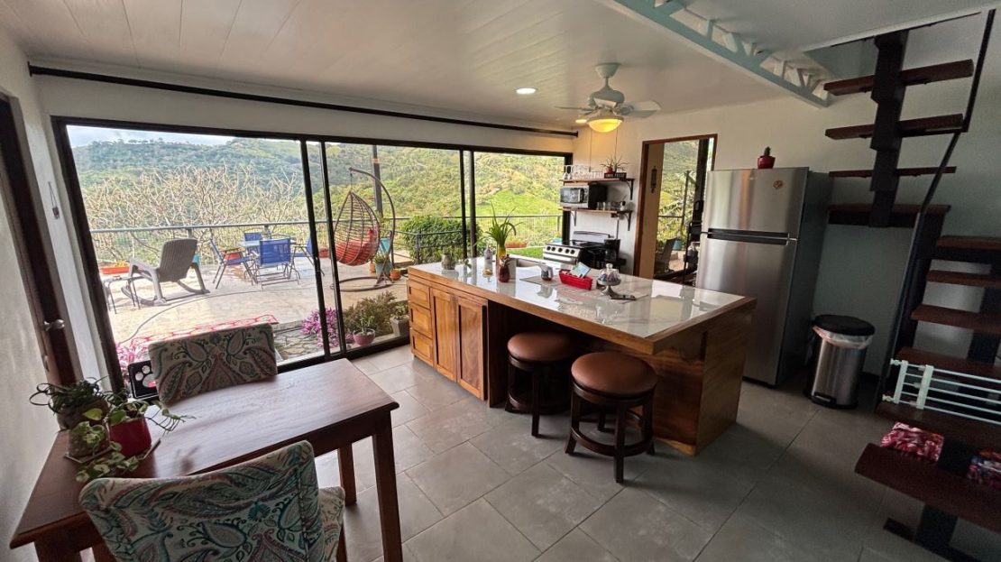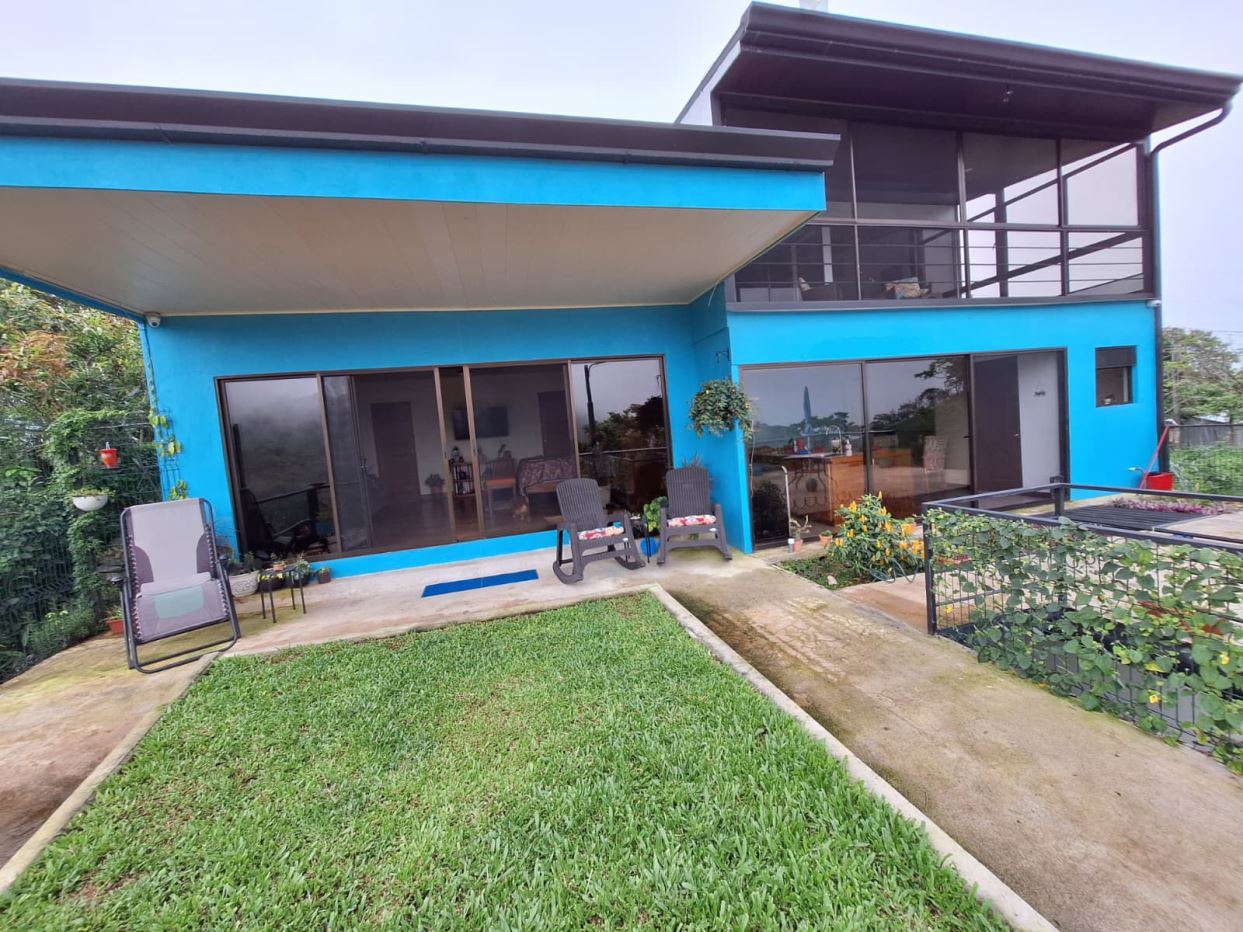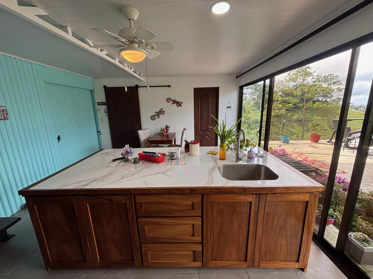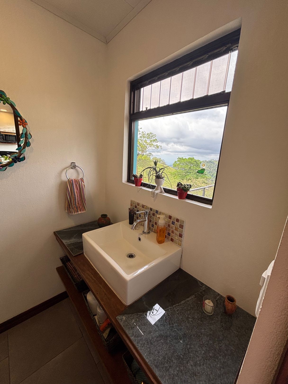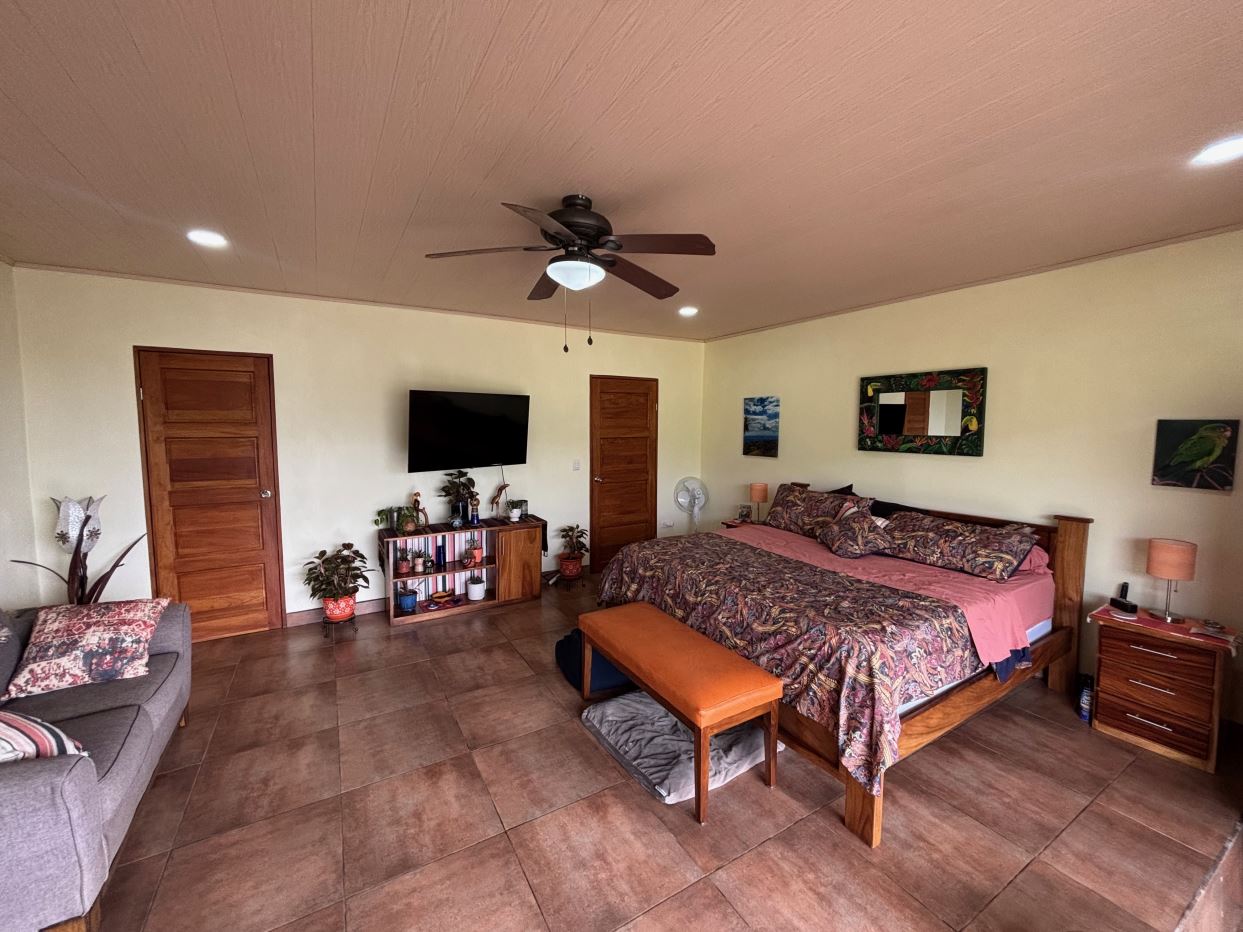 This unique style home is located in a quaint small neighborhood with big Pacific Ocean views and only 20 minutes from Atenas Center. Entering into the home one finds the living, kitchen and dinig area that leads to a downstairs main bedroom suite with on suite bathroom and small walk in closet. Adjacent to the kitchen is a half guest bath and a separate laundry area. Both of these areas feature access through the sliding glass doors to a large covered patio area with great views of the area mountains. Stairs lead downstairs to a bottom level covered deck that can serve for added storage or can be outfitted to serve as another area. Inside stairs lead to an upstairs added 3 bedrooms and 1 baths as well as an upper level screened in porch and inside living room. There is a 2-car garage and plenty of added room for added parking outside. All the furniture and appliances can be included in the negotiated price.