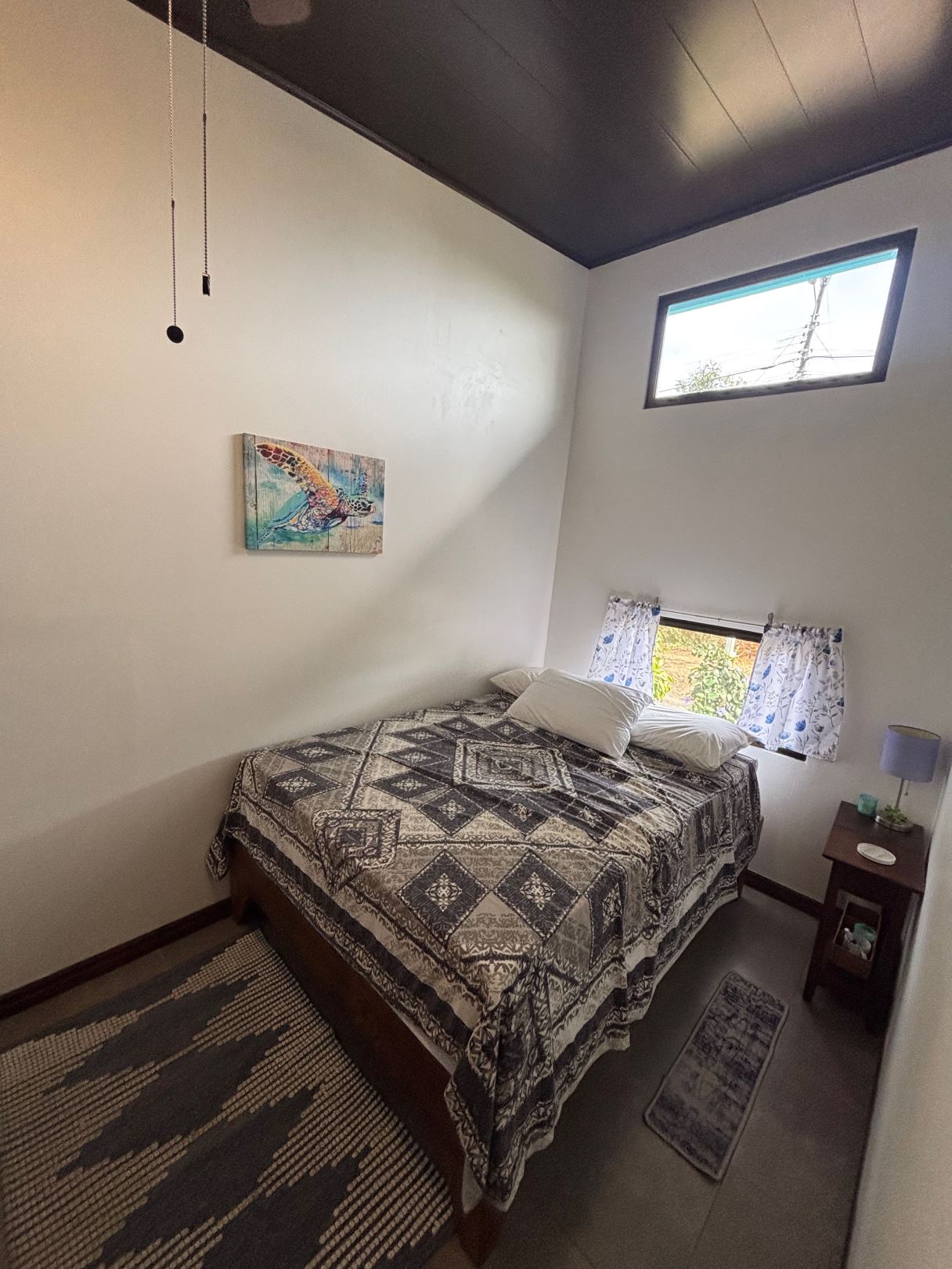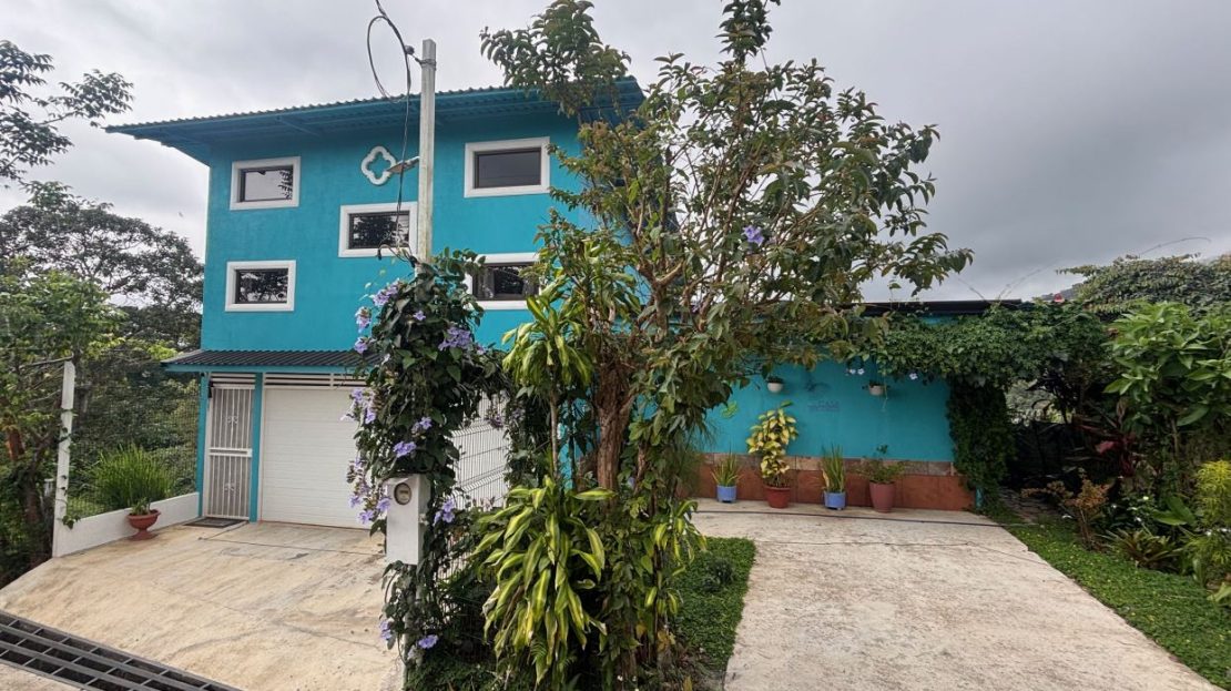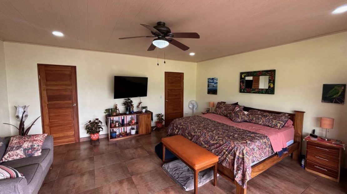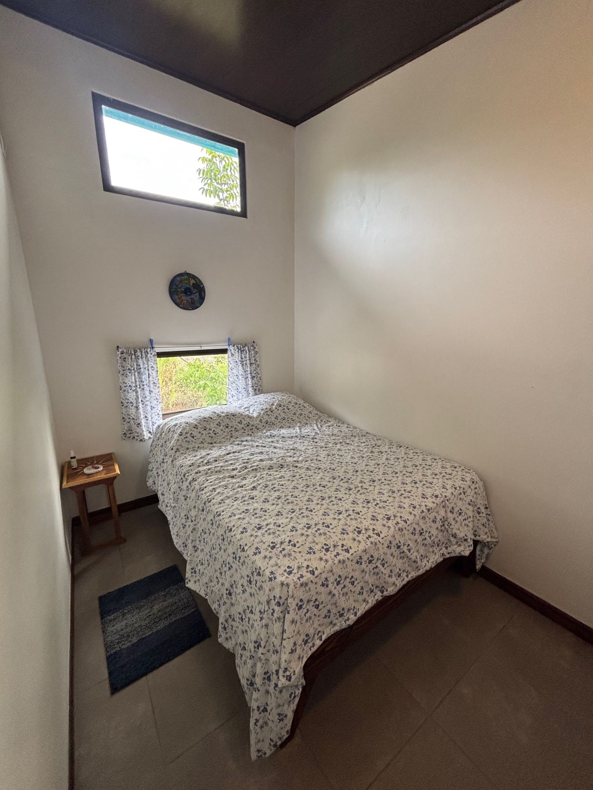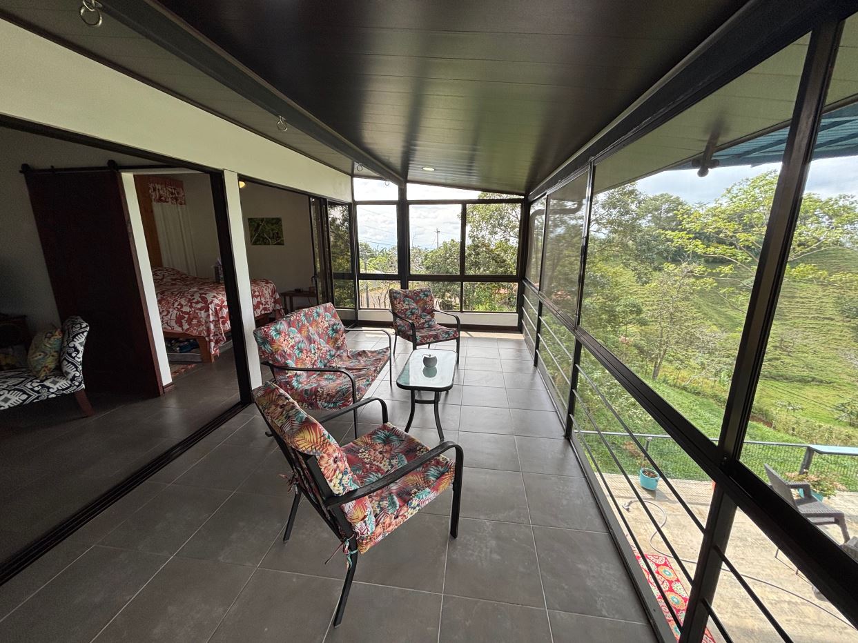 This unique style home is located in a quaint small neighborhood with big Pacific Ocean views and only 20 minutes from Atenas Center. Entering into the home one finds the living, kitchen and dinig area that leads to a downstairs main bedroom suite with on suite bathroom and small walk in closet. Adjacent to the kitchen is a half guest bath and a separate laundry area. Both of these areas feature access through the sliding glass doors to a large covered patio area with great views of the area mountains. Stairs lead downstairs to a bottom level covered deck that can serve for added storage or can be outfitted to serve as another area. Inside stairs lead to an upstairs added 3 bedrooms and 1 baths as well as an upper level screened in porch and inside living room. There is a 2-car garage and plenty of added room for added parking outside. All the furniture and appliances can be included in the negotiated price.