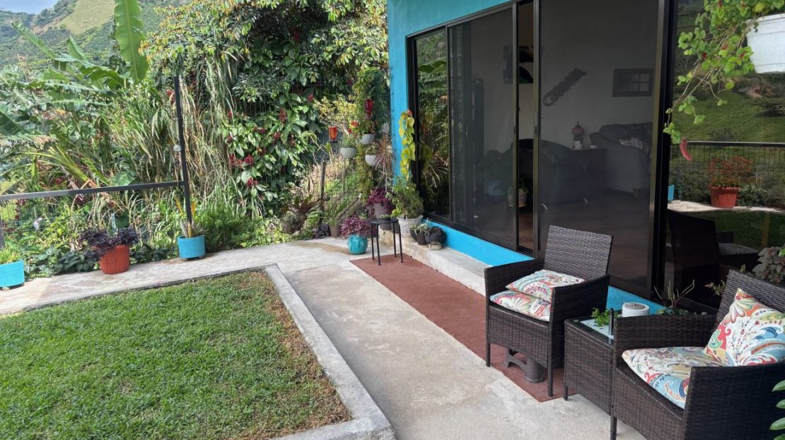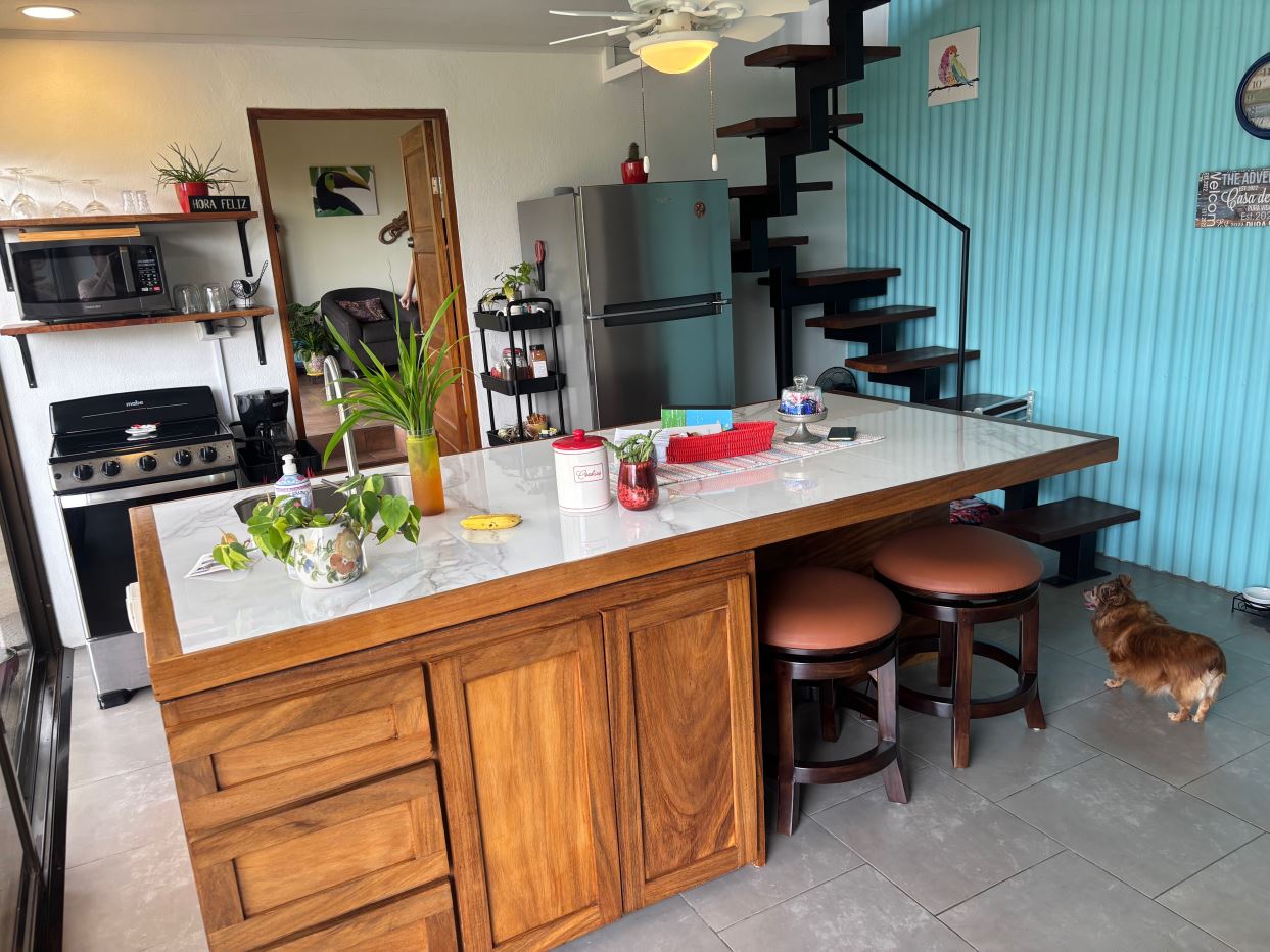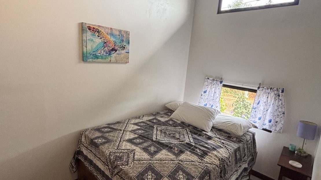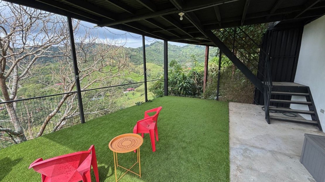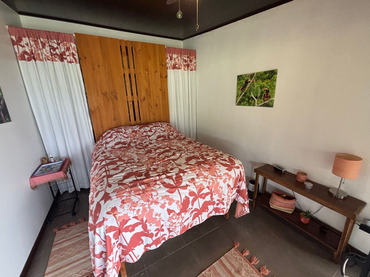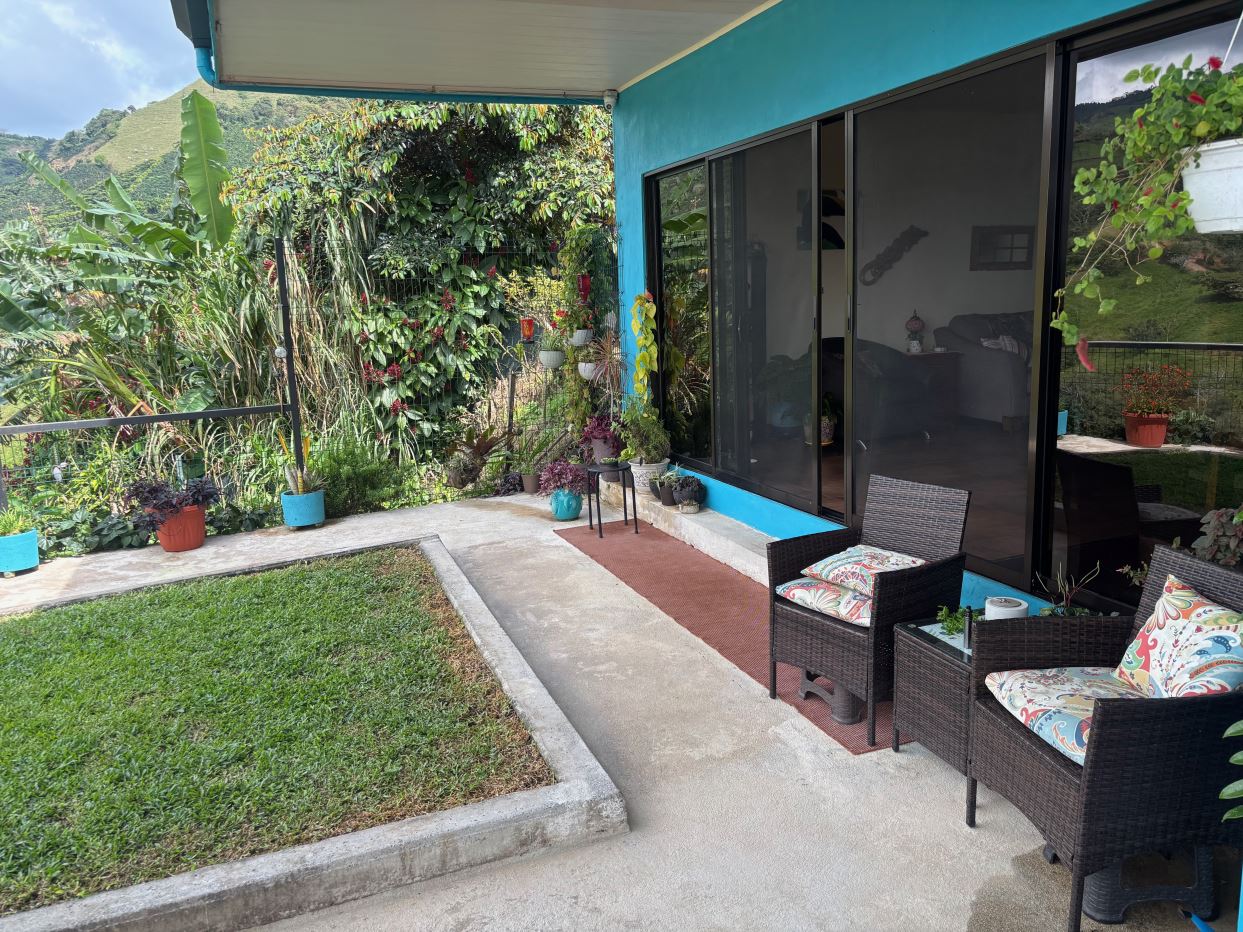 This unique style home is located in a quaint small neighborhood with big Pacific Ocean views and only 20 minutes from Atenas Center. Entering into the home one finds the living, kitchen and dinig area that leads to a downstairs main bedroom suite with on suite bathroom and small walk in closet. Adjacent to the kitchen is a half guest bath and a separate laundry area. Both of these areas feature access through the sliding glass doors to a large covered patio area with great views of the area mountains. Stairs lead downstairs to a bottom level covered deck that can serve for added storage or can be outfitted to serve as another area. Inside stairs lead to an upstairs added 3 bedrooms and 1 baths as well as an upper level screened in porch and inside living room. There is a 2-car garage and plenty of added room for added parking outside. All the furniture and appliances can be included in the negotiated price.