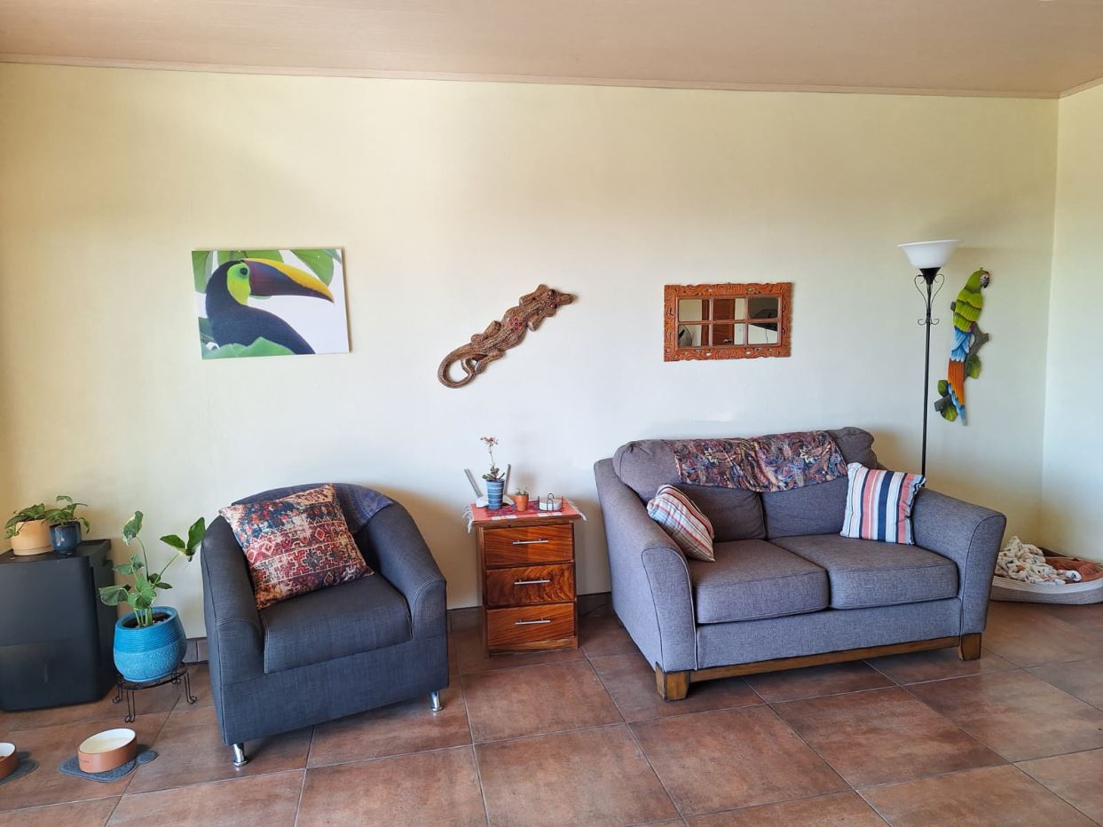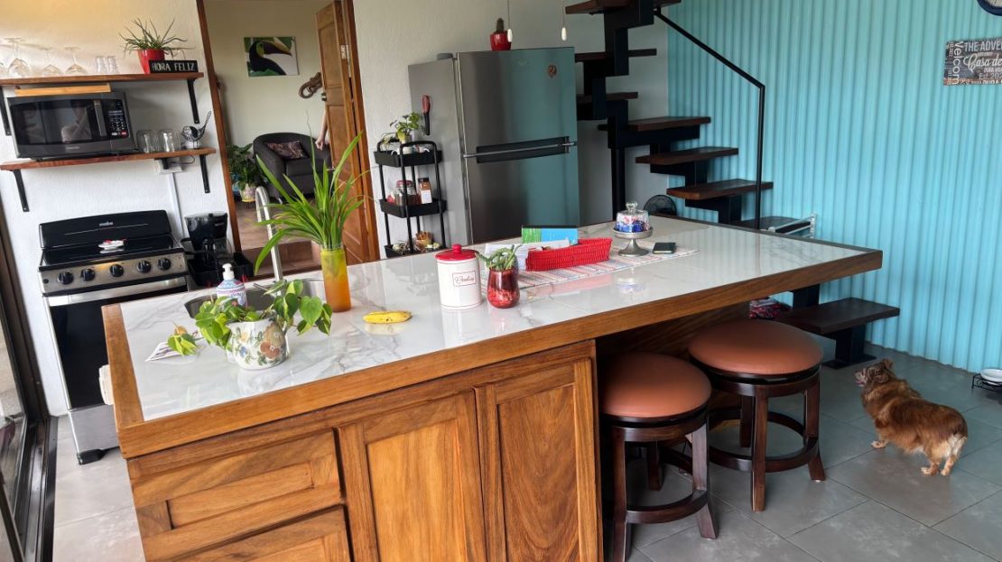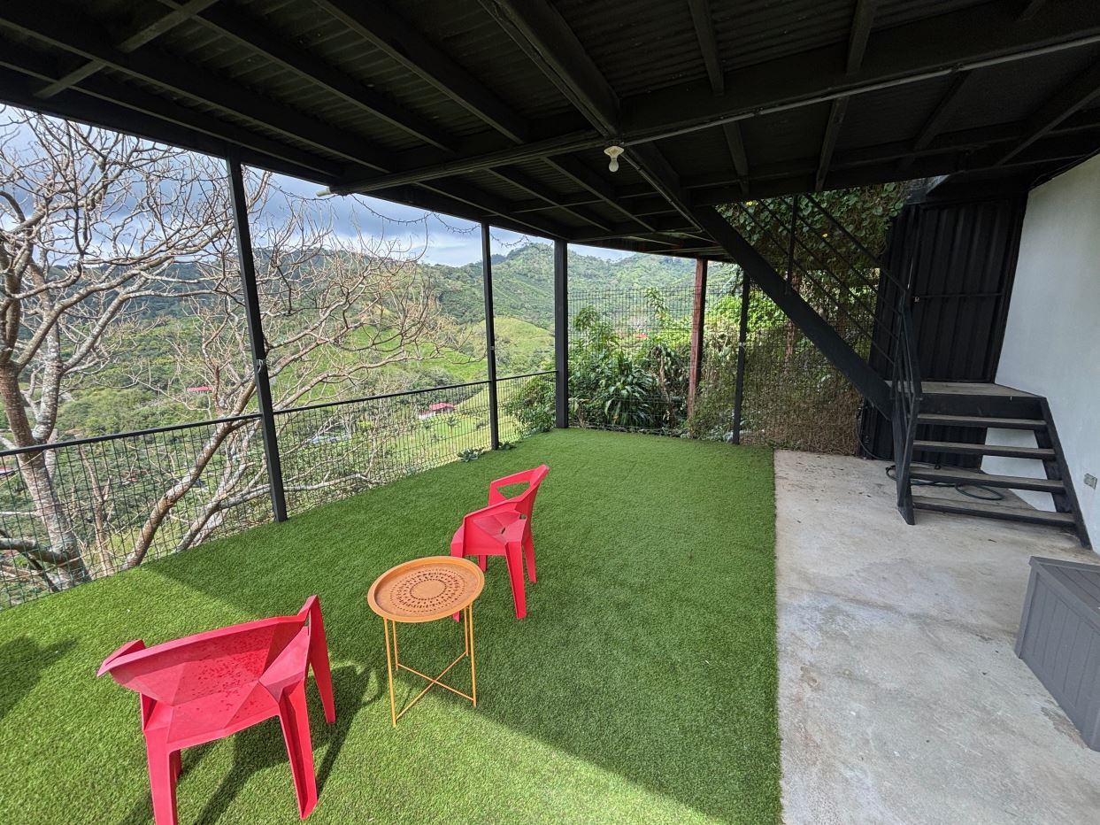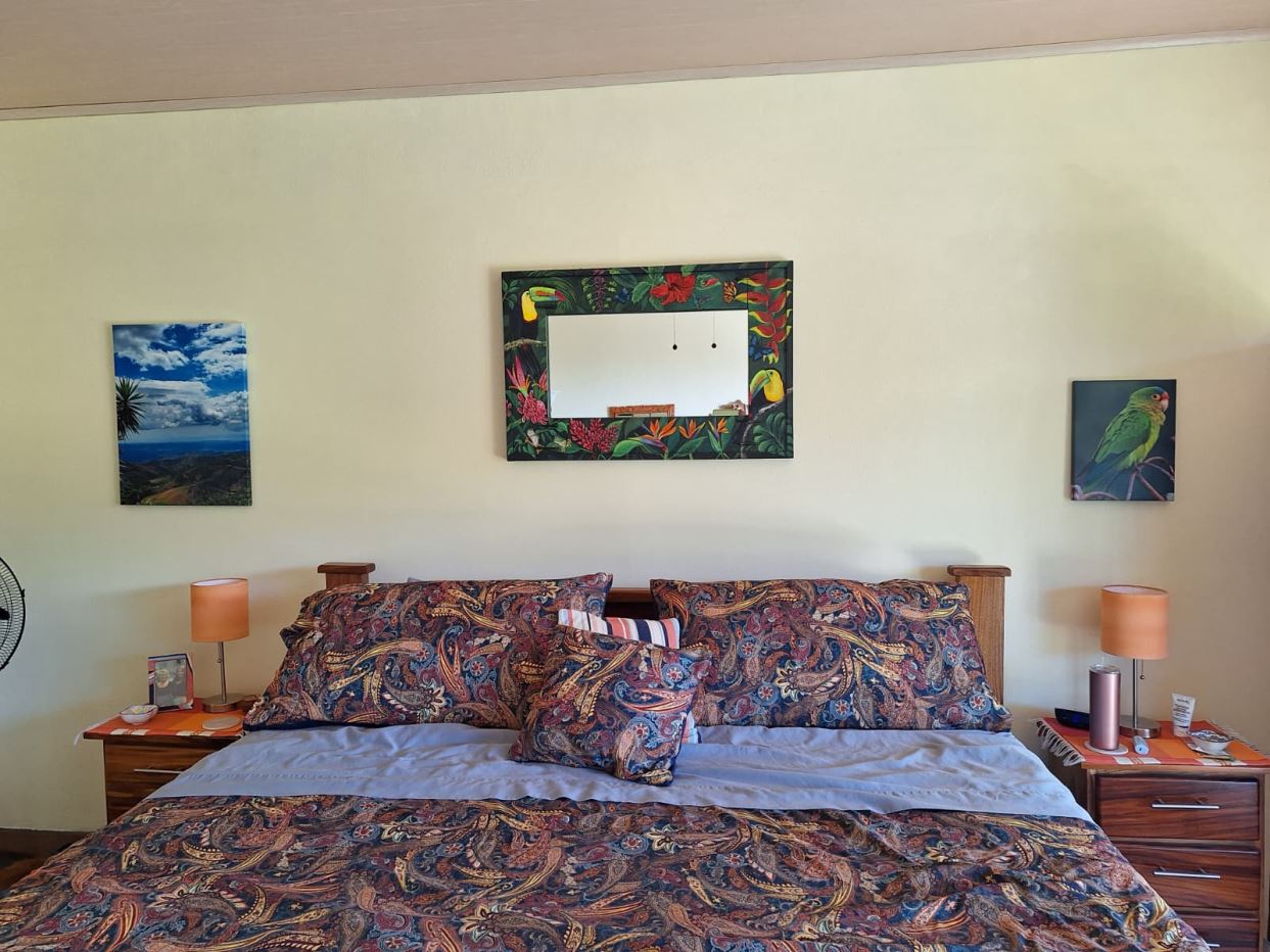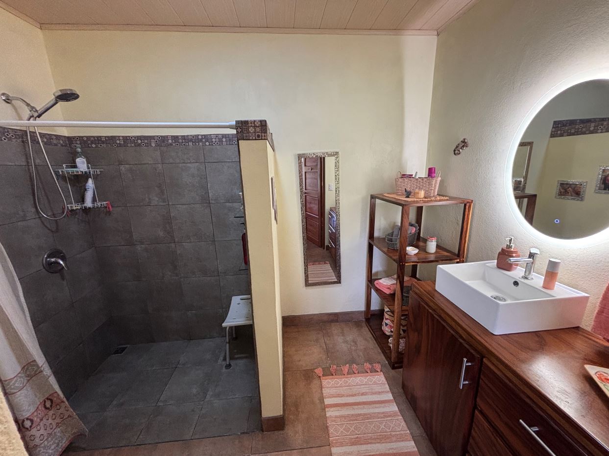 This unique style home is located in a quaint small neighborhood with big Pacific Ocean views and only 20 minutes from Atenas Center. Entering into the home one finds the living, kitchen and dinig area that leads to a downstairs main bedroom suite with on suite bathroom and small walk in closet. Adjacent to the kitchen is a half guest bath and a separate laundry area. Both of these areas feature access through the sliding glass doors to a large covered patio area with great views of the area mountains. Stairs lead downstairs to a bottom level covered deck that can serve for added storage or can be outfitted to serve as another area. Inside stairs lead to an upstairs added 3 bedrooms and 1 baths as well as an upper level screened in porch and inside living room. There is a 2-car garage and plenty of added room for added parking outside. All the furniture and appliances can be included in the negotiated price.