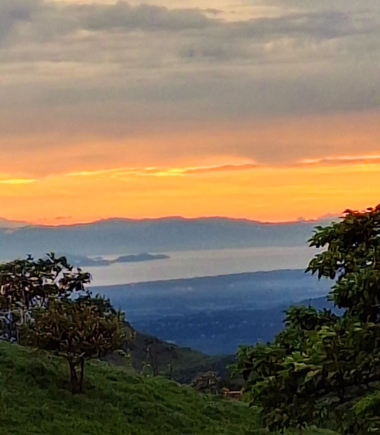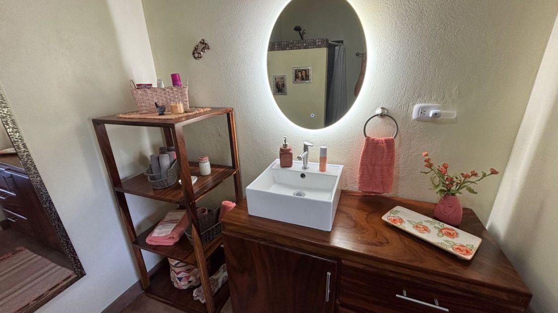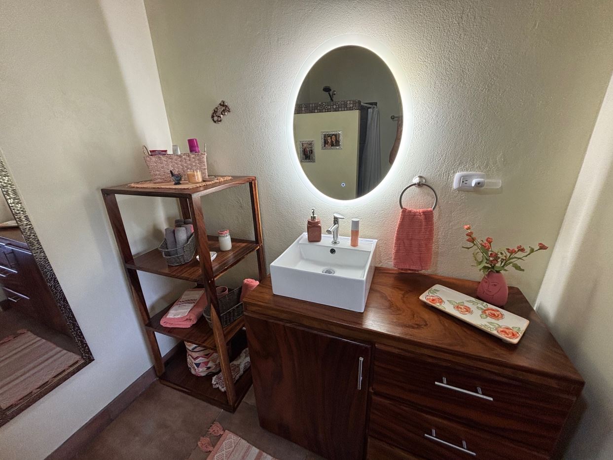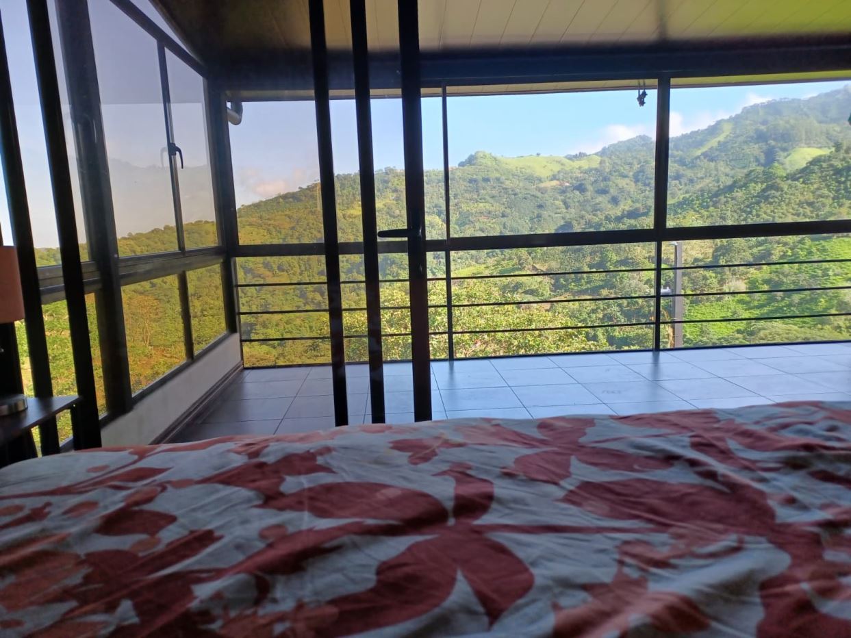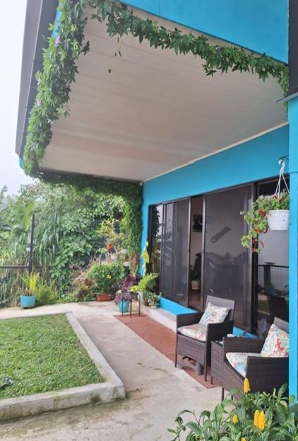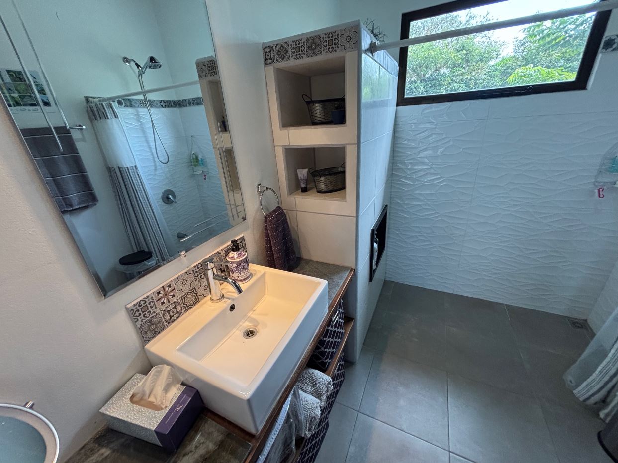 This unique style home is located in a quaint small neighborhood with big Pacific Ocean views and only 20 minutes from Atenas Center. Entering into the home one finds the living, kitchen and dinig area that leads to a downstairs main bedroom suite with on suite bathroom and small walk in closet. Adjacent to the kitchen is a half guest bath and a separate laundry area. Both of these areas feature access through the sliding glass doors to a large covered patio area with great views of the area mountains. Stairs lead downstairs to a bottom level covered deck that can serve for added storage or can be outfitted to serve as another area. Inside stairs lead to an upstairs added 3 bedrooms and 1 baths as well as an upper level screened in porch and inside living room. There is a 2-car garage and plenty of added room for added parking outside. All the furniture and appliances can be included in the negotiated price.