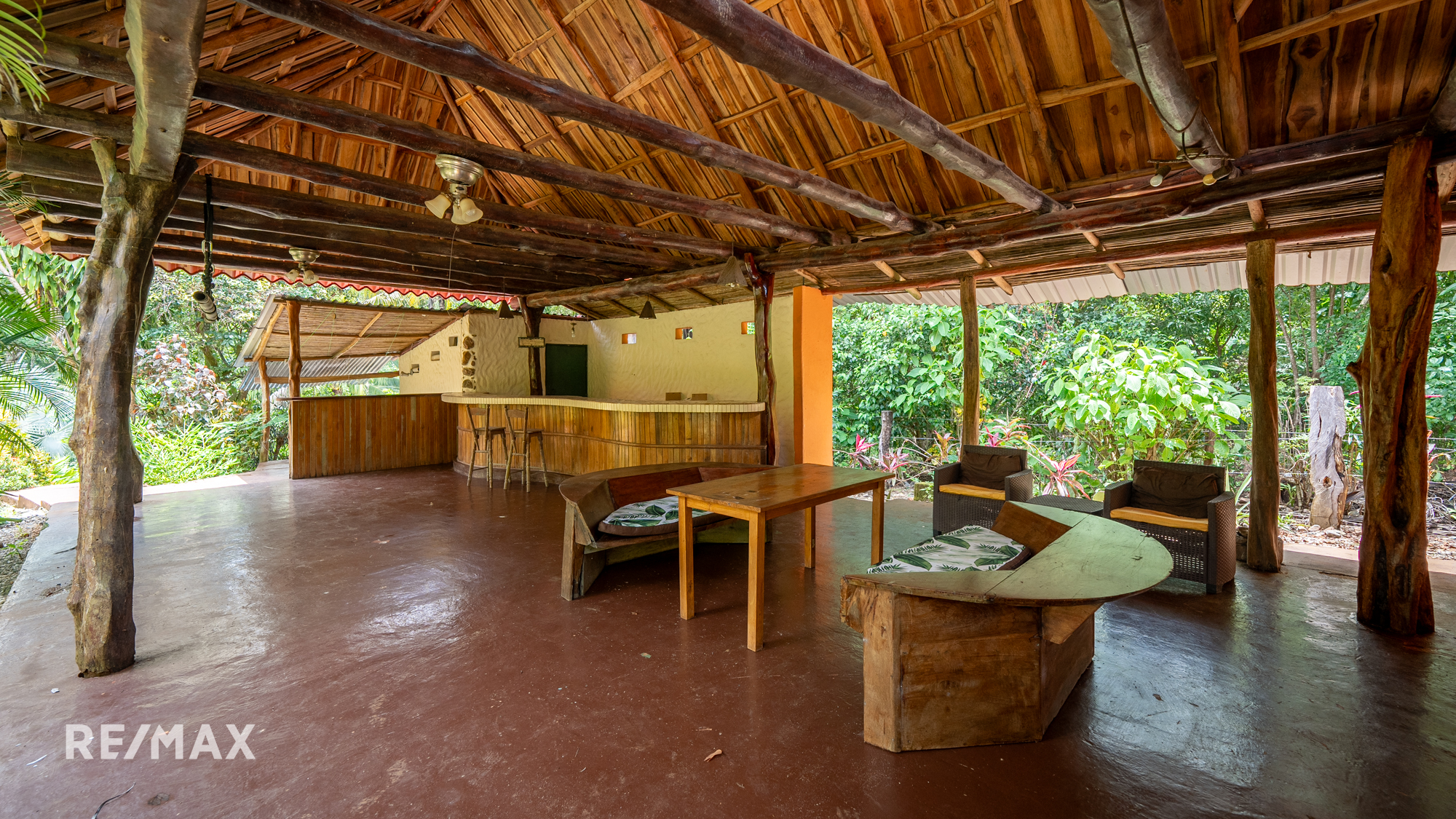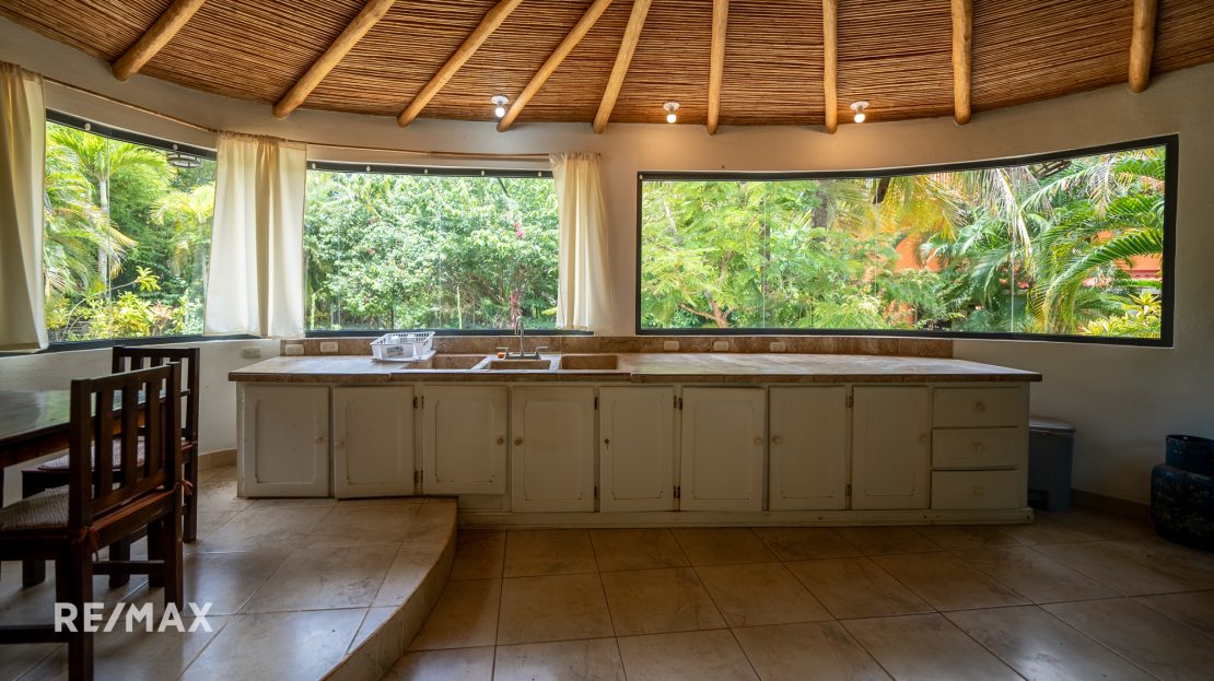 The main house serves as the heart of the estate, featuring an open living area and a spacious kitchen, filled with natural light from large windows overlooking the lush surroundings. Adjacent to the main house is a large outdoor rancho, offering a versatile space that can be used for events, dining, or as a communal area for retreat activities.
