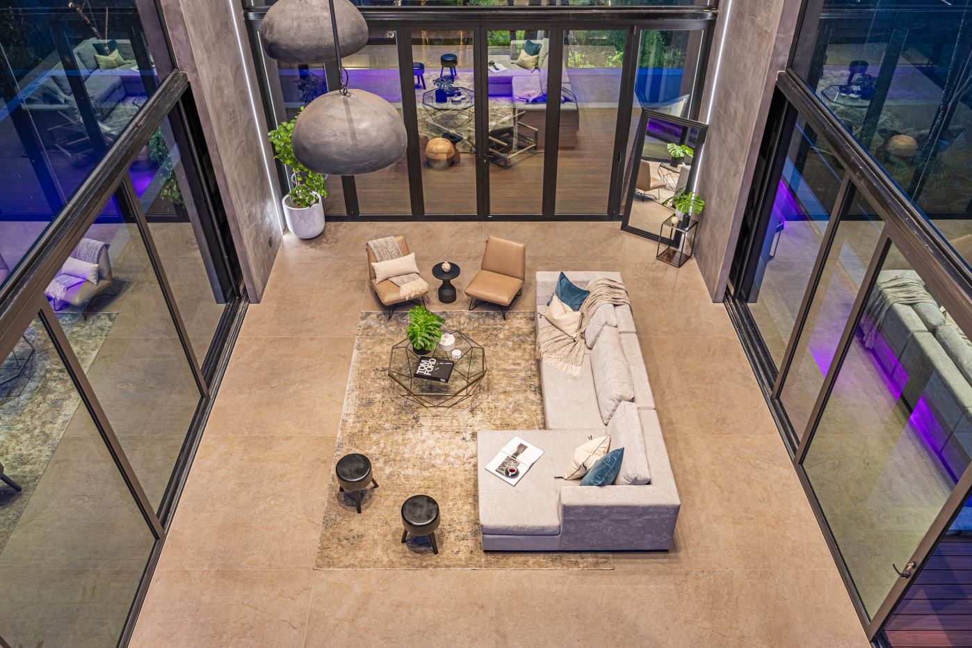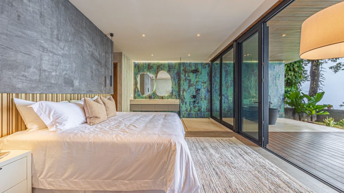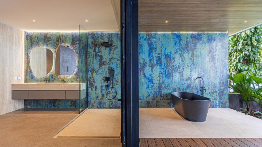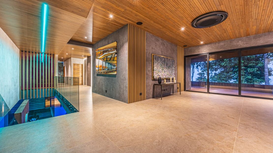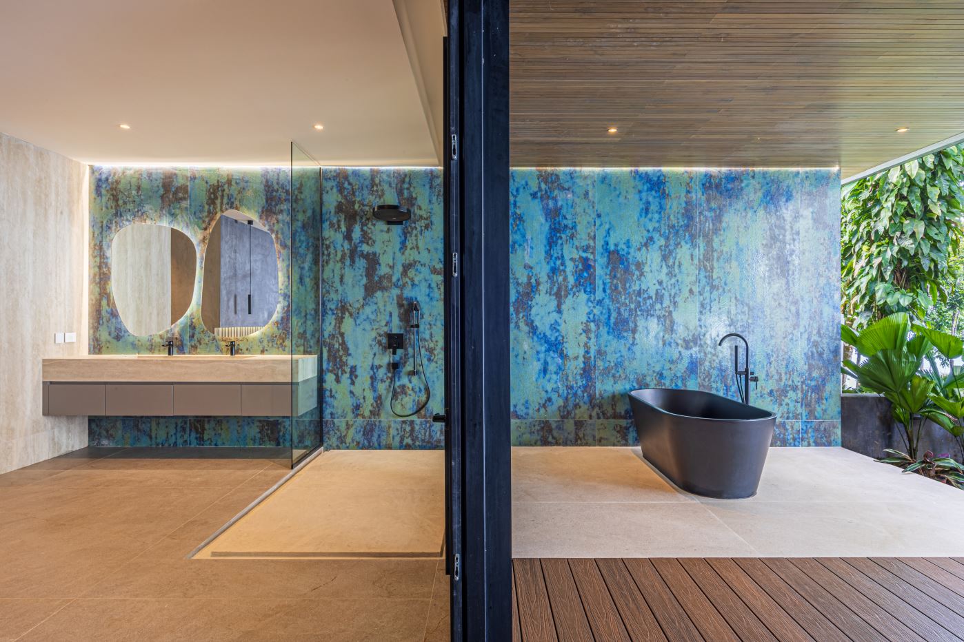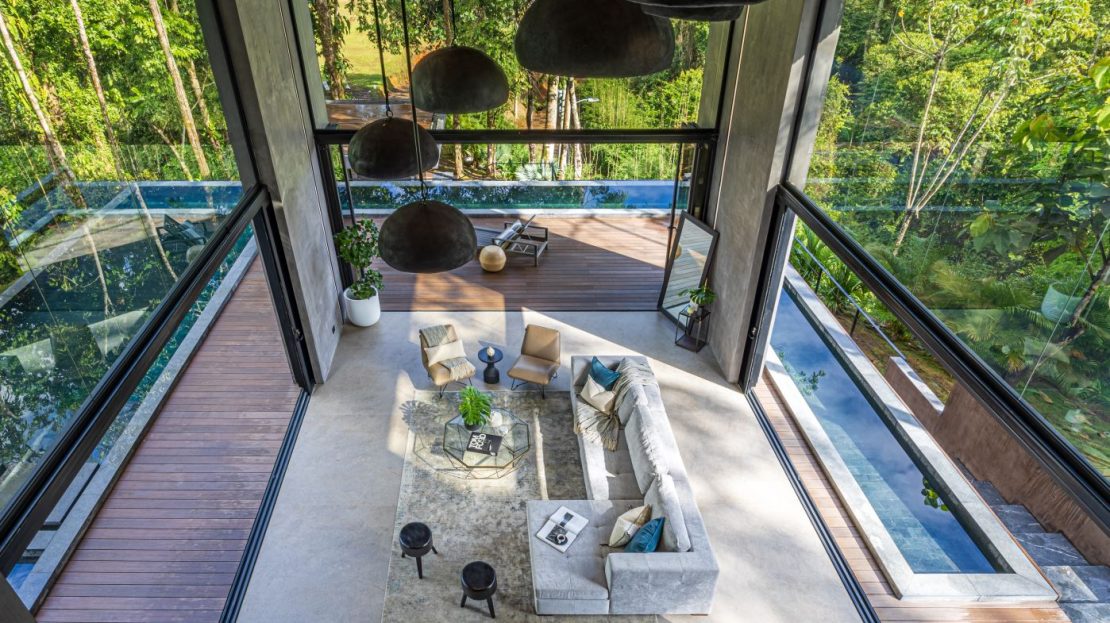 The grand living room is a highlight of the home, featuring soaring three-story-high ceilings and panoramic views that create the sensation of being immersed in the jungle canopy. Just steps away, the Balinese-tiled infinity pool wraps around the living spaces, offering a seamless transition between indoor and outdoor living.