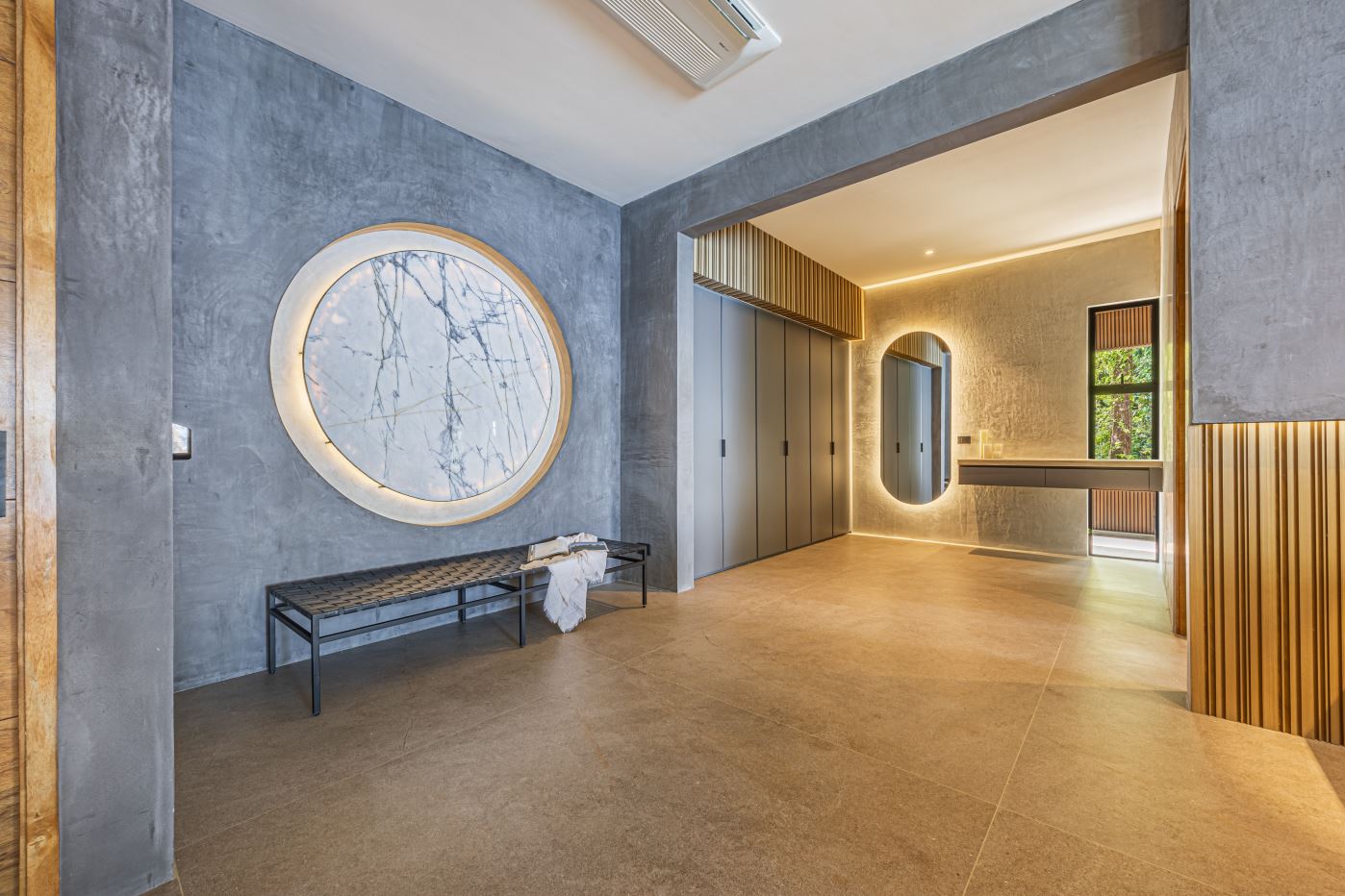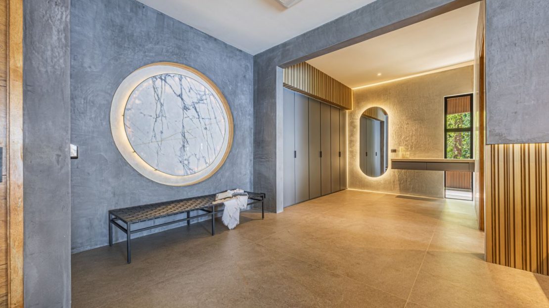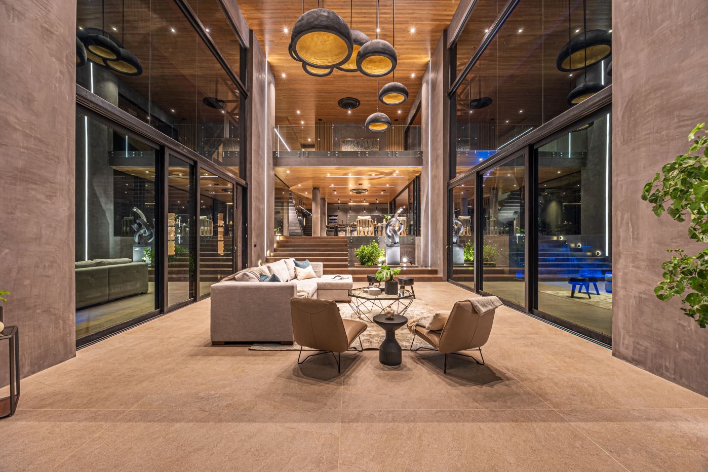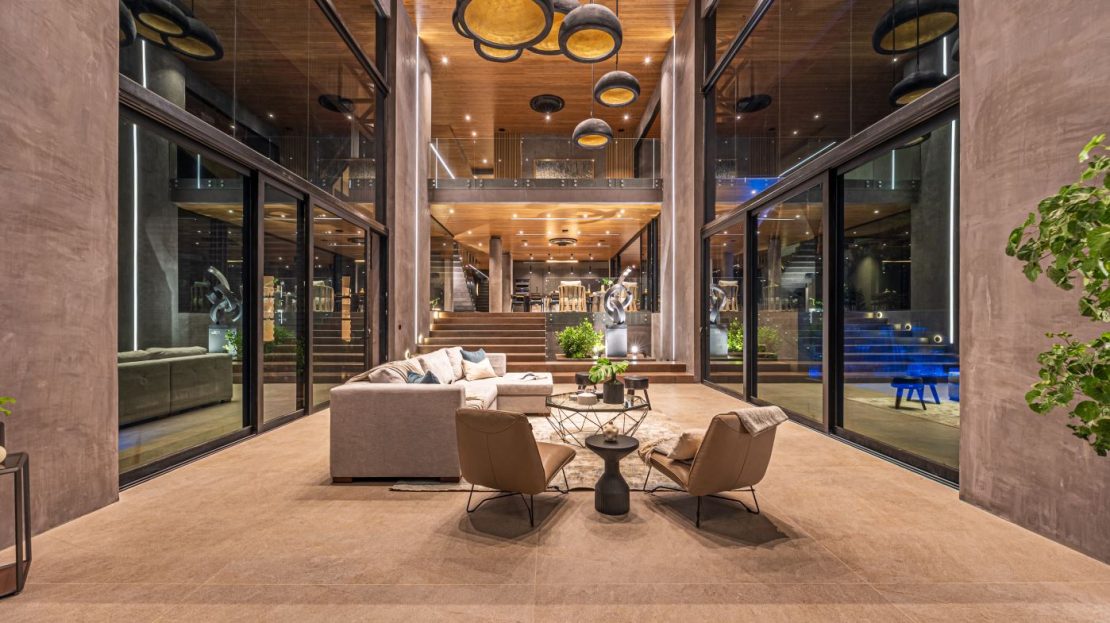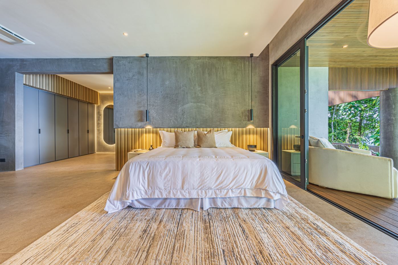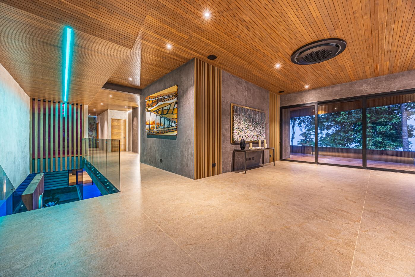 The grand living room is a highlight of the home, featuring soaring three-story-high ceilings and panoramic views that create the sensation of being immersed in the jungle canopy. Just steps away, the Balinese-tiled infinity pool wraps around the living spaces, offering a seamless transition between indoor and outdoor living.