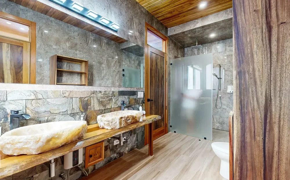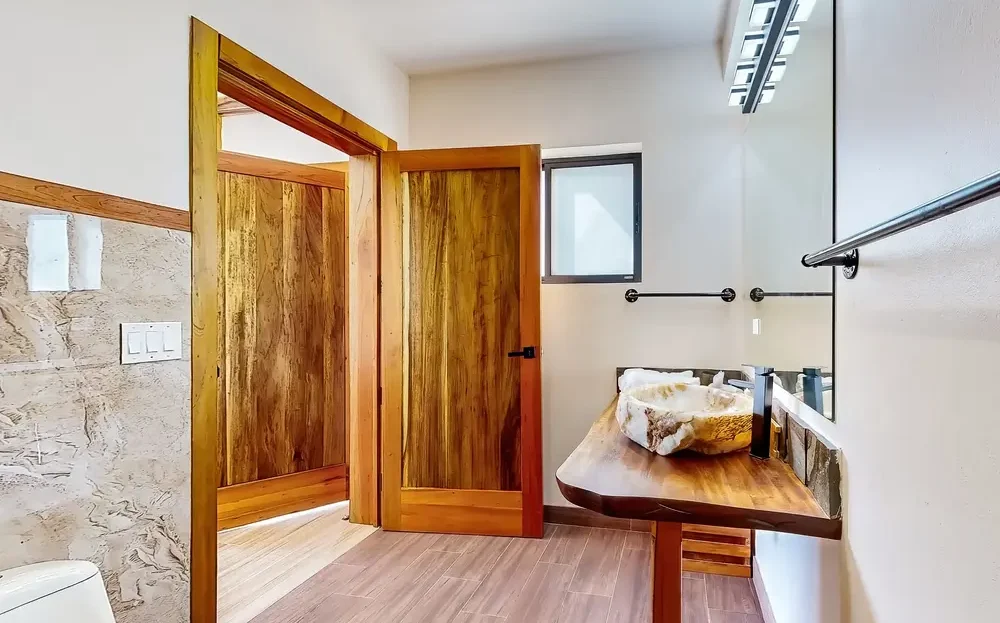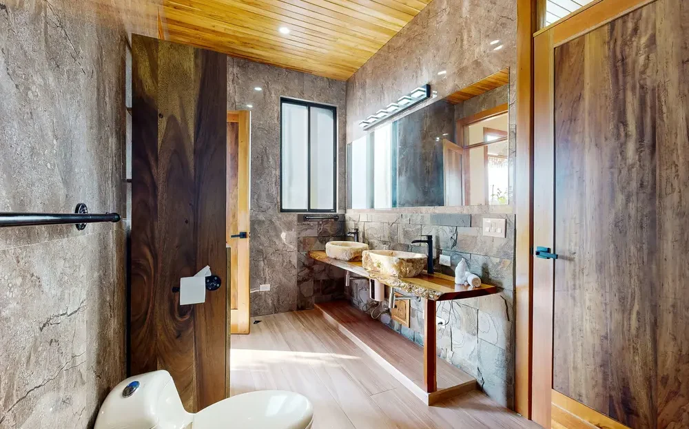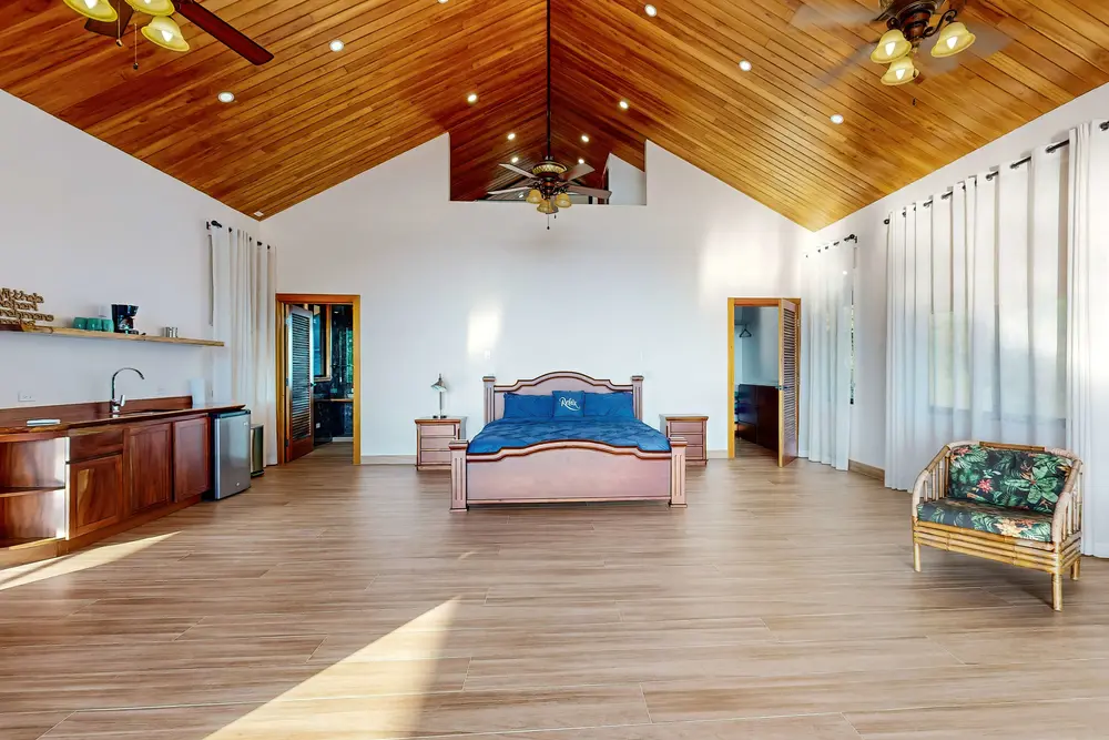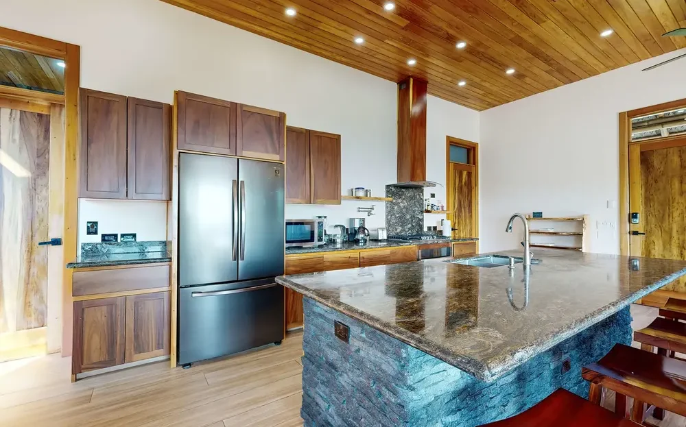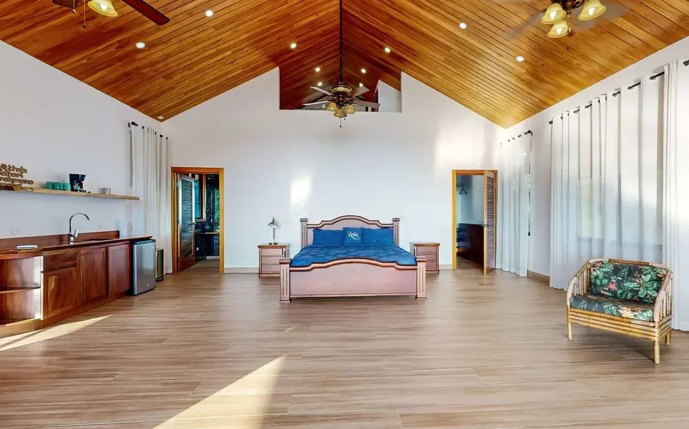 Ascending to the second floor, you’ll discover a sophisticated living space bathed in natural light. The ocean views are framed by sliding glass windows, providing a breathtaking backdrop to the tastefully furnished interior. The kitchen is primed for anyone who loves preparing delicious meals, featuring a large island, granite countertops, and a walk-in pantry. The full bathroom is completed with quartz sinks, natural wood counter top and slate stone. The junior suite is a spacious bedroom which can sleep 4 and features ambient inlaid lighting. This floor also boasts a convenient driveway for easy access, ensuring a hassle-free arrival with groceries or luggage.