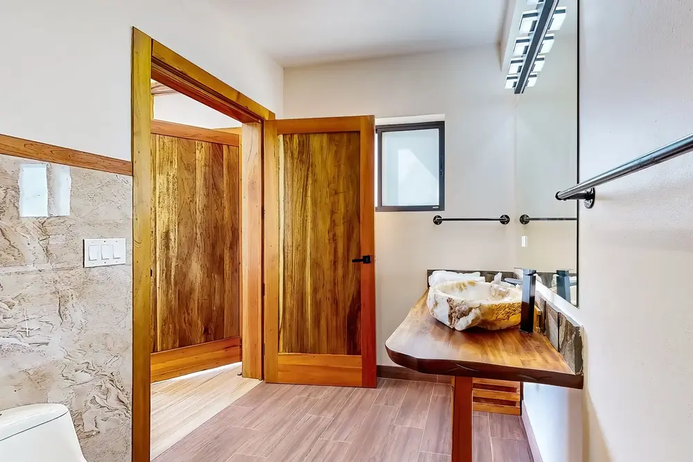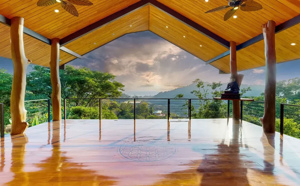 The third floor is completely dedicated to the spacious master suite, a haven of luxury and serenity, with vaulted teak ceiling and sliding glass doors which open onto the ocean view yoga deck. The en suite bathroom features duel sinks and beautiful natural wood touches. Through the walk in closet is found the loft, with a queen-sized bed and a half bath, complemented by it’s own private deck. The yoga deck is crafted from teak, adorned with the Flower of Life symbol, and offers a tranquil space for private yoga sessions while embracing the soothing sounds of the surrounding nature and the refreshing breeze.