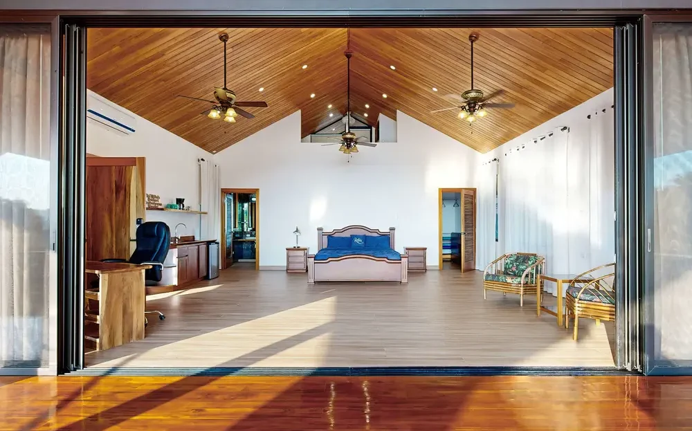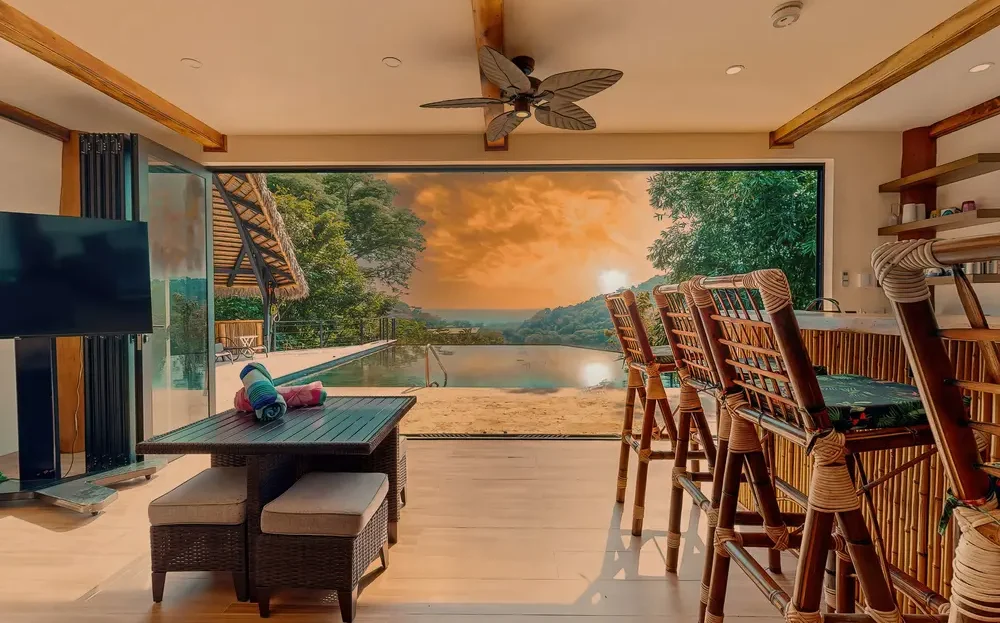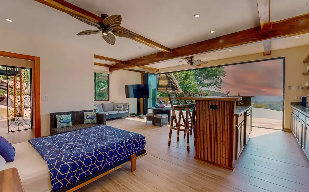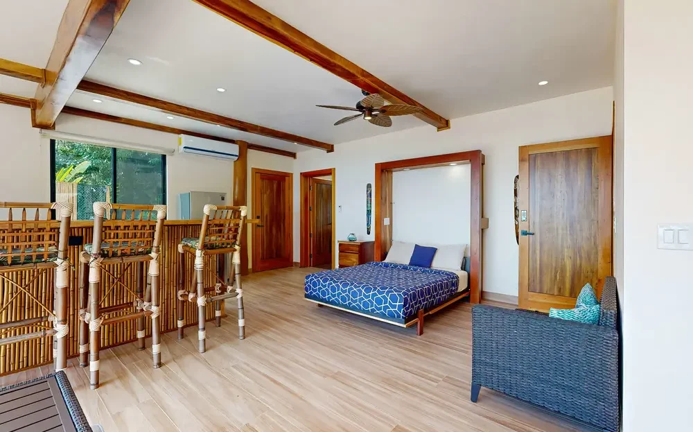 The first floor presents a versatile studio apartment, complete with a full-size murphy bed for efficient space utilization. The kitchen, adorned with a live edge bar and custom bamboo stools, is equipped with modern appliances, creating a space that is completely self sufficient for guests. The accordion sliding glass doors open onto the outdoor Palapa with Palmex roof and the infinity pool, all of which overlook the Pacific Ocean and the emerald green mountains.