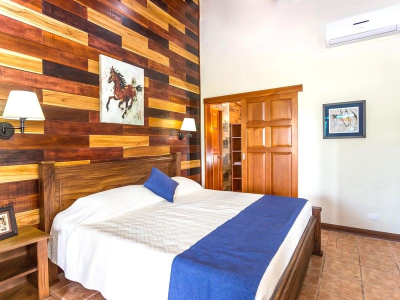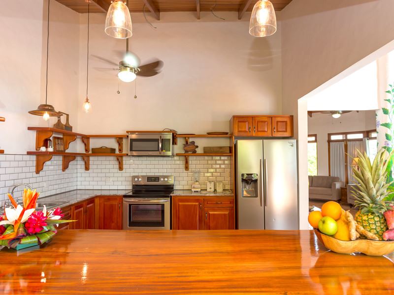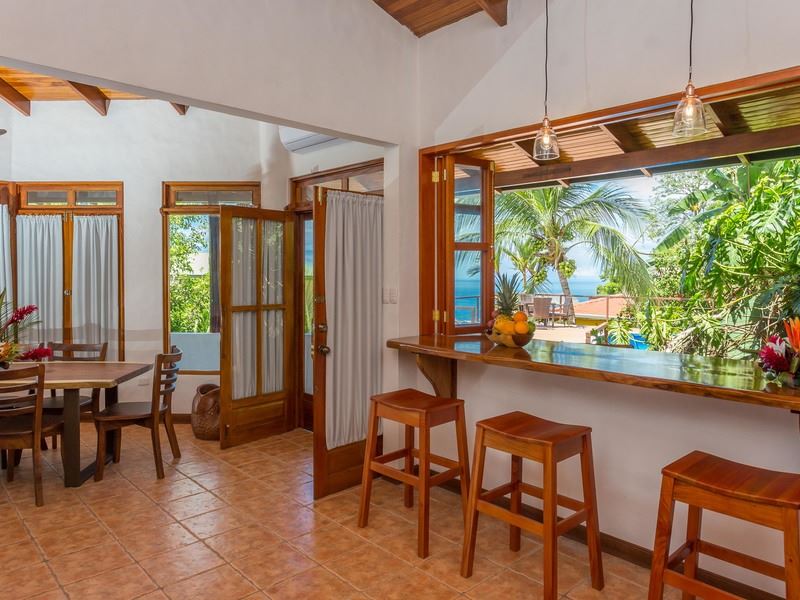 The main level of this villa boasts soaring cathedral ceilings and a spacious open floor plan, featuring expansive covered balconies perfect for enjoying the vibrant wildlife and breathtaking ocean vistas. The kitchen is equipped with custom wooden cabinetry and ample space, complemented by stainless steel appliances and a convenient breakfast bar that opens to the outdoor BBQ area through bi-fold windows—ideal for sunny days by the pool. A formal dining area adjacent to the kitchen comfortably seats eight guests. The inviting living area includes plush sofas and a large flat-screen TV, along with a full bathroom for added convenience. The master bedroom offers a king-sized bed, high ceilings, and an abundance of natural light, complete with an ensuite bathroom.
